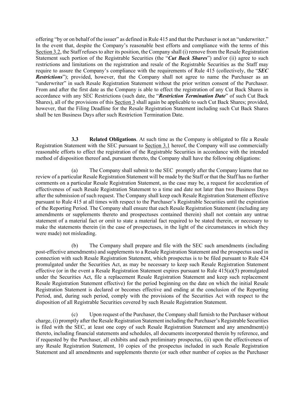 offering “by or on behalf of the issuer” as defined in Rule 415 and that the Purchaser is not an “underwriter.” In the event that, despite the Company’s reasonable best efforts and compliance with the terms of this Section 3.2, the Staff refuses to alter its position, the Company shall (i) remove from the Resale Registration Statement such portion of the Registrable Securities (the “Cut Back Shares”) and/or (ii) agree to such restrictions and limitations on the registration and resale of the Registrable Securities as the Staff may require to assure the Company’s compliance with the requirements of Rule 415 (collectively, the “SEC Restrictions”); provided, however, that the Company shall not agree to name the Purchaser as an “underwriter” in such Resale Registration Statement without the prior written consent of the Purchaser. From and after the first date as the Company is able to effect the registration of any Cut Back Shares in accordance with any SEC Restrictions (such date, the “Restriction Termination Date” of such Cut Back Shares), all of the provisions of this Section 3 shall again be applicable to such Cut Back Shares; provided, however, that the Filing Deadline for the Resale Registration Statement including such Cut Back Shares shall be ten Business Days after such Restriction Termination Date. 3.3 Related Obligations. At such time as the Company is obligated to file a Resale Registration Statement with the SEC pursuant to Section 3.1 hereof, the Company will use commercially reasonable efforts to effect the registration of the Registrable Securities in accordance with the intended method of disposition thereof and, pursuant thereto, the Company shall have the following obligations: (a) The Company shall submit to the SEC promptly after the Company learns that no review of a particular Resale Registration Statement will be made by the Staff or that the Staff has no further comments on a particular Resale Registration Statement, as the case may be, a request for acceleration of effectiveness of such Resale Registration Statement to a time and date not later than two Business Days after the submission of such request. The Company shall keep each Resale Registration Statement effective pursuant to Rule 415 at all times with respect to the Purchaser’s Registrable Securities until the expiration of the Reporting Period. The Company shall ensure that each Resale Registration Statement (including any amendments or supplements thereto and prospectuses contained therein) shall not contain any untrue statement of a material fact or omit to state a material fact required to be stated therein, or necessary to make the statements therein (in the case of prospectuses, in the light of the circumstances in which they were made) not misleading. (b) The Company shall prepare and file with the SEC such amendments (including post-effective amendments) and supplements to a Resale Registration Statement and the prospectus used in connection with such Resale Registration Statement, which prospectus is to be filed pursuant to Rule 424 promulgated under the Securities Act, as may be necessary to keep such Resale Registration Statement effective (or in the event a Resale Registration Statement expires pursuant to Rule 415(a)(5) promulgated under the Securities Act, file a replacement Resale Registration Statement and keep such replacement Resale Registration Statement effective) for the period beginning on the date on which the initial Resale Registration Statement is declared or becomes effective and ending at the conclusion of the Reporting Period, and, during such period, comply with the provisions of the Securities Act with respect to the disposition of all Registrable Securities covered by such Resale Registration Statement. (c) Upon request of the Purchaser, the Company shall furnish to the Purchaser without charge, (i) promptly after the Resale Registration Statement including the Purchaser’s Registrable Securities is filed with the SEC, at least one copy of such Resale Registration Statement and any amendment(s) thereto, including financial statements and schedules, all documents incorporated therein by reference, and if requested by the Purchaser, all exhibits and each preliminary prospectus, (ii) upon the effectiveness of any Resale Registration Statement, 10 copies of the prospectus included in such Resale Registration Statement and all amendments and supplements thereto (or such other number of copies as the Purchaser