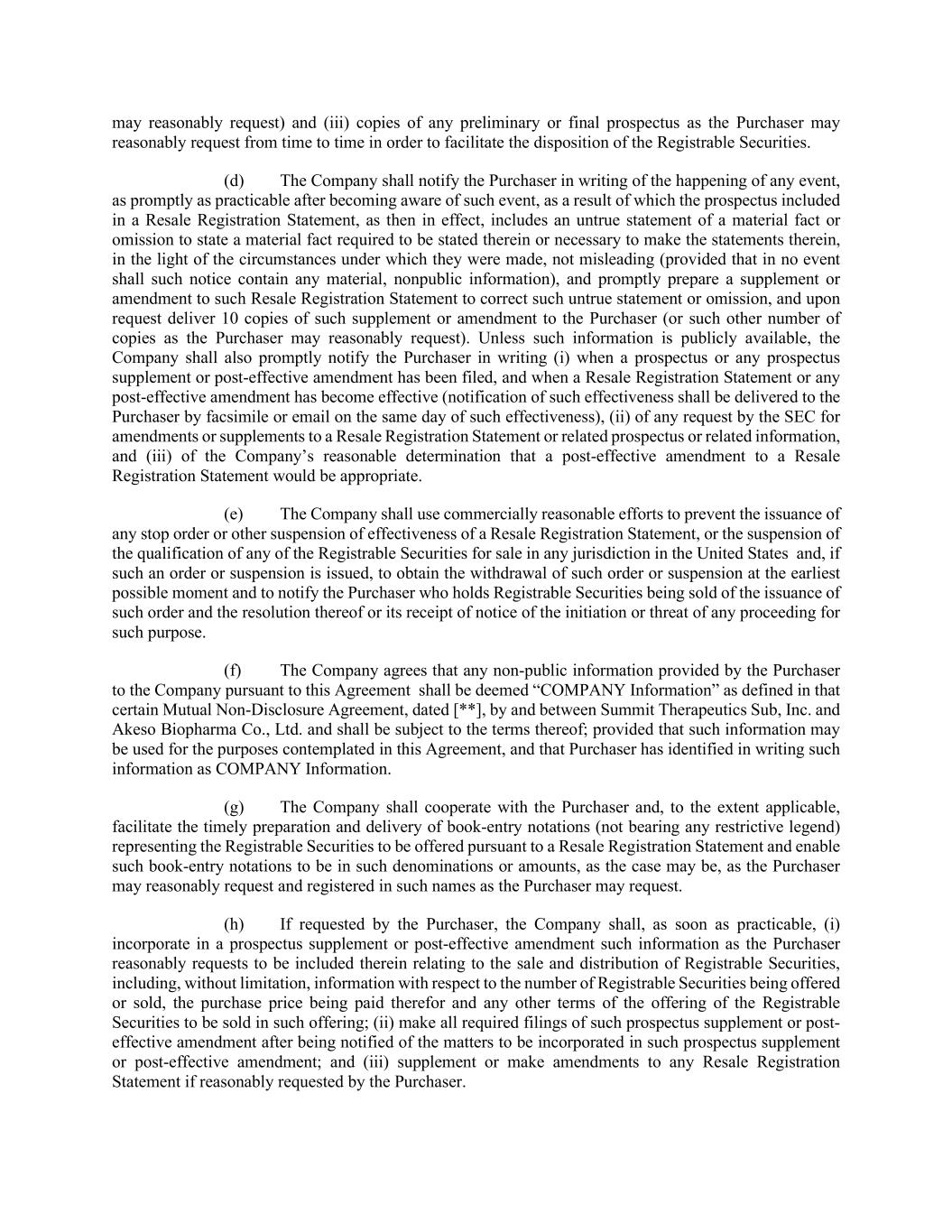 may reasonably request) and (iii) copies of any preliminary or final prospectus as the Purchaser may reasonably request from time to time in order to facilitate the disposition of the Registrable Securities. (d) The Company shall notify the Purchaser in writing of the happening of any event, as promptly as practicable after becoming aware of such event, as a result of which the prospectus included in a Resale Registration Statement, as then in effect, includes an untrue statement of a material fact or omission to state a material fact required to be stated therein or necessary to make the statements therein, in the light of the circumstances under which they were made, not misleading (provided that in no event shall such notice contain any material, nonpublic information), and promptly prepare a supplement or amendment to such Resale Registration Statement to correct such untrue statement or omission, and upon request deliver 10 copies of such supplement or amendment to the Purchaser (or such other number of copies as the Purchaser may reasonably request). Unless such information is publicly available, the Company shall also promptly notify the Purchaser in writing (i) when a prospectus or any prospectus supplement or post-effective amendment has been filed, and when a Resale Registration Statement or any post-effective amendment has become effective (notification of such effectiveness shall be delivered to the Purchaser by facsimile or email on the same day of such effectiveness), (ii) of any request by the SEC for amendments or supplements to a Resale Registration Statement or related prospectus or related information, and (iii) of the Company’s reasonable determination that a post-effective amendment to a Resale Registration Statement would be appropriate. (e) The Company shall use commercially reasonable efforts to prevent the issuance of any stop order or other suspension of effectiveness of a Resale Registration Statement, or the suspension of the qualification of any of the Registrable Securities for sale in any jurisdiction in the United States and, if such an order or suspension is issued, to obtain the withdrawal of such order or suspension at the earliest possible moment and to notify the Purchaser who holds Registrable Securities being sold of the issuance of such order and the resolution thereof or its receipt of notice of the initiation or threat of any proceeding for such purpose. (f) The Company agrees that any non-public information provided by the Purchaser to the Company pursuant to this Agreement shall be deemed “COMPANY Information” as defined in that certain Mutual Non-Disclosure Agreement, dated [**], by and between Summit Therapeutics Sub, Inc. and Akeso Biopharma Co., Ltd. and shall be subject to the terms thereof; provided that such information may be used for the purposes contemplated in this Agreement, and that Purchaser has identified in writing such information as COMPANY Information. (g) The Company shall cooperate with the Purchaser and, to the extent applicable, facilitate the timely preparation and delivery of book-entry notations (not bearing any restrictive legend) representing the Registrable Securities to be offered pursuant to a Resale Registration Statement and enable such book-entry notations to be in such denominations or amounts, as the case may be, as the Purchaser may reasonably request and registered in such names as the Purchaser may request. (h) If requested by the Purchaser, the Company shall, as soon as practicable, (i) incorporate in a prospectus supplement or post-effective amendment such information as the Purchaser reasonably requests to be included therein relating to the sale and distribution of Registrable Securities, including, without limitation, information with respect to the number of Registrable Securities being offered or sold, the purchase price being paid therefor and any other terms of the offering of the Registrable Securities to be sold in such offering; (ii) make all required filings of such prospectus supplement or post- effective amendment after being notified of the matters to be incorporated in such prospectus supplement or post-effective amendment; and (iii) supplement or make amendments to any Resale Registration Statement if reasonably requested by the Purchaser.