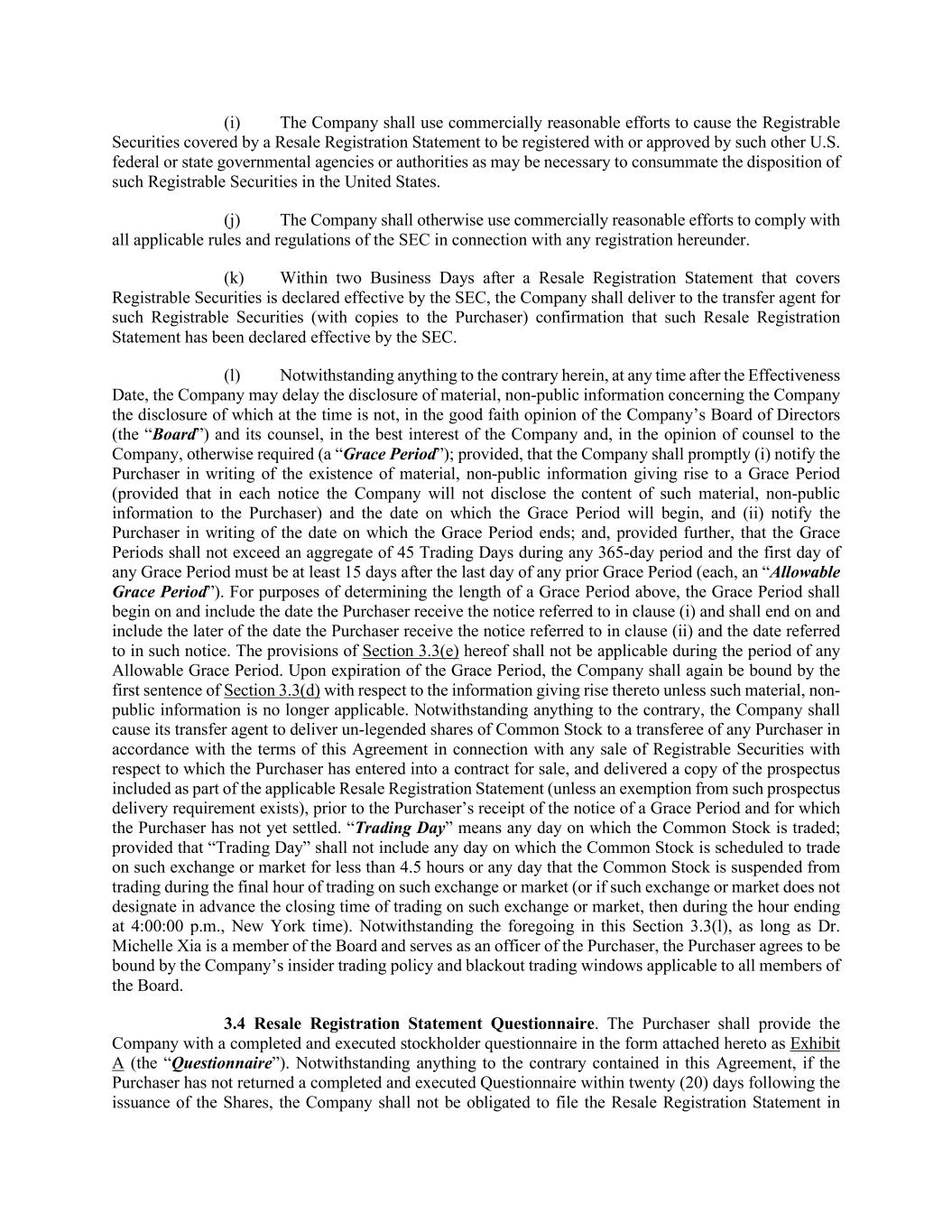 (i) The Company shall use commercially reasonable efforts to cause the Registrable Securities covered by a Resale Registration Statement to be registered with or approved by such other U.S. federal or state governmental agencies or authorities as may be necessary to consummate the disposition of such Registrable Securities in the United States. (j) The Company shall otherwise use commercially reasonable efforts to comply with all applicable rules and regulations of the SEC in connection with any registration hereunder. (k) Within two Business Days after a Resale Registration Statement that covers Registrable Securities is declared effective by the SEC, the Company shall deliver to the transfer agent for such Registrable Securities (with copies to the Purchaser) confirmation that such Resale Registration Statement has been declared effective by the SEC. (l) Notwithstanding anything to the contrary herein, at any time after the Effectiveness Date, the Company may delay the disclosure of material, non-public information concerning the Company the disclosure of which at the time is not, in the good faith opinion of the Company’s Board of Directors (the “Board”) and its counsel, in the best interest of the Company and, in the opinion of counsel to the Company, otherwise required (a “Grace Period”); provided, that the Company shall promptly (i) notify the Purchaser in writing of the existence of material, non-public information giving rise to a Grace Period (provided that in each notice the Company will not disclose the content of such material, non-public information to the Purchaser) and the date on which the Grace Period will begin, and (ii) notify the Purchaser in writing of the date on which the Grace Period ends; and, provided further, that the Grace Periods shall not exceed an aggregate of 45 Trading Days during any 365-day period and the first day of any Grace Period must be at least 15 days after the last day of any prior Grace Period (each, an “Allowable Grace Period”). For purposes of determining the length of a Grace Period above, the Grace Period shall begin on and include the date the Purchaser receive the notice referred to in clause (i) and shall end on and include the later of the date the Purchaser receive the notice referred to in clause (ii) and the date referred to in such notice. The provisions of Section 3.3(e) hereof shall not be applicable during the period of any Allowable Grace Period. Upon expiration of the Grace Period, the Company shall again be bound by the first sentence of Section 3.3(d) with respect to the information giving rise thereto unless such material, non- public information is no longer applicable. Notwithstanding anything to the contrary, the Company shall cause its transfer agent to deliver un-legended shares of Common Stock to a transferee of any Purchaser in accordance with the terms of this Agreement in connection with any sale of Registrable Securities with respect to which the Purchaser has entered into a contract for sale, and delivered a copy of the prospectus included as part of the applicable Resale Registration Statement (unless an exemption from such prospectus delivery requirement exists), prior to the Purchaser’s receipt of the notice of a Grace Period and for which the Purchaser has not yet settled. “Trading Day” means any day on which the Common Stock is traded; provided that “Trading Day” shall not include any day on which the Common Stock is scheduled to trade on such exchange or market for less than 4.5 hours or any day that the Common Stock is suspended from trading during the final hour of trading on such exchange or market (or if such exchange or market does not designate in advance the closing time of trading on such exchange or market, then during the hour ending at 4:00:00 p.m., New York time). Notwithstanding the foregoing in this Section 3.3(l), as long as Dr. Michelle Xia is a member of the Board and serves as an officer of the Purchaser, the Purchaser agrees to be bound by the Company’s insider trading policy and blackout trading windows applicable to all members of the Board. 3.4 Resale Registration Statement Questionnaire. The Purchaser shall provide the Company with a completed and executed stockholder questionnaire in the form attached hereto as Exhibit A (the “Questionnaire”). Notwithstanding anything to the contrary contained in this Agreement, if the Purchaser has not returned a completed and executed Questionnaire within twenty (20) days following the issuance of the Shares, the Company shall not be obligated to file the Resale Registration Statement in