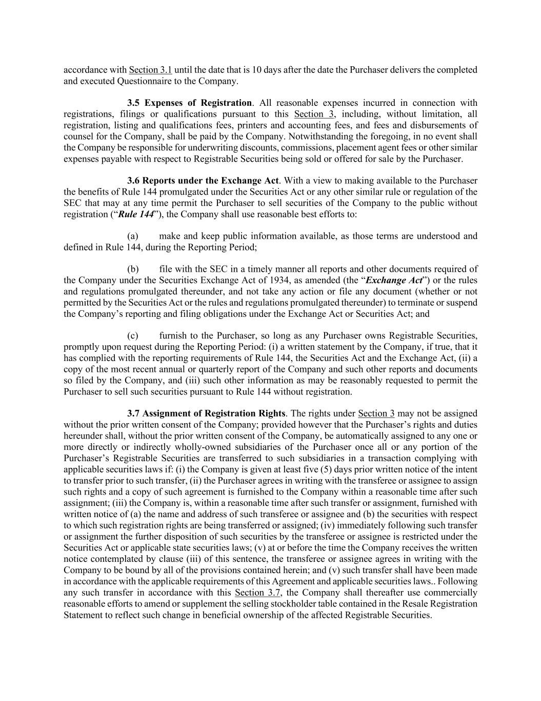 accordance with Section 3.1 until the date that is 10 days after the date the Purchaser delivers the completed and executed Questionnaire to the Company. 3.5 Expenses of Registration. All reasonable expenses incurred in connection with registrations, filings or qualifications pursuant to this Section 3, including, without limitation, all registration, listing and qualifications fees, printers and accounting fees, and fees and disbursements of counsel for the Company, shall be paid by the Company. Notwithstanding the foregoing, in no event shall the Company be responsible for underwriting discounts, commissions, placement agent fees or other similar expenses payable with respect to Registrable Securities being sold or offered for sale by the Purchaser. 3.6 Reports under the Exchange Act. With a view to making available to the Purchaser the benefits of Rule 144 promulgated under the Securities Act or any other similar rule or regulation of the SEC that may at any time permit the Purchaser to sell securities of the Company to the public without registration (“Rule 144”), the Company shall use reasonable best efforts to: (a) make and keep public information available, as those terms are understood and defined in Rule 144, during the Reporting Period; (b) file with the SEC in a timely manner all reports and other documents required of the Company under the Securities Exchange Act of 1934, as amended (the “Exchange Act”) or the rules and regulations promulgated thereunder, and not take any action or file any document (whether or not permitted by the Securities Act or the rules and regulations promulgated thereunder) to terminate or suspend the Company’s reporting and filing obligations under the Exchange Act or Securities Act; and (c) furnish to the Purchaser, so long as any Purchaser owns Registrable Securities, promptly upon request during the Reporting Period: (i) a written statement by the Company, if true, that it has complied with the reporting requirements of Rule 144, the Securities Act and the Exchange Act, (ii) a copy of the most recent annual or quarterly report of the Company and such other reports and documents so filed by the Company, and (iii) such other information as may be reasonably requested to permit the Purchaser to sell such securities pursuant to Rule 144 without registration. 3.7 Assignment of Registration Rights. The rights under Section 3 may not be assigned without the prior written consent of the Company; provided however that the Purchaser’s rights and duties hereunder shall, without the prior written consent of the Company, be automatically assigned to any one or more directly or indirectly wholly-owned subsidiaries of the Purchaser once all or any portion of the Purchaser’s Registrable Securities are transferred to such subsidiaries in a transaction complying with applicable securities laws if: (i) the Company is given at least five (5) days prior written notice of the intent to transfer prior to such transfer, (ii) the Purchaser agrees in writing with the transferee or assignee to assign such rights and a copy of such agreement is furnished to the Company within a reasonable time after such assignment; (iii) the Company is, within a reasonable time after such transfer or assignment, furnished with written notice of (a) the name and address of such transferee or assignee and (b) the securities with respect to which such registration rights are being transferred or assigned; (iv) immediately following such transfer or assignment the further disposition of such securities by the transferee or assignee is restricted under the Securities Act or applicable state securities laws; (v) at or before the time the Company receives the written notice contemplated by clause (iii) of this sentence, the transferee or assignee agrees in writing with the Company to be bound by all of the provisions contained herein; and (v) such transfer shall have been made in accordance with the applicable requirements of this Agreement and applicable securities laws.. Following any such transfer in accordance with this Section 3.7, the Company shall thereafter use commercially reasonable efforts to amend or supplement the selling stockholder table contained in the Resale Registration Statement to reflect such change in beneficial ownership of the affected Registrable Securities.