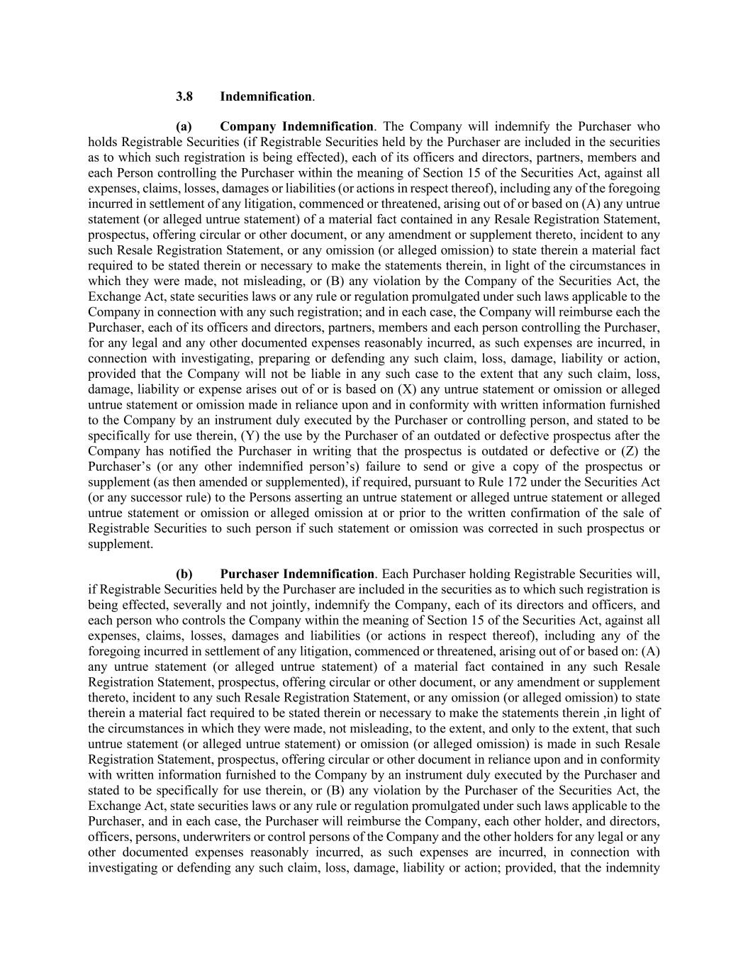 3.8 Indemnification. (a) Company Indemnification. The Company will indemnify the Purchaser who holds Registrable Securities (if Registrable Securities held by the Purchaser are included in the securities as to which such registration is being effected), each of its officers and directors, partners, members and each Person controlling the Purchaser within the meaning of Section 15 of the Securities Act, against all expenses, claims, losses, damages or liabilities (or actions in respect thereof), including any of the foregoing incurred in settlement of any litigation, commenced or threatened, arising out of or based on (A) any untrue statement (or alleged untrue statement) of a material fact contained in any Resale Registration Statement, prospectus, offering circular or other document, or any amendment or supplement thereto, incident to any such Resale Registration Statement, or any omission (or alleged omission) to state therein a material fact required to be stated therein or necessary to make the statements therein, in light of the circumstances in which they were made, not misleading, or (B) any violation by the Company of the Securities Act, the Exchange Act, state securities laws or any rule or regulation promulgated under such laws applicable to the Company in connection with any such registration; and in each case, the Company will reimburse each the Purchaser, each of its officers and directors, partners, members and each person controlling the Purchaser, for any legal and any other documented expenses reasonably incurred, as such expenses are incurred, in connection with investigating, preparing or defending any such claim, loss, damage, liability or action, provided that the Company will not be liable in any such case to the extent that any such claim, loss, damage, liability or expense arises out of or is based on (X) any untrue statement or omission or alleged untrue statement or omission made in reliance upon and in conformity with written information furnished to the Company by an instrument duly executed by the Purchaser or controlling person, and stated to be specifically for use therein, (Y) the use by the Purchaser of an outdated or defective prospectus after the Company has notified the Purchaser in writing that the prospectus is outdated or defective or (Z) the Purchaser’s (or any other indemnified person’s) failure to send or give a copy of the prospectus or supplement (as then amended or supplemented), if required, pursuant to Rule 172 under the Securities Act (or any successor rule) to the Persons asserting an untrue statement or alleged untrue statement or alleged untrue statement or omission or alleged omission at or prior to the written confirmation of the sale of Registrable Securities to such person if such statement or omission was corrected in such prospectus or supplement. (b) Purchaser Indemnification. Each Purchaser holding Registrable Securities will, if Registrable Securities held by the Purchaser are included in the securities as to which such registration is being effected, severally and not jointly, indemnify the Company, each of its directors and officers, and each person who controls the Company within the meaning of Section 15 of the Securities Act, against all expenses, claims, losses, damages and liabilities (or actions in respect thereof), including any of the foregoing incurred in settlement of any litigation, commenced or threatened, arising out of or based on: (A) any untrue statement (or alleged untrue statement) of a material fact contained in any such Resale Registration Statement, prospectus, offering circular or other document, or any amendment or supplement thereto, incident to any such Resale Registration Statement, or any omission (or alleged omission) to state therein a material fact required to be stated therein or necessary to make the statements therein ,in light of the circumstances in which they were made, not misleading, to the extent, and only to the extent, that such untrue statement (or alleged untrue statement) or omission (or alleged omission) is made in such Resale Registration Statement, prospectus, offering circular or other document in reliance upon and in conformity with written information furnished to the Company by an instrument duly executed by the Purchaser and stated to be specifically for use therein, or (B) any violation by the Purchaser of the Securities Act, the Exchange Act, state securities laws or any rule or regulation promulgated under such laws applicable to the Purchaser, and in each case, the Purchaser will reimburse the Company, each other holder, and directors, officers, persons, underwriters or control persons of the Company and the other holders for any legal or any other documented expenses reasonably incurred, as such expenses are incurred, in connection with investigating or defending any such claim, loss, damage, liability or action; provided, that the indemnity