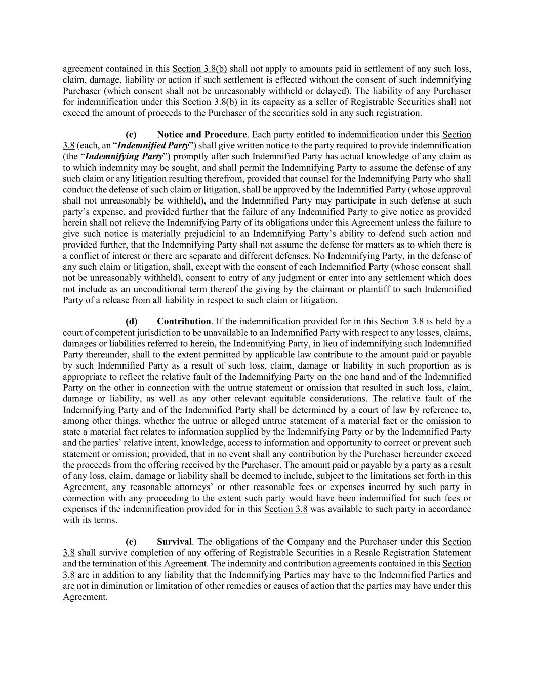 agreement contained in this Section 3.8(b) shall not apply to amounts paid in settlement of any such loss, claim, damage, liability or action if such settlement is effected without the consent of such indemnifying Purchaser (which consent shall not be unreasonably withheld or delayed). The liability of any Purchaser for indemnification under this Section 3.8(b) in its capacity as a seller of Registrable Securities shall not exceed the amount of proceeds to the Purchaser of the securities sold in any such registration. (c) Notice and Procedure. Each party entitled to indemnification under this Section 3.8 (each, an “Indemnified Party”) shall give written notice to the party required to provide indemnification (the “Indemnifying Party”) promptly after such Indemnified Party has actual knowledge of any claim as to which indemnity may be sought, and shall permit the Indemnifying Party to assume the defense of any such claim or any litigation resulting therefrom, provided that counsel for the Indemnifying Party who shall conduct the defense of such claim or litigation, shall be approved by the Indemnified Party (whose approval shall not unreasonably be withheld), and the Indemnified Party may participate in such defense at such party’s expense, and provided further that the failure of any Indemnified Party to give notice as provided herein shall not relieve the Indemnifying Party of its obligations under this Agreement unless the failure to give such notice is materially prejudicial to an Indemnifying Party’s ability to defend such action and provided further, that the Indemnifying Party shall not assume the defense for matters as to which there is a conflict of interest or there are separate and different defenses. No Indemnifying Party, in the defense of any such claim or litigation, shall, except with the consent of each Indemnified Party (whose consent shall not be unreasonably withheld), consent to entry of any judgment or enter into any settlement which does not include as an unconditional term thereof the giving by the claimant or plaintiff to such Indemnified Party of a release from all liability in respect to such claim or litigation. (d) Contribution. If the indemnification provided for in this Section 3.8 is held by a court of competent jurisdiction to be unavailable to an Indemnified Party with respect to any losses, claims, damages or liabilities referred to herein, the Indemnifying Party, in lieu of indemnifying such Indemnified Party thereunder, shall to the extent permitted by applicable law contribute to the amount paid or payable by such Indemnified Party as a result of such loss, claim, damage or liability in such proportion as is appropriate to reflect the relative fault of the Indemnifying Party on the one hand and of the Indemnified Party on the other in connection with the untrue statement or omission that resulted in such loss, claim, damage or liability, as well as any other relevant equitable considerations. The relative fault of the Indemnifying Party and of the Indemnified Party shall be determined by a court of law by reference to, among other things, whether the untrue or alleged untrue statement of a material fact or the omission to state a material fact relates to information supplied by the Indemnifying Party or by the Indemnified Party and the parties’ relative intent, knowledge, access to information and opportunity to correct or prevent such statement or omission; provided, that in no event shall any contribution by the Purchaser hereunder exceed the proceeds from the offering received by the Purchaser. The amount paid or payable by a party as a result of any loss, claim, damage or liability shall be deemed to include, subject to the limitations set forth in this Agreement, any reasonable attorneys’ or other reasonable fees or expenses incurred by such party in connection with any proceeding to the extent such party would have been indemnified for such fees or expenses if the indemnification provided for in this Section 3.8 was available to such party in accordance with its terms. (e) Survival. The obligations of the Company and the Purchaser under this Section 3.8 shall survive completion of any offering of Registrable Securities in a Resale Registration Statement and the termination of this Agreement. The indemnity and contribution agreements contained in this Section 3.8 are in addition to any liability that the Indemnifying Parties may have to the Indemnified Parties and are not in diminution or limitation of other remedies or causes of action that the parties may have under this Agreement.