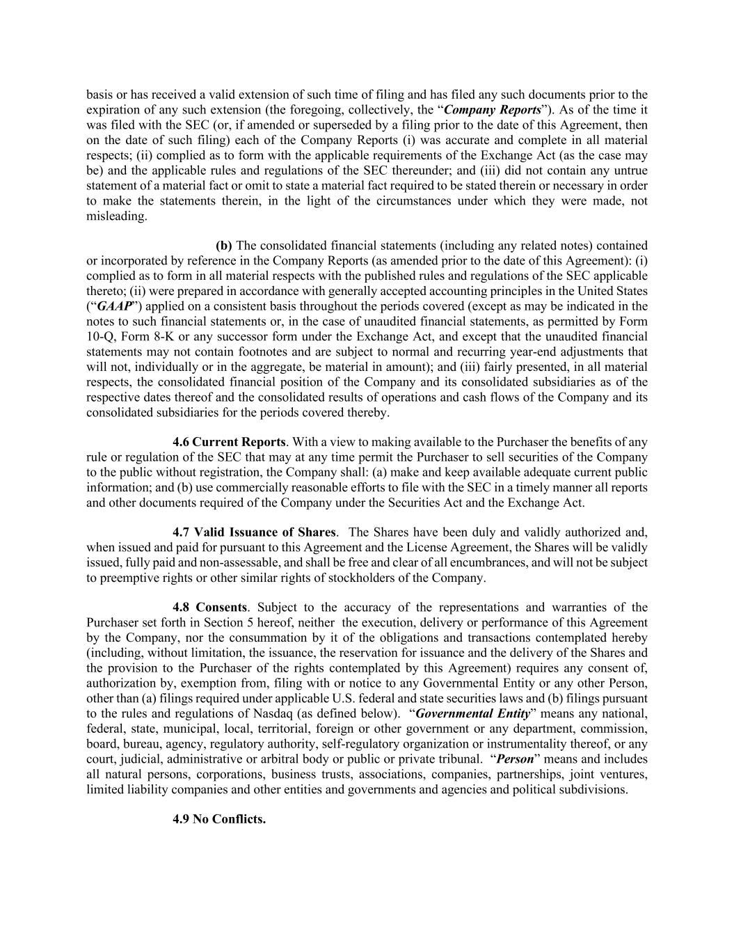 basis or has received a valid extension of such time of filing and has filed any such documents prior to the expiration of any such extension (the foregoing, collectively, the “Company Reports”). As of the time it was filed with the SEC (or, if amended or superseded by a filing prior to the date of this Agreement, then on the date of such filing) each of the Company Reports (i) was accurate and complete in all material respects; (ii) complied as to form with the applicable requirements of the Exchange Act (as the case may be) and the applicable rules and regulations of the SEC thereunder; and (iii) did not contain any untrue statement of a material fact or omit to state a material fact required to be stated therein or necessary in order to make the statements therein, in the light of the circumstances under which they were made, not misleading. (b) The consolidated financial statements (including any related notes) contained or incorporated by reference in the Company Reports (as amended prior to the date of this Agreement): (i) complied as to form in all material respects with the published rules and regulations of the SEC applicable thereto; (ii) were prepared in accordance with generally accepted accounting principles in the United States (“GAAP”) applied on a consistent basis throughout the periods covered (except as may be indicated in the notes to such financial statements or, in the case of unaudited financial statements, as permitted by Form 10-Q, Form 8-K or any successor form under the Exchange Act, and except that the unaudited financial statements may not contain footnotes and are subject to normal and recurring year-end adjustments that will not, individually or in the aggregate, be material in amount); and (iii) fairly presented, in all material respects, the consolidated financial position of the Company and its consolidated subsidiaries as of the respective dates thereof and the consolidated results of operations and cash flows of the Company and its consolidated subsidiaries for the periods covered thereby. 4.6 Current Reports. With a view to making available to the Purchaser the benefits of any rule or regulation of the SEC that may at any time permit the Purchaser to sell securities of the Company to the public without registration, the Company shall: (a) make and keep available adequate current public information; and (b) use commercially reasonable efforts to file with the SEC in a timely manner all reports and other documents required of the Company under the Securities Act and the Exchange Act. 4.7 Valid Issuance of Shares. The Shares have been duly and validly authorized and, when issued and paid for pursuant to this Agreement and the License Agreement, the Shares will be validly issued, fully paid and non-assessable, and shall be free and clear of all encumbrances, and will not be subject to preemptive rights or other similar rights of stockholders of the Company. 4.8 Consents. Subject to the accuracy of the representations and warranties of the Purchaser set forth in Section 5 hereof, neither the execution, delivery or performance of this Agreement by the Company, nor the consummation by it of the obligations and transactions contemplated hereby (including, without limitation, the issuance, the reservation for issuance and the delivery of the Shares and the provision to the Purchaser of the rights contemplated by this Agreement) requires any consent of, authorization by, exemption from, filing with or notice to any Governmental Entity or any other Person, other than (a) filings required under applicable U.S. federal and state securities laws and (b) filings pursuant to the rules and regulations of Nasdaq (as defined below). “Governmental Entity” means any national, federal, state, municipal, local, territorial, foreign or other government or any department, commission, board, bureau, agency, regulatory authority, self-regulatory organization or instrumentality thereof, or any court, judicial, administrative or arbitral body or public or private tribunal. “Person” means and includes all natural persons, corporations, business trusts, associations, companies, partnerships, joint ventures, limited liability companies and other entities and governments and agencies and political subdivisions. 4.9 No Conflicts.