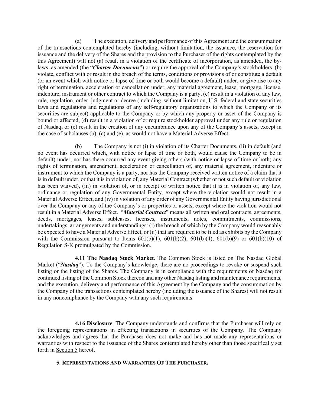 (a) The execution, delivery and performance of this Agreement and the consummation of the transactions contemplated hereby (including, without limitation, the issuance, the reservation for issuance and the delivery of the Shares and the provision to the Purchaser of the rights contemplated by the this Agreement) will not (a) result in a violation of the certificate of incorporation, as amended, the by- laws, as amended (the “Charter Documents”) or require the approval of the Company’s stockholders, (b) violate, conflict with or result in the breach of the terms, conditions or provisions of or constitute a default (or an event which with notice or lapse of time or both would become a default) under, or give rise to any right of termination, acceleration or cancellation under, any material agreement, lease, mortgage, license, indenture, instrument or other contract to which the Company is a party, (c) result in a violation of any law, rule, regulation, order, judgment or decree (including, without limitation, U.S. federal and state securities laws and regulations and regulations of any self-regulatory organizations to which the Company or its securities are subject) applicable to the Company or by which any property or asset of the Company is bound or affected, (d) result in a violation of or require stockholder approval under any rule or regulation of Nasdaq, or (e) result in the creation of any encumbrance upon any of the Company’s assets, except in the case of subclauses (b), (c) and (e), as would not have a Material Adverse Effect. (b) The Company is not (i) in violation of its Charter Documents, (ii) in default (and no event has occurred which, with notice or lapse of time or both, would cause the Company to be in default) under, nor has there occurred any event giving others (with notice or lapse of time or both) any rights of termination, amendment, acceleration or cancellation of, any material agreement, indenture or instrument to which the Company is a party, nor has the Company received written notice of a claim that it is in default under, or that it is in violation of, any Material Contract (whether or not such default or violation has been waived), (iii) in violation of, or in receipt of written notice that it is in violation of, any law, ordinance or regulation of any Governmental Entity, except where the violation would not result in a Material Adverse Effect, and (iv) in violation of any order of any Governmental Entity having jurisdictional over the Company or any of the Company’s or properties or assets, except where the violation would not result in a Material Adverse Effect. “Material Contract” means all written and oral contracts, agreements, deeds, mortgages, leases, subleases, licenses, instruments, notes, commitments, commissions, undertakings, arrangements and understandings: (i) the breach of which by the Company would reasonably be expected to have a Material Adverse Effect, or (ii) that are required to be filed as exhibits by the Company with the Commission pursuant to Items 601(b)(1), 601(b)(2), 601(b)(4), 601(b)(9) or 601(b)(10) of Regulation S-K promulgated by the Commission. 4.11 The Nasdaq Stock Market. The Common Stock is listed on The Nasdaq Global Market (“Nasdaq”). To the Company’s knowledge, there are no proceedings to revoke or suspend such listing or the listing of the Shares. The Company is in compliance with the requirements of Nasdaq for continued listing of the Common Stock thereon and any other Nasdaq listing and maintenance requirements, and the execution, delivery and performance of this Agreement by the Company and the consummation by the Company of the transactions contemplated hereby (including the issuance of the Shares) will not result in any noncompliance by the Company with any such requirements. 4.16 Disclosure. The Company understands and confirms that the Purchaser will rely on the foregoing representations in effecting transactions in securities of the Company. The Company acknowledges and agrees that the Purchaser does not make and has not made any representations or warranties with respect to the issuance of the Shares contemplated hereby other than those specifically set forth in Section 5 hereof. 5. REPRESENTATIONS AND WARRANTIES OF THE PURCHASER.