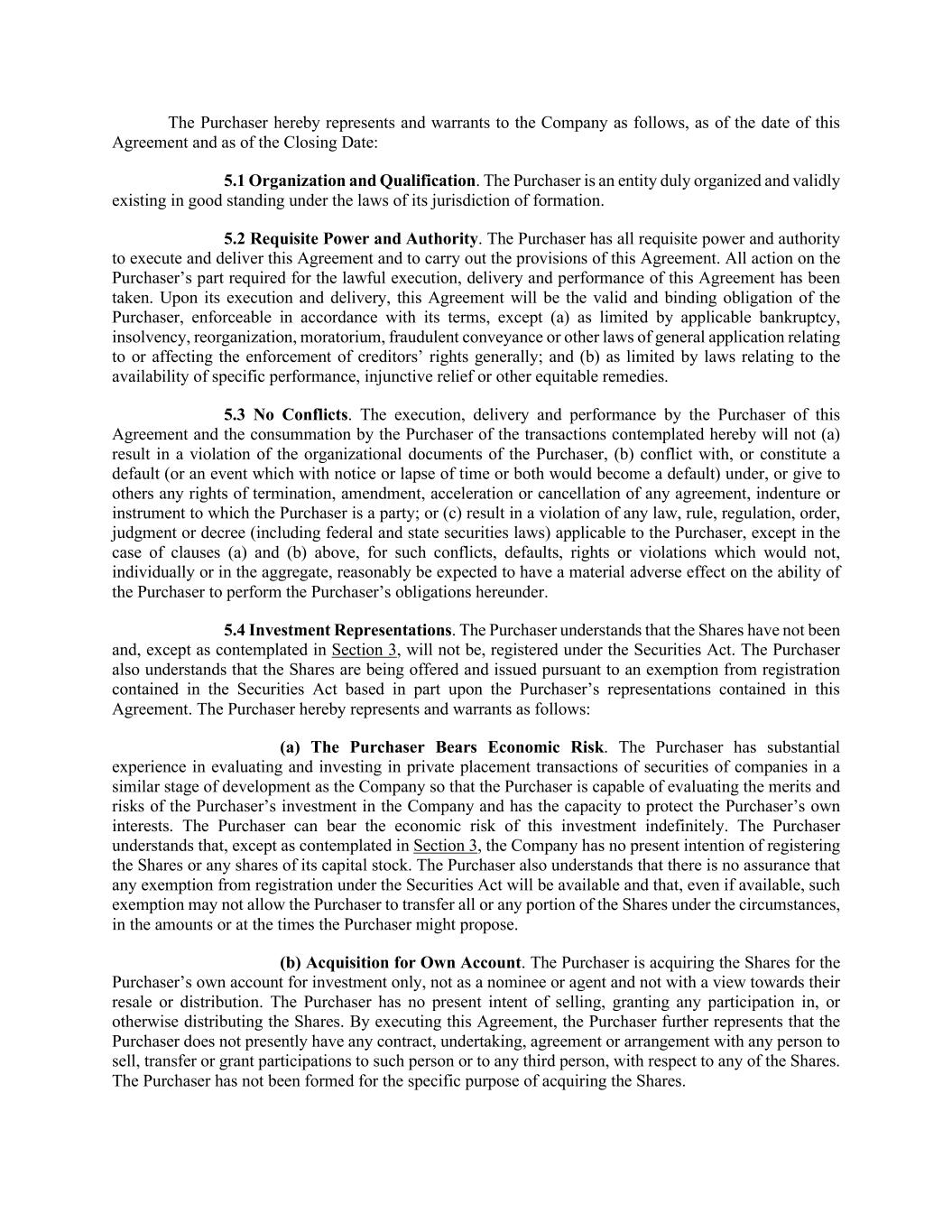 The Purchaser hereby represents and warrants to the Company as follows, as of the date of this Agreement and as of the Closing Date: 5.1 Organization and Qualification. The Purchaser is an entity duly organized and validly existing in good standing under the laws of its jurisdiction of formation. 5.2 Requisite Power and Authority. The Purchaser has all requisite power and authority to execute and deliver this Agreement and to carry out the provisions of this Agreement. All action on the Purchaser’s part required for the lawful execution, delivery and performance of this Agreement has been taken. Upon its execution and delivery, this Agreement will be the valid and binding obligation of the Purchaser, enforceable in accordance with its terms, except (a) as limited by applicable bankruptcy, insolvency, reorganization, moratorium, fraudulent conveyance or other laws of general application relating to or affecting the enforcement of creditors’ rights generally; and (b) as limited by laws relating to the availability of specific performance, injunctive relief or other equitable remedies. 5.3 No Conflicts. The execution, delivery and performance by the Purchaser of this Agreement and the consummation by the Purchaser of the transactions contemplated hereby will not (a) result in a violation of the organizational documents of the Purchaser, (b) conflict with, or constitute a default (or an event which with notice or lapse of time or both would become a default) under, or give to others any rights of termination, amendment, acceleration or cancellation of any agreement, indenture or instrument to which the Purchaser is a party; or (c) result in a violation of any law, rule, regulation, order, judgment or decree (including federal and state securities laws) applicable to the Purchaser, except in the case of clauses (a) and (b) above, for such conflicts, defaults, rights or violations which would not, individually or in the aggregate, reasonably be expected to have a material adverse effect on the ability of the Purchaser to perform the Purchaser’s obligations hereunder. 5.4 Investment Representations. The Purchaser understands that the Shares have not been and, except as contemplated in Section 3, will not be, registered under the Securities Act. The Purchaser also understands that the Shares are being offered and issued pursuant to an exemption from registration contained in the Securities Act based in part upon the Purchaser’s representations contained in this Agreement. The Purchaser hereby represents and warrants as follows: (a) The Purchaser Bears Economic Risk. The Purchaser has substantial experience in evaluating and investing in private placement transactions of securities of companies in a similar stage of development as the Company so that the Purchaser is capable of evaluating the merits and risks of the Purchaser’s investment in the Company and has the capacity to protect the Purchaser’s own interests. The Purchaser can bear the economic risk of this investment indefinitely. The Purchaser understands that, except as contemplated in Section 3, the Company has no present intention of registering the Shares or any shares of its capital stock. The Purchaser also understands that there is no assurance that any exemption from registration under the Securities Act will be available and that, even if available, such exemption may not allow the Purchaser to transfer all or any portion of the Shares under the circumstances, in the amounts or at the times the Purchaser might propose. (b) Acquisition for Own Account. The Purchaser is acquiring the Shares for the Purchaser’s own account for investment only, not as a nominee or agent and not with a view towards their resale or distribution. The Purchaser has no present intent of selling, granting any participation in, or otherwise distributing the Shares. By executing this Agreement, the Purchaser further represents that the Purchaser does not presently have any contract, undertaking, agreement or arrangement with any person to sell, transfer or grant participations to such person or to any third person, with respect to any of the Shares. The Purchaser has not been formed for the specific purpose of acquiring the Shares.