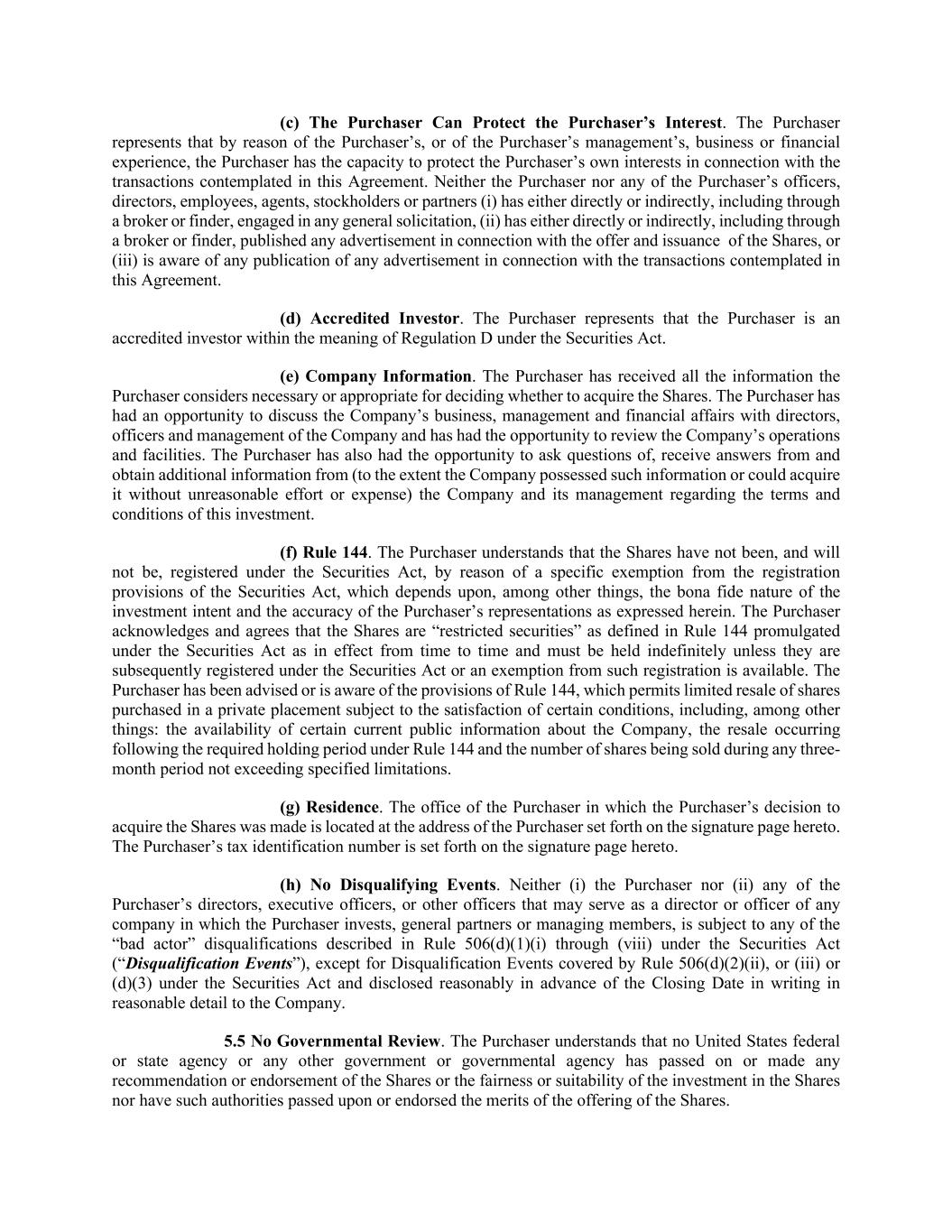 (c) The Purchaser Can Protect the Purchaser’s Interest. The Purchaser represents that by reason of the Purchaser’s, or of the Purchaser’s management’s, business or financial experience, the Purchaser has the capacity to protect the Purchaser’s own interests in connection with the transactions contemplated in this Agreement. Neither the Purchaser nor any of the Purchaser’s officers, directors, employees, agents, stockholders or partners (i) has either directly or indirectly, including through a broker or finder, engaged in any general solicitation, (ii) has either directly or indirectly, including through a broker or finder, published any advertisement in connection with the offer and issuance of the Shares, or (iii) is aware of any publication of any advertisement in connection with the transactions contemplated in this Agreement. (d) Accredited Investor. The Purchaser represents that the Purchaser is an accredited investor within the meaning of Regulation D under the Securities Act. (e) Company Information. The Purchaser has received all the information the Purchaser considers necessary or appropriate for deciding whether to acquire the Shares. The Purchaser has had an opportunity to discuss the Company’s business, management and financial affairs with directors, officers and management of the Company and has had the opportunity to review the Company’s operations and facilities. The Purchaser has also had the opportunity to ask questions of, receive answers from and obtain additional information from (to the extent the Company possessed such information or could acquire it without unreasonable effort or expense) the Company and its management regarding the terms and conditions of this investment. (f) Rule 144. The Purchaser understands that the Shares have not been, and will not be, registered under the Securities Act, by reason of a specific exemption from the registration provisions of the Securities Act, which depends upon, among other things, the bona fide nature of the investment intent and the accuracy of the Purchaser’s representations as expressed herein. The Purchaser acknowledges and agrees that the Shares are “restricted securities” as defined in Rule 144 promulgated under the Securities Act as in effect from time to time and must be held indefinitely unless they are subsequently registered under the Securities Act or an exemption from such registration is available. The Purchaser has been advised or is aware of the provisions of Rule 144, which permits limited resale of shares purchased in a private placement subject to the satisfaction of certain conditions, including, among other things: the availability of certain current public information about the Company, the resale occurring following the required holding period under Rule 144 and the number of shares being sold during any three- month period not exceeding specified limitations. (g) Residence. The office of the Purchaser in which the Purchaser’s decision to acquire the Shares was made is located at the address of the Purchaser set forth on the signature page hereto. The Purchaser’s tax identification number is set forth on the signature page hereto. (h) No Disqualifying Events. Neither (i) the Purchaser nor (ii) any of the Purchaser’s directors, executive officers, or other officers that may serve as a director or officer of any company in which the Purchaser invests, general partners or managing members, is subject to any of the “bad actor” disqualifications described in Rule 506(d)(1)(i) through (viii) under the Securities Act (“Disqualification Events”), except for Disqualification Events covered by Rule 506(d)(2)(ii), or (iii) or (d)(3) under the Securities Act and disclosed reasonably in advance of the Closing Date in writing in reasonable detail to the Company. 5.5 No Governmental Review. The Purchaser understands that no United States federal or state agency or any other government or governmental agency has passed on or made any recommendation or endorsement of the Shares or the fairness or suitability of the investment in the Shares nor have such authorities passed upon or endorsed the merits of the offering of the Shares.