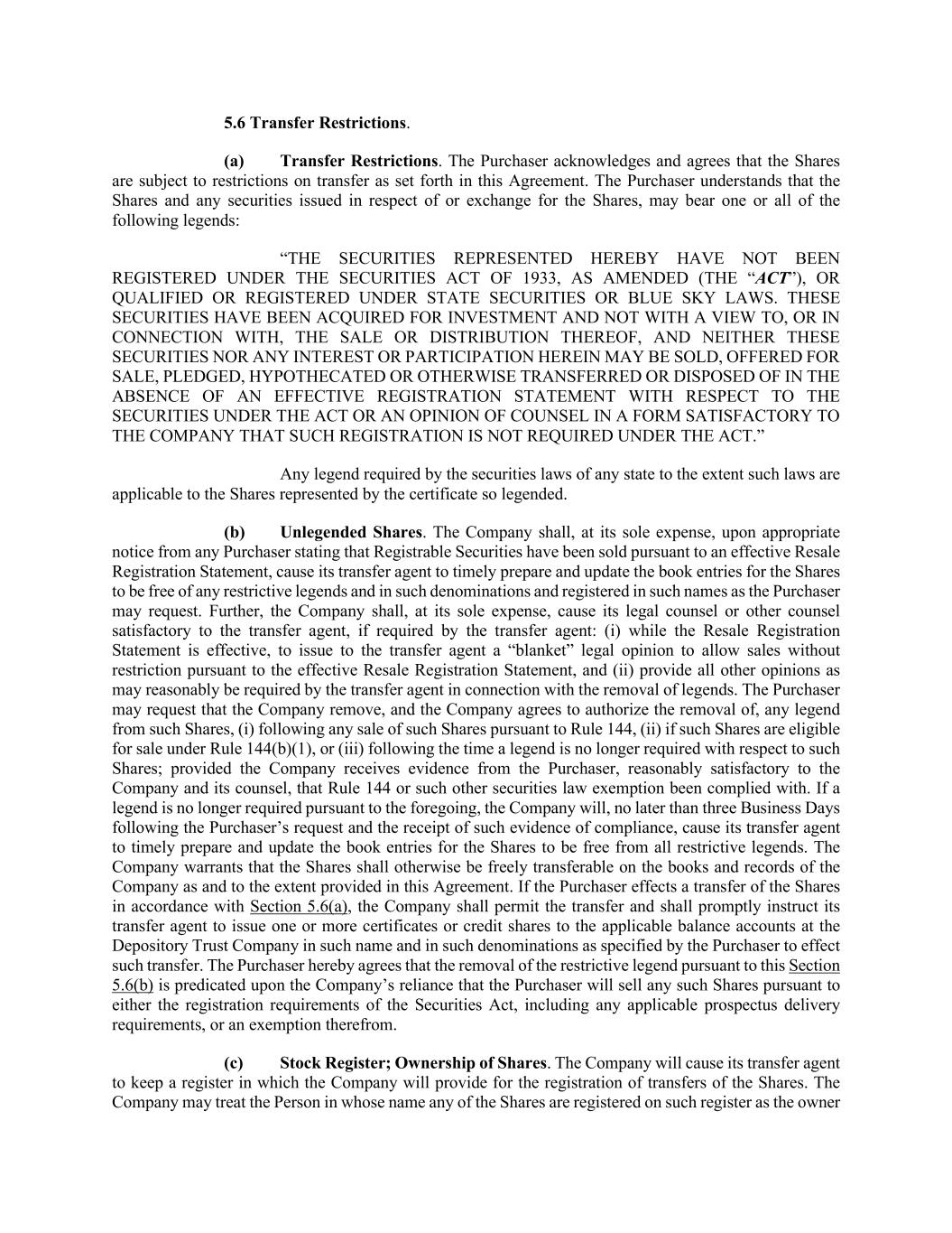 5.6 Transfer Restrictions. (a) Transfer Restrictions. The Purchaser acknowledges and agrees that the Shares are subject to restrictions on transfer as set forth in this Agreement. The Purchaser understands that the Shares and any securities issued in respect of or exchange for the Shares, may bear one or all of the following legends: “THE SECURITIES REPRESENTED HEREBY HAVE NOT BEEN REGISTERED UNDER THE SECURITIES ACT OF 1933, AS AMENDED (THE “ACT”), OR QUALIFIED OR REGISTERED UNDER STATE SECURITIES OR BLUE SKY LAWS. THESE SECURITIES HAVE BEEN ACQUIRED FOR INVESTMENT AND NOT WITH A VIEW TO, OR IN CONNECTION WITH, THE SALE OR DISTRIBUTION THEREOF, AND NEITHER THESE SECURITIES NOR ANY INTEREST OR PARTICIPATION HEREIN MAY BE SOLD, OFFERED FOR SALE, PLEDGED, HYPOTHECATED OR OTHERWISE TRANSFERRED OR DISPOSED OF IN THE ABSENCE OF AN EFFECTIVE REGISTRATION STATEMENT WITH RESPECT TO THE SECURITIES UNDER THE ACT OR AN OPINION OF COUNSEL IN A FORM SATISFACTORY TO THE COMPANY THAT SUCH REGISTRATION IS NOT REQUIRED UNDER THE ACT.” Any legend required by the securities laws of any state to the extent such laws are applicable to the Shares represented by the certificate so legended. (b) Unlegended Shares. The Company shall, at its sole expense, upon appropriate notice from any Purchaser stating that Registrable Securities have been sold pursuant to an effective Resale Registration Statement, cause its transfer agent to timely prepare and update the book entries for the Shares to be free of any restrictive legends and in such denominations and registered in such names as the Purchaser may request. Further, the Company shall, at its sole expense, cause its legal counsel or other counsel satisfactory to the transfer agent, if required by the transfer agent: (i) while the Resale Registration Statement is effective, to issue to the transfer agent a “blanket” legal opinion to allow sales without restriction pursuant to the effective Resale Registration Statement, and (ii) provide all other opinions as may reasonably be required by the transfer agent in connection with the removal of legends. The Purchaser may request that the Company remove, and the Company agrees to authorize the removal of, any legend from such Shares, (i) following any sale of such Shares pursuant to Rule 144, (ii) if such Shares are eligible for sale under Rule 144(b)(1), or (iii) following the time a legend is no longer required with respect to such Shares; provided the Company receives evidence from the Purchaser, reasonably satisfactory to the Company and its counsel, that Rule 144 or such other securities law exemption been complied with. If a legend is no longer required pursuant to the foregoing, the Company will, no later than three Business Days following the Purchaser’s request and the receipt of such evidence of compliance, cause its transfer agent to timely prepare and update the book entries for the Shares to be free from all restrictive legends. The Company warrants that the Shares shall otherwise be freely transferable on the books and records of the Company as and to the extent provided in this Agreement. If the Purchaser effects a transfer of the Shares in accordance with Section 5.6(a), the Company shall permit the transfer and shall promptly instruct its transfer agent to issue one or more certificates or credit shares to the applicable balance accounts at the Depository Trust Company in such name and in such denominations as specified by the Purchaser to effect such transfer. The Purchaser hereby agrees that the removal of the restrictive legend pursuant to this Section 5.6(b) is predicated upon the Company’s reliance that the Purchaser will sell any such Shares pursuant to either the registration requirements of the Securities Act, including any applicable prospectus delivery requirements, or an exemption therefrom. (c) Stock Register; Ownership of Shares. The Company will cause its transfer agent to keep a register in which the Company will provide for the registration of transfers of the Shares. The Company may treat the Person in whose name any of the Shares are registered on such register as the owner