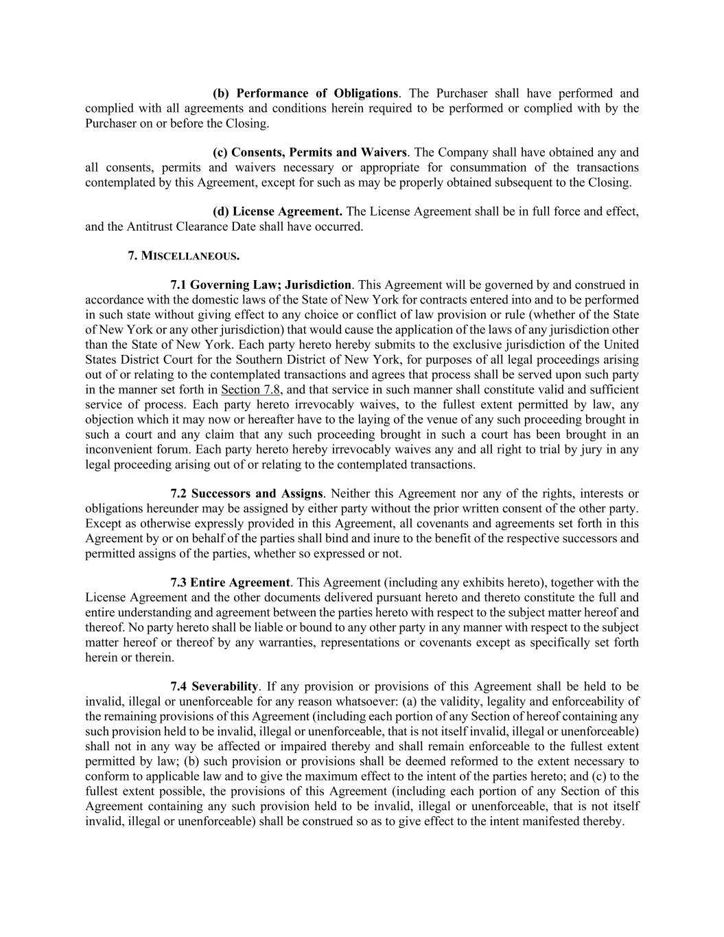 (b) Performance of Obligations. The Purchaser shall have performed and complied with all agreements and conditions herein required to be performed or complied with by the Purchaser on or before the Closing. (c) Consents, Permits and Waivers. The Company shall have obtained any and all consents, permits and waivers necessary or appropriate for consummation of the transactions contemplated by this Agreement, except for such as may be properly obtained subsequent to the Closing. (d) License Agreement. The License Agreement shall be in full force and effect, and the Antitrust Clearance Date shall have occurred. 7. MISCELLANEOUS. 7.1 Governing Law; Jurisdiction. This Agreement will be governed by and construed in accordance with the domestic laws of the State of New York for contracts entered into and to be performed in such state without giving effect to any choice or conflict of law provision or rule (whether of the State of New York or any other jurisdiction) that would cause the application of the laws of any jurisdiction other than the State of New York. Each party hereto hereby submits to the exclusive jurisdiction of the United States District Court for the Southern District of New York, for purposes of all legal proceedings arising out of or relating to the contemplated transactions and agrees that process shall be served upon such party in the manner set forth in Section 7.8, and that service in such manner shall constitute valid and sufficient service of process. Each party hereto irrevocably waives, to the fullest extent permitted by law, any objection which it may now or hereafter have to the laying of the venue of any such proceeding brought in such a court and any claim that any such proceeding brought in such a court has been brought in an inconvenient forum. Each party hereto hereby irrevocably waives any and all right to trial by jury in any legal proceeding arising out of or relating to the contemplated transactions. 7.2 Successors and Assigns. Neither this Agreement nor any of the rights, interests or obligations hereunder may be assigned by either party without the prior written consent of the other party. Except as otherwise expressly provided in this Agreement, all covenants and agreements set forth in this Agreement by or on behalf of the parties shall bind and inure to the benefit of the respective successors and permitted assigns of the parties, whether so expressed or not. 7.3 Entire Agreement. This Agreement (including any exhibits hereto), together with the License Agreement and the other documents delivered pursuant hereto and thereto constitute the full and entire understanding and agreement between the parties hereto with respect to the subject matter hereof and thereof. No party hereto shall be liable or bound to any other party in any manner with respect to the subject matter hereof or thereof by any warranties, representations or covenants except as specifically set forth herein or therein. 7.4 Severability. If any provision or provisions of this Agreement shall be held to be invalid, illegal or unenforceable for any reason whatsoever: (a) the validity, legality and enforceability of the remaining provisions of this Agreement (including each portion of any Section of hereof containing any such provision held to be invalid, illegal or unenforceable, that is not itself invalid, illegal or unenforceable) shall not in any way be affected or impaired thereby and shall remain enforceable to the fullest extent permitted by law; (b) such provision or provisions shall be deemed reformed to the extent necessary to conform to applicable law and to give the maximum effect to the intent of the parties hereto; and (c) to the fullest extent possible, the provisions of this Agreement (including each portion of any Section of this Agreement containing any such provision held to be invalid, illegal or unenforceable, that is not itself invalid, illegal or unenforceable) shall be construed so as to give effect to the intent manifested thereby.