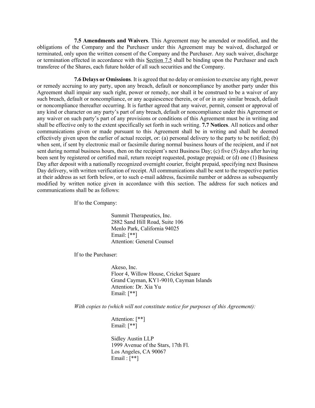 7.5 Amendments and Waivers. This Agreement may be amended or modified, and the obligations of the Company and the Purchaser under this Agreement may be waived, discharged or terminated, only upon the written consent of the Company and the Purchaser. Any such waiver, discharge or termination effected in accordance with this Section 7.5 shall be binding upon the Purchaser and each transferee of the Shares, each future holder of all such securities and the Company. 7.6 Delays or Omissions. It is agreed that no delay or omission to exercise any right, power or remedy accruing to any party, upon any breach, default or noncompliance by another party under this Agreement shall impair any such right, power or remedy, nor shall it be construed to be a waiver of any such breach, default or noncompliance, or any acquiescence therein, or of or in any similar breach, default or noncompliance thereafter occurring. It is further agreed that any waiver, permit, consent or approval of any kind or character on any party’s part of any breach, default or noncompliance under this Agreement or any waiver on such party’s part of any provisions or conditions of this Agreement must be in writing and shall be effective only to the extent specifically set forth in such writing. 7.7 Notices. All notices and other communications given or made pursuant to this Agreement shall be in writing and shall be deemed effectively given upon the earlier of actual receipt, or: (a) personal delivery to the party to be notified; (b) when sent, if sent by electronic mail or facsimile during normal business hours of the recipient, and if not sent during normal business hours, then on the recipient’s next Business Day; (c) five (5) days after having been sent by registered or certified mail, return receipt requested, postage prepaid; or (d) one (1) Business Day after deposit with a nationally recognized overnight courier, freight prepaid, specifying next Business Day delivery, with written verification of receipt. All communications shall be sent to the respective parties at their address as set forth below, or to such e-mail address, facsimile number or address as subsequently modified by written notice given in accordance with this section. The address for such notices and communications shall be as follows: If to the Company: Summit Therapeutics, Inc. 2882 Sand Hill Road, Suite 106 Menlo Park, California 94025 Email: [**] Attention: General Counsel If to the Purchaser: Akeso, Inc. Floor 4, Willow House, Cricket Square Grand Cayman, KY1‐9010, Cayman Islands Attention: Dr. Xia Yu Email: [**] With copies to (which will not constitute notice for purposes of this Agreement): Attention: [**] Email: [**] Sidley Austin LLP 1999 Avenue of the Stars, 17th Fl. Los Angeles, CA 90067 Email : [**]