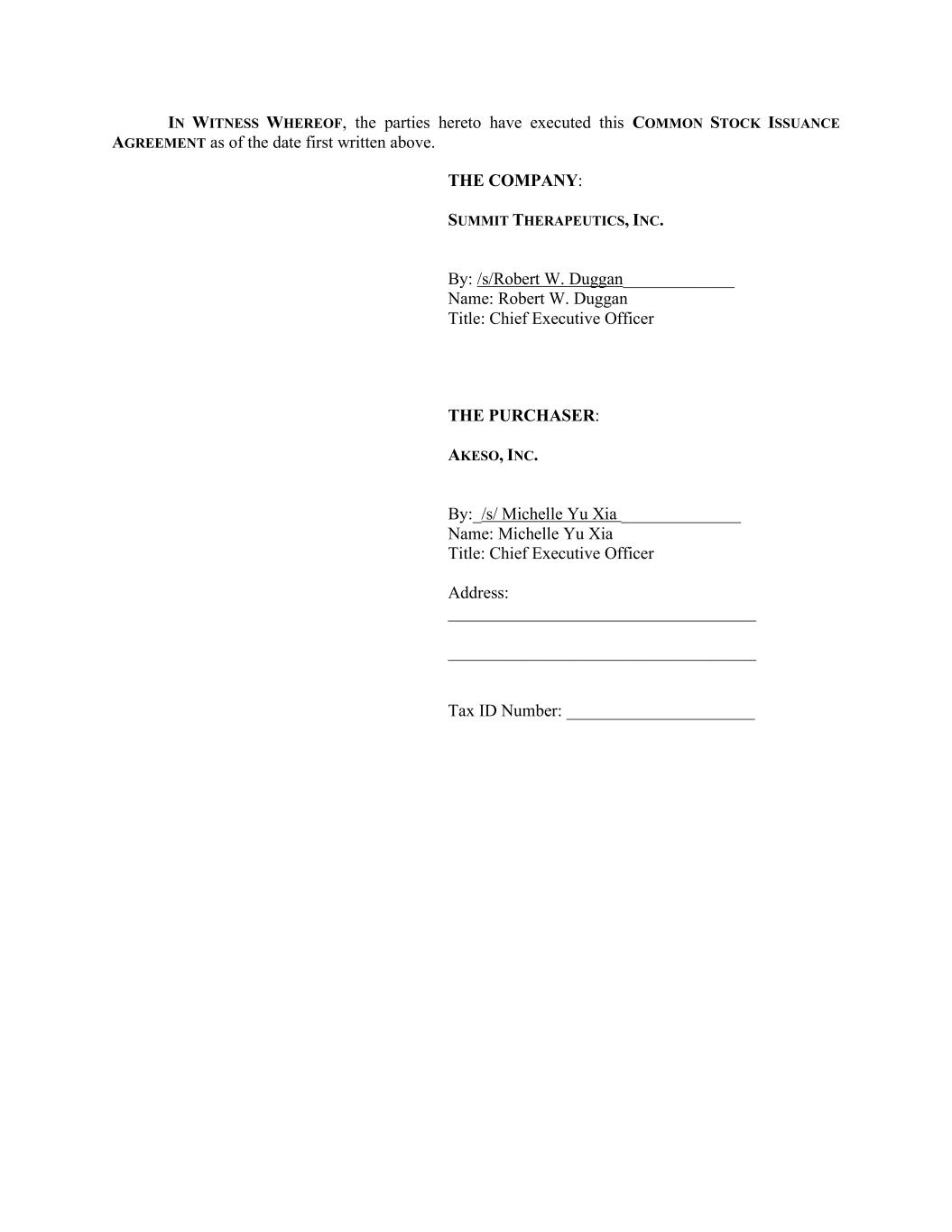 IN WITNESS WHEREOF, the parties hereto have executed this COMMON STOCK ISSUANCE AGREEMENT as of the date first written above. THE COMPANY: SUMMIT THERAPEUTICS, INC. By: /s/Robert W. Duggan_____________ Name: Robert W. Duggan Title: Chief Executive Officer THE PURCHASER: AKESO, INC. By:_/s/ Michelle Yu Xia ______________ Name: Michelle Yu Xia Title: Chief Executive Officer Address: ____________________________________ ____________________________________ Tax ID Number: ______________________