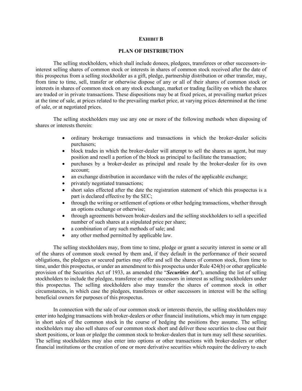 EXHIBIT B PLAN OF DISTRIBUTION The selling stockholders, which shall include donees, pledgees, transferees or other successors-in- interest selling shares of common stock or interests in shares of common stock received after the date of this prospectus from a selling stockholder as a gift, pledge, partnership distribution or other transfer, may, from time to time, sell, transfer or otherwise dispose of any or all of their shares of common stock or interests in shares of common stock on any stock exchange, market or trading facility on which the shares are traded or in private transactions. These dispositions may be at fixed prices, at prevailing market prices at the time of sale, at prices related to the prevailing market price, at varying prices determined at the time of sale, or at negotiated prices. The selling stockholders may use any one or more of the following methods when disposing of shares or interests therein: • ordinary brokerage transactions and transactions in which the broker-dealer solicits purchasers; • block trades in which the broker-dealer will attempt to sell the shares as agent, but may position and resell a portion of the block as principal to facilitate the transaction; • purchases by a broker-dealer as principal and resale by the broker-dealer for its own account; • an exchange distribution in accordance with the rules of the applicable exchange; • privately negotiated transactions; • short sales effected after the date the registration statement of which this prospectus is a part is declared effective by the SEC; • through the writing or settlement of options or other hedging transactions, whether through an options exchange or otherwise; • through agreements between broker-dealers and the selling stockholders to sell a specified number of such shares at a stipulated price per share; • a combination of any such methods of sale; and • any other method permitted by applicable law. The selling stockholders may, from time to time, pledge or grant a security interest in some or all of the shares of common stock owned by them and, if they default in the performance of their secured obligations, the pledgees or secured parties may offer and sell the shares of common stock, from time to time, under this prospectus, or under an amendment to this prospectus under Rule 424(b) or other applicable provision of the Securities Act of 1933, as amended (the “Securities Act”), amending the list of selling stockholders to include the pledgee, transferee or other successors in interest as selling stockholders under this prospectus. The selling stockholders also may transfer the shares of common stock in other circumstances, in which case the pledgees, transferees or other successors in interest will be the selling beneficial owners for purposes of this prospectus. In connection with the sale of our common stock or interests therein, the selling stockholders may enter into hedging transactions with broker-dealers or other financial institutions, which may in turn engage in short sales of the common stock in the course of hedging the positions they assume. The selling stockholders may also sell shares of our common stock short and deliver these securities to close out their short positions, or loan or pledge the common stock to broker-dealers that in turn may sell these securities. The selling stockholders may also enter into options or other transactions with broker-dealers or other financial institutions or the creation of one or more derivative securities which require the delivery to each