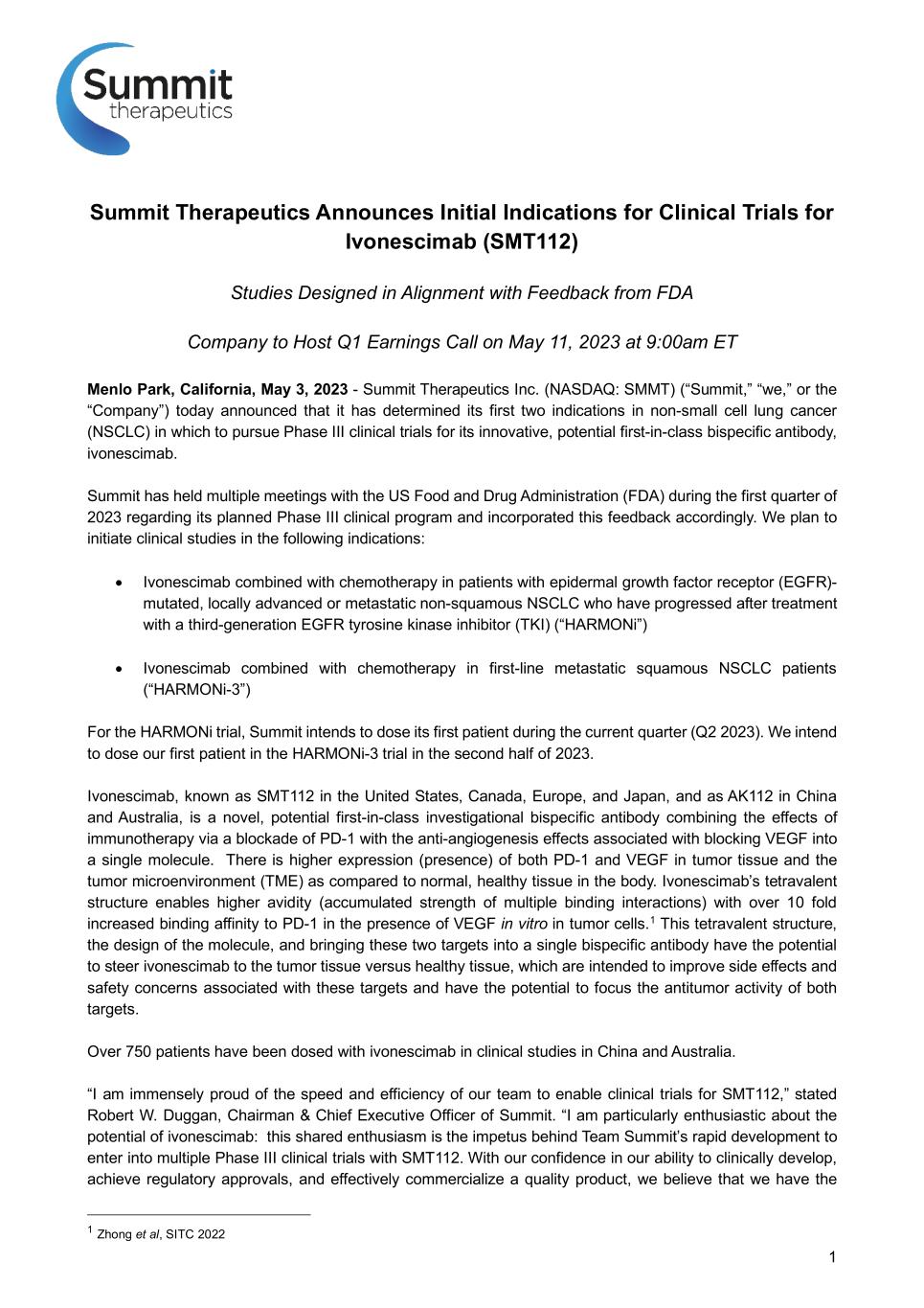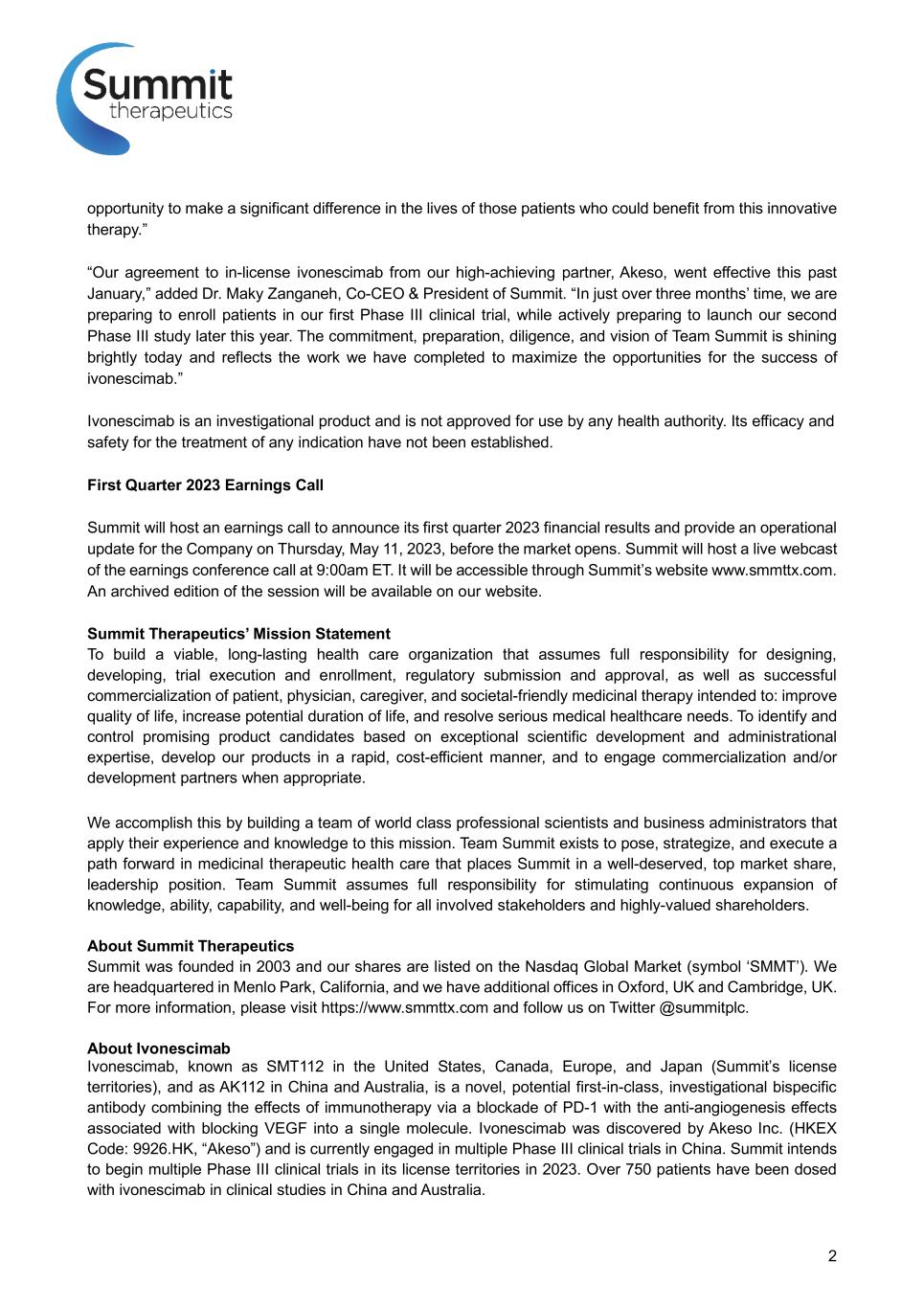 2 opportunity to make a significant difference in the lives of those patients who could benefit from this innovative therapy.” “Our agreement to in-license ivonescimab from our high-achieving partner, Akeso, went effective this past January,” added Dr. Maky Zanganeh, Co-CEO & President of Summit. “In just over three months’ time, we are preparing to enroll patients in our first Phase III clinical trial, while actively preparing to launch our second Phase III study later this year. The commitment, preparation, diligence, and vision of Team Summit is shining brightly today and reflects the work we have completed to maximize the opportunities for the success of ivonescimab.” Ivonescimab is an investigational product and is not approved for use by any health authority. Its efficacy and safety for the treatment of any indication have not been established. First Quarter 2023 Earnings Call Summit will host an earnings call to announce its first quarter 2023 financial results and provide an operational update for the Company on Thursday, May 11, 2023, before the market opens. Summit will host a live webcast of the earnings conference call at 9:00am ET. It will be accessible through Summit’s website www.smmttx.com. An archived edition of the session will be available on our website. Summit Therapeutics’ Mission Statement To build a viable, long-lasting health care organization that assumes full responsibility for designing, developing, trial execution and enrollment, regulatory submission and approval, as well as successful commercialization of patient, physician, caregiver, and societal-friendly medicinal therapy intended to: improve quality of life, increase potential duration of life, and resolve serious medical healthcare needs. To identify and control promising product candidates based on exceptional scientific development and administrational expertise, develop our products in a rapid, cost-efficient manner, and to engage commercialization and/or development partners when appropriate. We accomplish this by building a team of world class professional scientists and business administrators that apply their experience and knowledge to this mission. Team Summit exists to pose, strategize, and execute a path forward in medicinal therapeutic health care that places Summit in a well-deserved, top market share, leadership position. Team Summit assumes full responsibility for stimulating continuous expansion of knowledge, ability, capability, and well-being for all involved stakeholders and highly-valued shareholders. About Summit Therapeutics Summit was founded in 2003 and our shares are listed on the Nasdaq Global Market (symbol ‘SMMT’). We are headquartered in Menlo Park, California, and we have additional offices in Oxford, UK and Cambridge, UK. For more information, please visit https://www.smmttx.com and follow us on Twitter @summitplc. About Ivonescimab Ivonescimab, known as SMT112 in the United States, Canada, Europe, and Japan (Summit’s license territories), and as AK112 in China and Australia, is a novel, potential first-in-class, investigational bispecific antibody combining the effects of immunotherapy via a blockade of PD-1 with the anti-angiogenesis effects associated with blocking VEGF into a single molecule. Ivonescimab was discovered by Akeso Inc. (HKEX Code: 9926.HK, “Akeso”) and is currently engaged in multiple Phase III clinical trials in China. Summit intends to begin multiple Phase III clinical trials in its license territories in 2023. Over 750 patients have been dosed with ivonescimab in clinical studies in China and Australia.