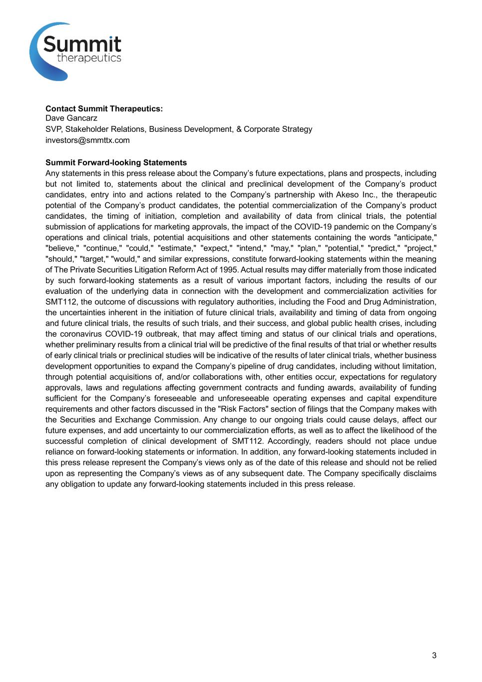 3 Contact Summit Therapeutics: Dave Gancarz SVP, Stakeholder Relations, Business Development, & Corporate Strategy investors@smmttx.com Summit Forward-looking Statements Any statements in this press release about the Company’s future expectations, plans and prospects, including but not limited to, statements about the clinical and preclinical development of the Company’s product candidates, entry into and actions related to the Company’s partnership with Akeso Inc., the therapeutic potential of the Company’s product candidates, the potential commercialization of the Company’s product candidates, the timing of initiation, completion and availability of data from clinical trials, the potential submission of applications for marketing approvals, the impact of the COVID-19 pandemic on the Company’s operations and clinical trials, potential acquisitions and other statements containing the words "anticipate," "believe," "continue," "could," "estimate," "expect," "intend," "may," "plan," "potential," "predict," "project," "should," "target," "would," and similar expressions, constitute forward-looking statements within the meaning of The Private Securities Litigation Reform Act of 1995. Actual results may differ materially from those indicated by such forward-looking statements as a result of various important factors, including the results of our evaluation of the underlying data in connection with the development and commercialization activities for SMT112, the outcome of discussions with regulatory authorities, including the Food and Drug Administration, the uncertainties inherent in the initiation of future clinical trials, availability and timing of data from ongoing and future clinical trials, the results of such trials, and their success, and global public health crises, including the coronavirus COVID-19 outbreak, that may affect timing and status of our clinical trials and operations, whether preliminary results from a clinical trial will be predictive of the final results of that trial or whether results of early clinical trials or preclinical studies will be indicative of the results of later clinical trials, whether business development opportunities to expand the Company’s pipeline of drug candidates, including without limitation, through potential acquisitions of, and/or collaborations with, other entities occur, expectations for regulatory approvals, laws and regulations affecting government contracts and funding awards, availability of funding sufficient for the Company’s foreseeable and unforeseeable operating expenses and capital expenditure requirements and other factors discussed in the "Risk Factors" section of filings that the Company makes with the Securities and Exchange Commission. Any change to our ongoing trials could cause delays, affect our future expenses, and add uncertainty to our commercialization efforts, as well as to affect the likelihood of the successful completion of clinical development of SMT112. Accordingly, readers should not place undue reliance on forward-looking statements or information. In addition, any forward-looking statements included in this press release represent the Company’s views only as of the date of this release and should not be relied upon as representing the Company’s views as of any subsequent date. The Company specifically disclaims any obligation to update any forward-looking statements included in this press release.