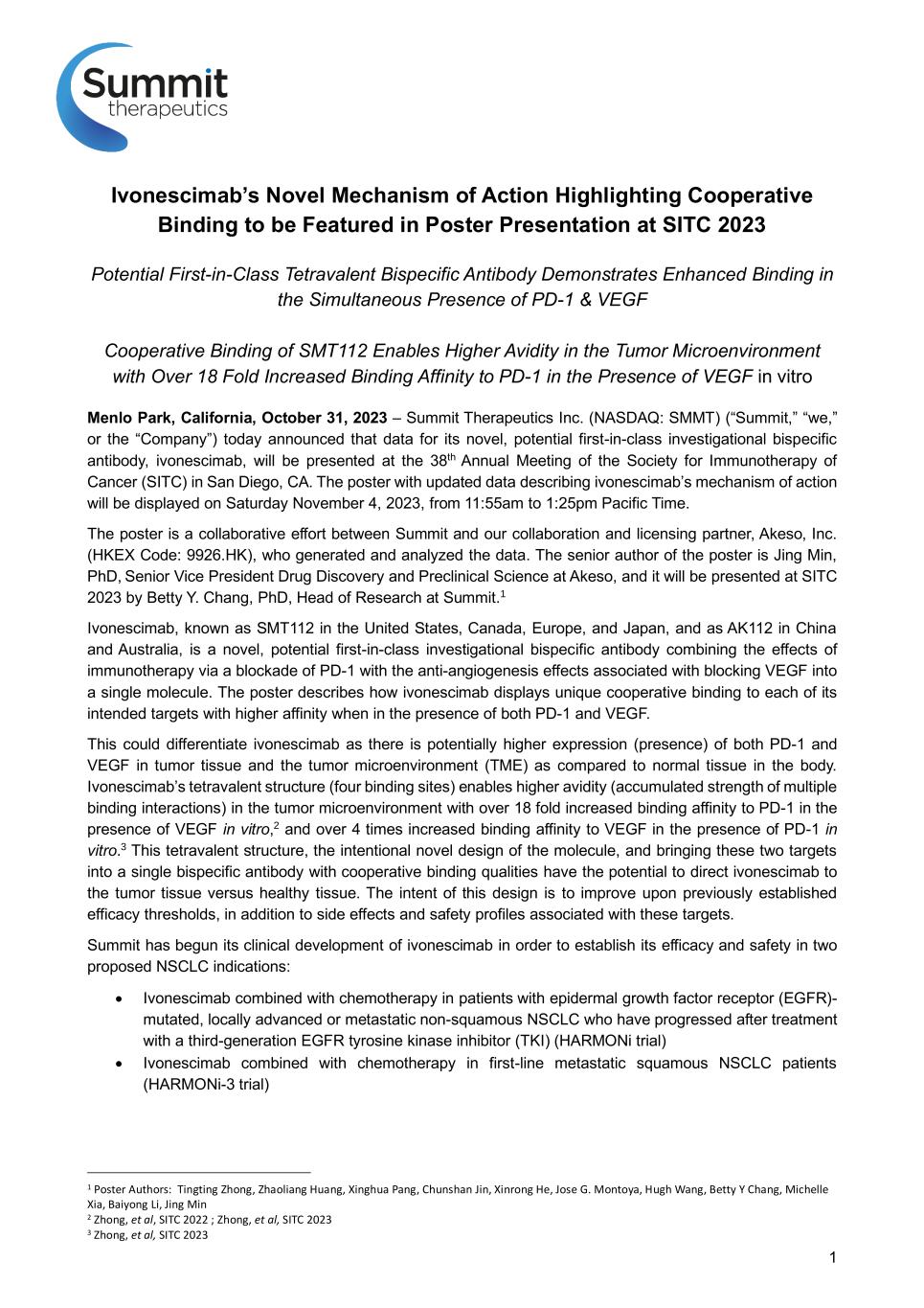 1 Ivonescimab’s Novel Mechanism of Action Highlighting Cooperative Binding to be Featured in Poster Presentation at SITC 2023 Potential First-in-Class Tetravalent Bispecific Antibody Demonstrates Enhanced Binding in the Simultaneous Presence of PD-1 & VEGF Cooperative Binding of SMT112 Enables Higher Avidity in the Tumor Microenvironment with Over 18 Fold Increased Binding Affinity to PD-1 in the Presence of VEGF in vitro Menlo Park, California, October 31, 2023 – Summit Therapeutics Inc. (NASDAQ: SMMT) (“Summit,” “we,” or the “Company”) today announced that data for its novel, potential first-in-class investigational bispecific antibody, ivonescimab, will be presented at the 38th Annual Meeting of the Society for Immunotherapy of Cancer (SITC) in San Diego, CA. The poster with updated data describing ivonescimab’s mechanism of action will be displayed on Saturday November 4, 2023, from 11:55am to 1:25pm Pacific Time. The poster is a collaborative effort between Summit and our collaboration and licensing partner, Akeso, Inc. (HKEX Code: 9926.HK), who generated and analyzed the data. The senior author of the poster is Jing Min, PhD, Senior Vice President Drug Discovery and Preclinical Science at Akeso, and it will be presented at SITC 2023 by Betty Y. Chang, PhD, Head of Research at Summit.1 Ivonescimab, known as SMT112 in the United States, Canada, Europe, and Japan, and as AK112 in China and Australia, is a novel, potential first-in-class investigational bispecific antibody combining the effects of immunotherapy via a blockade of PD-1 with the anti-angiogenesis effects associated with blocking VEGF into a single molecule. The poster describes how ivonescimab displays unique cooperative binding to each of its intended targets with higher affinity when in the presence of both PD-1 and VEGF. This could differentiate ivonescimab as there is potentially higher expression (presence) of both PD-1 and VEGF in tumor tissue and the tumor microenvironment (TME) as compared to normal tissue in the body. Ivonescimab’s tetravalent structure (four binding sites) enables higher avidity (accumulated strength of multiple binding interactions) in the tumor microenvironment with over 18 fold increased binding affinity to PD-1 in the presence of VEGF in vitro,2 and over 4 times increased binding affinity to VEGF in the presence of PD-1 in vitro.3 This tetravalent structure, the intentional novel design of the molecule, and bringing these two targets into a single bispecific antibody with cooperative binding qualities have the potential to direct ivonescimab to the tumor tissue versus healthy tissue. The intent of this design is to improve upon previously established efficacy thresholds, in addition to side effects and safety profiles associated with these targets. Summit has begun its clinical development of ivonescimab in order to establish its efficacy and safety in two proposed NSCLC indications: • Ivonescimab combined with chemotherapy in patients with epidermal growth factor receptor (EGFR)- mutated, locally advanced or metastatic non-squamous NSCLC who have progressed after treatment with a third-generation EGFR tyrosine kinase inhibitor (TKI) (HARMONi trial) • Ivonescimab combined with chemotherapy in first-line metastatic squamous NSCLC patients (HARMONi-3 trial) 1 Poster Authors: Tingting Zhong, Zhaoliang Huang, Xinghua Pang, Chunshan Jin, Xinrong He, Jose G. Montoya, Hugh Wang, Betty Y Chang, Michelle Xia, Baiyong Li, Jing Min 2 Zhong, et al, SITC 2022 ; Zhong, et al, SITC 2023 3 Zhong, et al, SITC 2023