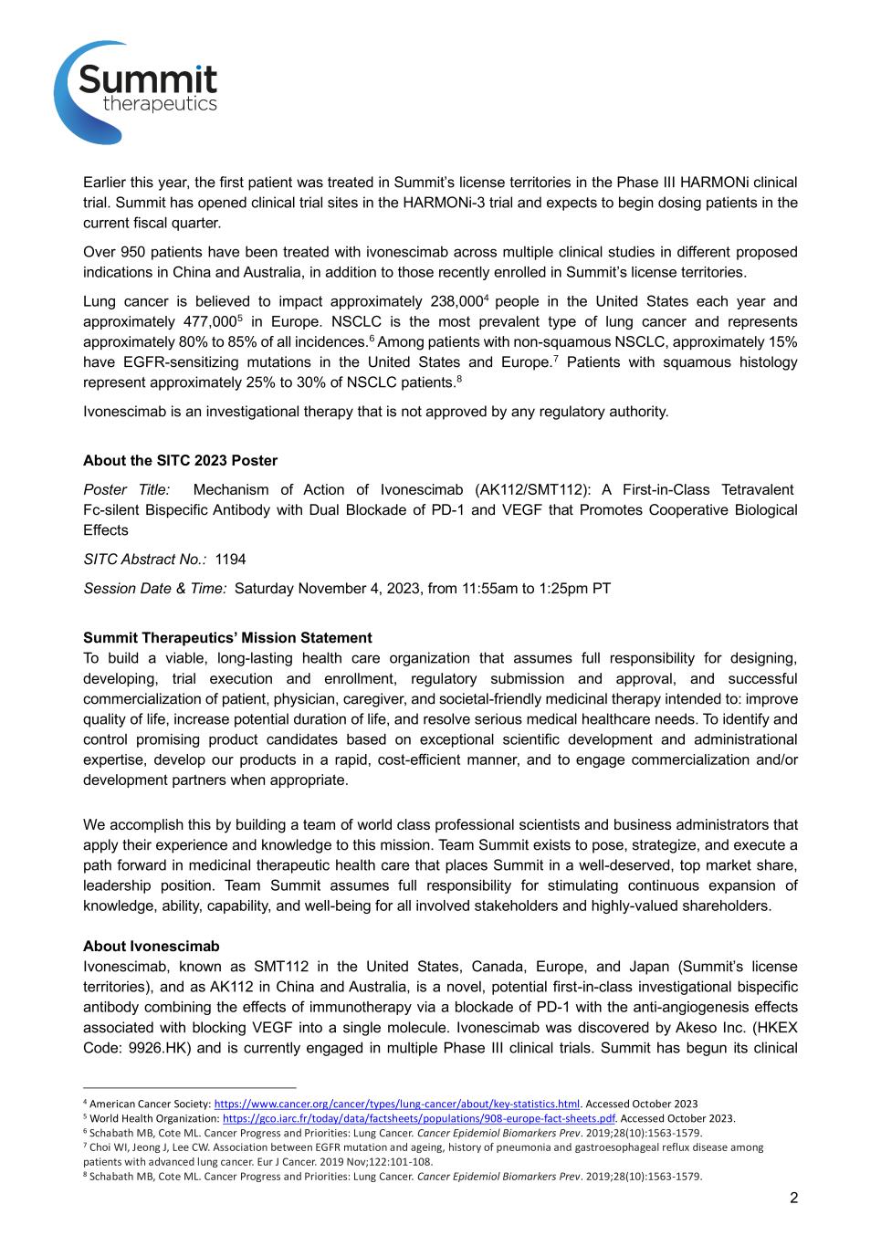 2 Earlier this year, the first patient was treated in Summit’s license territories in the Phase III HARMONi clinical trial. Summit has opened clinical trial sites in the HARMONi-3 trial and expects to begin dosing patients in the current fiscal quarter. Over 950 patients have been treated with ivonescimab across multiple clinical studies in different proposed indications in China and Australia, in addition to those recently enrolled in Summit’s license territories. Lung cancer is believed to impact approximately 238,0004 people in the United States each year and approximately 477,0005 in Europe. NSCLC is the most prevalent type of lung cancer and represents approximately 80% to 85% of all incidences.6 Among patients with non-squamous NSCLC, approximately 15% have EGFR-sensitizing mutations in the United States and Europe.7 Patients with squamous histology represent approximately 25% to 30% of NSCLC patients.8 Ivonescimab is an investigational therapy that is not approved by any regulatory authority. About the SITC 2023 Poster Poster Title: Mechanism of Action of Ivonescimab (AK112/SMT112): A First-in-Class Tetravalent Fc-silent Bispecific Antibody with Dual Blockade of PD-1 and VEGF that Promotes Cooperative Biological Effects SITC Abstract No.: 1194 Session Date & Time: Saturday November 4, 2023, from 11:55am to 1:25pm PT Summit Therapeutics’ Mission Statement To build a viable, long-lasting health care organization that assumes full responsibility for designing, developing, trial execution and enrollment, regulatory submission and approval, and successful commercialization of patient, physician, caregiver, and societal-friendly medicinal therapy intended to: improve quality of life, increase potential duration of life, and resolve serious medical healthcare needs. To identify and control promising product candidates based on exceptional scientific development and administrational expertise, develop our products in a rapid, cost-efficient manner, and to engage commercialization and/or development partners when appropriate. We accomplish this by building a team of world class professional scientists and business administrators that apply their experience and knowledge to this mission. Team Summit exists to pose, strategize, and execute a path forward in medicinal therapeutic health care that places Summit in a well-deserved, top market share, leadership position. Team Summit assumes full responsibility for stimulating continuous expansion of knowledge, ability, capability, and well-being for all involved stakeholders and highly-valued shareholders. About Ivonescimab Ivonescimab, known as SMT112 in the United States, Canada, Europe, and Japan (Summit’s license territories), and as AK112 in China and Australia, is a novel, potential first-in-class investigational bispecific antibody combining the effects of immunotherapy via a blockade of PD-1 with the anti-angiogenesis effects associated with blocking VEGF into a single molecule. Ivonescimab was discovered by Akeso Inc. (HKEX Code: 9926.HK) and is currently engaged in multiple Phase III clinical trials. Summit has begun its clinical 4 American Cancer Society: https://www.cancer.org/cancer/types/lung-cancer/about/key-statistics.html. Accessed October 2023 5 World Health Organization: https://gco.iarc.fr/today/data/factsheets/populations/908-europe-fact-sheets.pdf. Accessed October 2023. 6 Schabath MB, Cote ML. Cancer Progress and Priorities: Lung Cancer. Cancer Epidemiol Biomarkers Prev. 2019;28(10):1563-1579. 7 Choi WI, Jeong J, Lee CW. Association between EGFR mutation and ageing, history of pneumonia and gastroesophageal reflux disease among patients with advanced lung cancer. Eur J Cancer. 2019 Nov;122:101-108. 8 Schabath MB, Cote ML. Cancer Progress and Priorities: Lung Cancer. Cancer Epidemiol Biomarkers Prev. 2019;28(10):1563-1579.