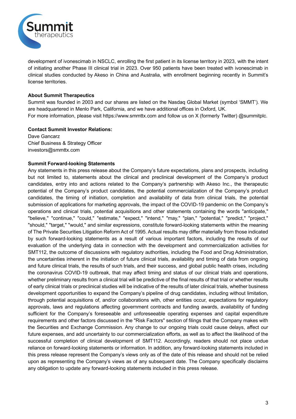 3 development of ivonescimab in NSCLC, enrolling the first patient in its license territory in 2023, with the intent of initiating another Phase III clinical trial in 2023. Over 950 patients have been treated with ivonescimab in clinical studies conducted by Akeso in China and Australia, with enrollment beginning recently in Summit’s license territories. About Summit Therapeutics Summit was founded in 2003 and our shares are listed on the Nasdaq Global Market (symbol ‘SMMT’). We are headquartered in Menlo Park, California, and we have additional offices in Oxford, UK. For more information, please visit https://www.smmttx.com and follow us on X (formerly Twitter) @summitplc. Contact Summit Investor Relations: Dave Gancarz Chief Business & Strategy Officer investors@smmttx.com Summit Forward-looking Statements Any statements in this press release about the Company’s future expectations, plans and prospects, including but not limited to, statements about the clinical and preclinical development of the Company’s product candidates, entry into and actions related to the Company’s partnership with Akeso Inc., the therapeutic potential of the Company’s product candidates, the potential commercialization of the Company’s product candidates, the timing of initiation, completion and availability of data from clinical trials, the potential submission of applications for marketing approvals, the impact of the COVID-19 pandemic on the Company’s operations and clinical trials, potential acquisitions and other statements containing the words "anticipate," "believe," "continue," "could," "estimate," "expect," "intend," "may," "plan," "potential," "predict," "project," "should," "target," "would," and similar expressions, constitute forward-looking statements within the meaning of The Private Securities Litigation Reform Act of 1995. Actual results may differ materially from those indicated by such forward-looking statements as a result of various important factors, including the results of our evaluation of the underlying data in connection with the development and commercialization activities for SMT112, the outcome of discussions with regulatory authorities, including the Food and Drug Administration, the uncertainties inherent in the initiation of future clinical trials, availability and timing of data from ongoing and future clinical trials, the results of such trials, and their success, and global public health crises, including the coronavirus COVID-19 outbreak, that may affect timing and status of our clinical trials and operations, whether preliminary results from a clinical trial will be predictive of the final results of that trial or whether results of early clinical trials or preclinical studies will be indicative of the results of later clinical trials, whether business development opportunities to expand the Company’s pipeline of drug candidates, including without limitation, through potential acquisitions of, and/or collaborations with, other entities occur, expectations for regulatory approvals, laws and regulations affecting government contracts and funding awards, availability of funding sufficient for the Company’s foreseeable and unforeseeable operating expenses and capital expenditure requirements and other factors discussed in the "Risk Factors" section of filings that the Company makes with the Securities and Exchange Commission. Any change to our ongoing trials could cause delays, affect our future expenses, and add uncertainty to our commercialization efforts, as well as to affect the likelihood of the successful completion of clinical development of SMT112. Accordingly, readers should not place undue reliance on forward-looking statements or information. In addition, any forward-looking statements included in this press release represent the Company’s views only as of the date of this release and should not be relied upon as representing the Company’s views as of any subsequent date. The Company specifically disclaims any obligation to update any forward-looking statements included in this press release.