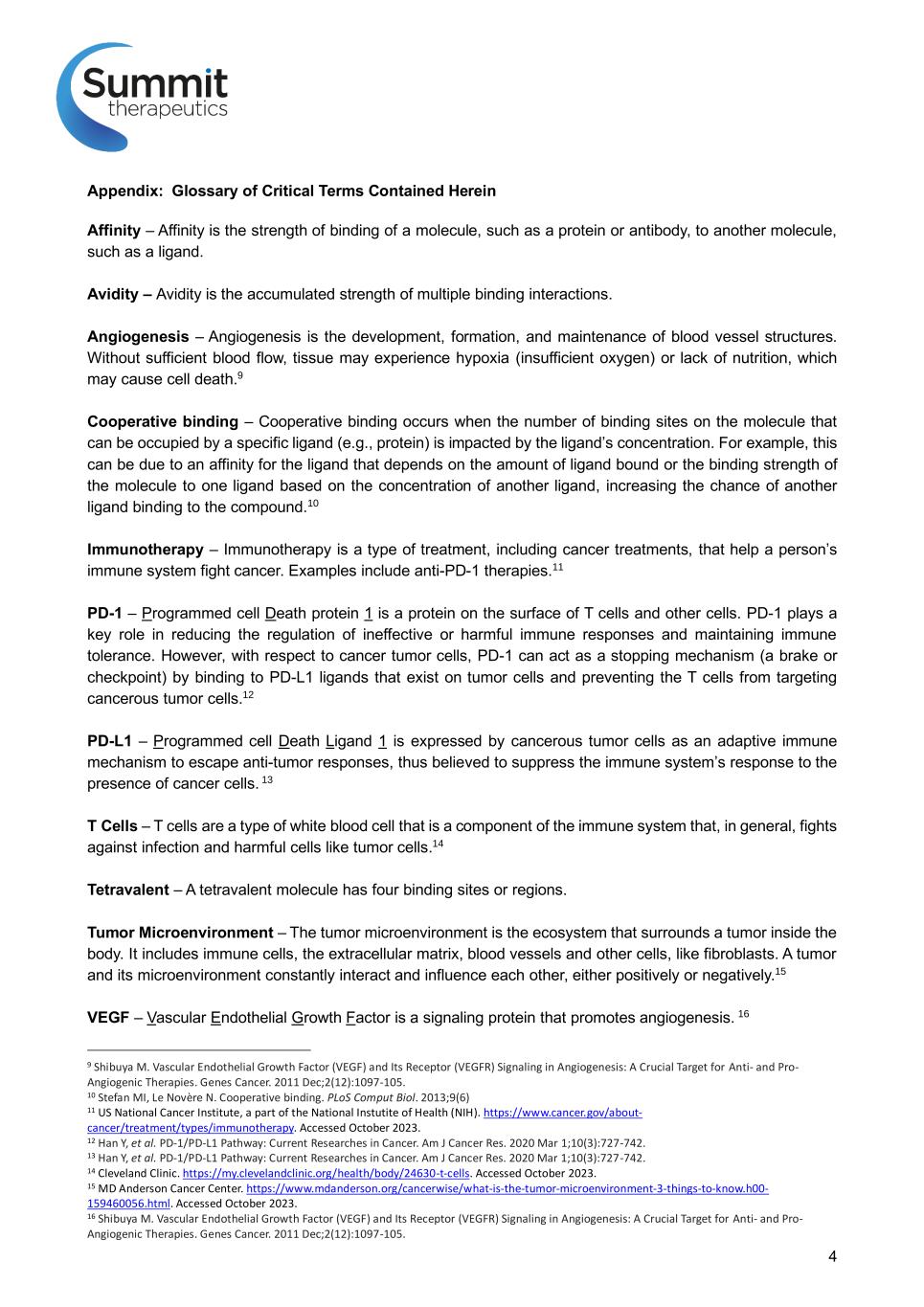 4 Appendix: Glossary of Critical Terms Contained Herein Affinity – Affinity is the strength of binding of a molecule, such as a protein or antibody, to another molecule, such as a ligand. Avidity – Avidity is the accumulated strength of multiple binding interactions. Angiogenesis – Angiogenesis is the development, formation, and maintenance of blood vessel structures. Without sufficient blood flow, tissue may experience hypoxia (insufficient oxygen) or lack of nutrition, which may cause cell death.9 Cooperative binding – Cooperative binding occurs when the number of binding sites on the molecule that can be occupied by a specific ligand (e.g., protein) is impacted by the ligand’s concentration. For example, this can be due to an affinity for the ligand that depends on the amount of ligand bound or the binding strength of the molecule to one ligand based on the concentration of another ligand, increasing the chance of another ligand binding to the compound.10 Immunotherapy – Immunotherapy is a type of treatment, including cancer treatments, that help a person’s immune system fight cancer. Examples include anti-PD-1 therapies.11 PD-1 – Programmed cell Death protein 1 is a protein on the surface of T cells and other cells. PD-1 plays a key role in reducing the regulation of ineffective or harmful immune responses and maintaining immune tolerance. However, with respect to cancer tumor cells, PD-1 can act as a stopping mechanism (a brake or checkpoint) by binding to PD-L1 ligands that exist on tumor cells and preventing the T cells from targeting cancerous tumor cells.12 PD-L1 – Programmed cell Death Ligand 1 is expressed by cancerous tumor cells as an adaptive immune mechanism to escape anti-tumor responses, thus believed to suppress the immune system’s response to the presence of cancer cells. 13 T Cells – T cells are a type of white blood cell that is a component of the immune system that, in general, fights against infection and harmful cells like tumor cells.14 Tetravalent – A tetravalent molecule has four binding sites or regions. Tumor Microenvironment – The tumor microenvironment is the ecosystem that surrounds a tumor inside the body. It includes immune cells, the extracellular matrix, blood vessels and other cells, like fibroblasts. A tumor and its microenvironment constantly interact and influence each other, either positively or negatively.15 VEGF – Vascular Endothelial Growth Factor is a signaling protein that promotes angiogenesis. 16 9 Shibuya M. Vascular Endothelial Growth Factor (VEGF) and Its Receptor (VEGFR) Signaling in Angiogenesis: A Crucial Target for Anti- and Pro- Angiogenic Therapies. Genes Cancer. 2011 Dec;2(12):1097-105. 10 Stefan MI, Le Novère N. Cooperative binding. PLoS Comput Biol. 2013;9(6) 11 US National Cancer Institute, a part of the National Instutite of Health (NIH). https://www.cancer.gov/about- cancer/treatment/types/immunotherapy. Accessed October 2023. 12 Han Y, et al. PD-1/PD-L1 Pathway: Current Researches in Cancer. Am J Cancer Res. 2020 Mar 1;10(3):727-742. 13 Han Y, et al. PD-1/PD-L1 Pathway: Current Researches in Cancer. Am J Cancer Res. 2020 Mar 1;10(3):727-742. 14 Cleveland Clinic. https://my.clevelandclinic.org/health/body/24630-t-cells. Accessed October 2023. 15 MD Anderson Cancer Center. https://www.mdanderson.org/cancerwise/what-is-the-tumor-microenvironment-3-things-to-know.h00- 159460056.html. Accessed October 2023. 16 Shibuya M. Vascular Endothelial Growth Factor (VEGF) and Its Receptor (VEGFR) Signaling in Angiogenesis: A Crucial Target for Anti- and Pro- Angiogenic Therapies. Genes Cancer. 2011 Dec;2(12):1097-105.