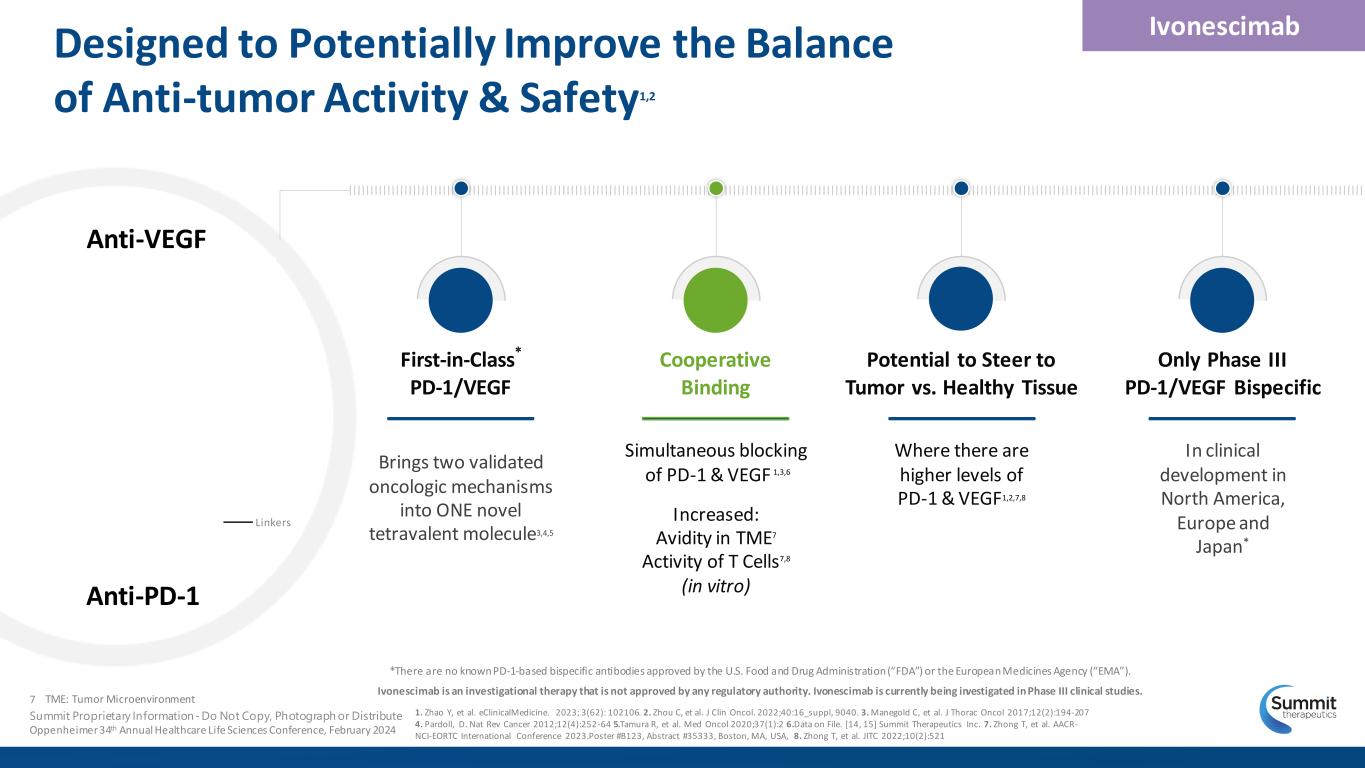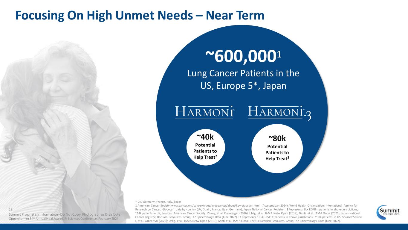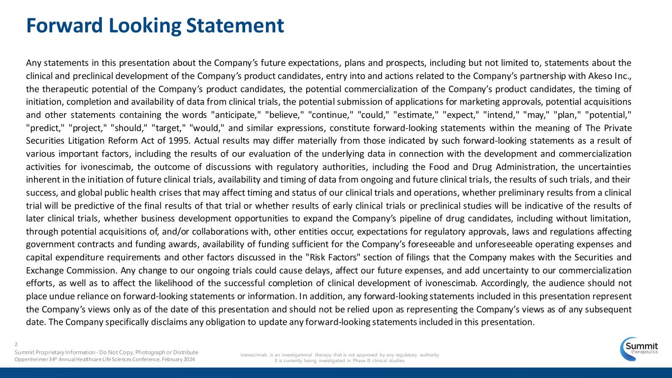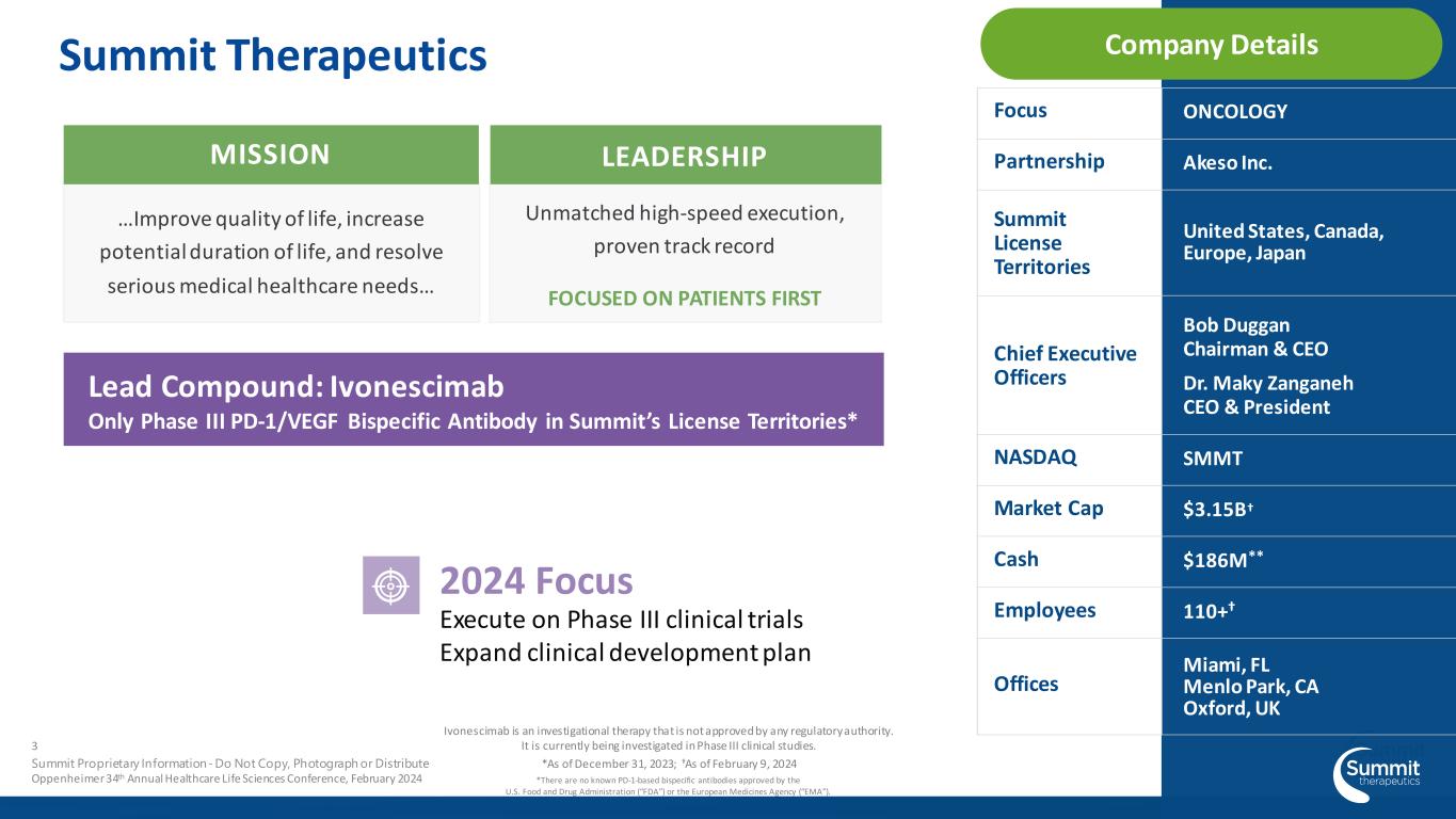 Forward Looking Statement Ivonescimab is an investigational therapy that is not approved by any regulatory authority. It is currently being investigated in Phase III clinical studies. 2 Summit Proprietary Information - Do Not Copy, Photograph or Distribute Oppenheimer 34th Annual Healthcare Life Sciences Conference, February 2024 Any statements in this presentation about the Company’s future expectations, plans and prospects, including but not limited to, statements about the clinical and preclinical development of the Company’s product candidates, entry into and actions related to the Company’s partnership with Akeso Inc., the therapeutic potential of the Company’s product candidates, the potential commercialization of the Company’s product candidates, the timing of initiation, completion and availability of data from clinical trials, the potential submission of applications for marketing approvals, potential acquisitions and other statements containing the words "anticipate," "believe," "continue," "could," "estimate," "expect," "intend," "may," "plan," "potential," "predict," "project," "should," "target," "would," and similar expressions, constitute forward-looking statements within the meaning of The Private Securities Litigation Reform Act of 1995. Actual results may differ materially from those indicated by such forward-looking statements as a result of various important factors, including the results of our evaluation of the underlying data in connection with the development and commercialization activities for ivonescimab, the outcome of discussions with regulatory authorities, including the Food and Drug Administration, the uncertainties inherent in the initiation of future clinical trials, availability and timing of data from ongoing and future clinical trials, the results of such trials, and their success, and global public health crises that may affect timing and status of our clinical trials and operations, whether preliminary results from a clinical trial will be predictive of the final results of that trial or whether results of early clinical trials or preclinical studies will be indicative of the results of later clinical trials, whether business development opportunities to expand the Company’s pipeline of drug candidates, including without limitation, through potential acquisitions of, and/or collaborations with, other entities occur, expectations for regulatory approvals, laws and regulations affecting government contracts and funding awards, availability of funding sufficient for the Company’s foreseeable and unforeseeable operating expenses and capital expenditure requirements and other factors discussed in the "Risk Factors" section of filings that the Company makes with the Securities and Exchange Commission. Any change to our ongoing trials could cause delays, affect our future expenses, and add uncertainty to our commercialization efforts, as well as to affect the likelihood of the successful completion of clinical development of ivonescimab. Accordingly, the audience should not place undue reliance on forward-looking statements or information. In addition, any forward-looking statements included in this presentation represent the Company’s views only as of the date of this presentation and should not be relied upon as representing the Company’s views as of any subsequent date. The Company specifically disclaims any obligation to update any forward-looking statements included in this presentation.