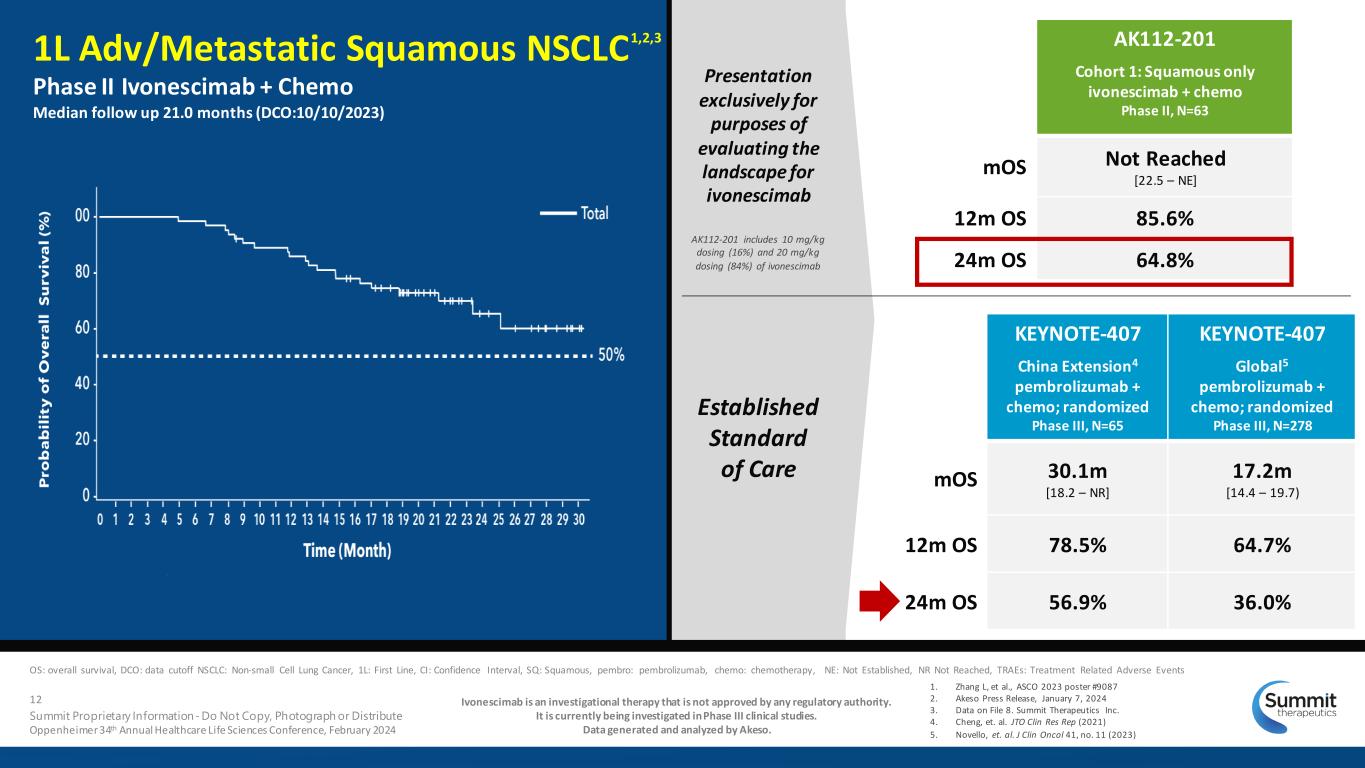 AK112-201 Cohort 1: Squamous only; ivonescimab + chemo Phase II, N=63 ORR† 67% DCR† 95% mDOR† 12.8m mPFS [95% CI] 11.1m [9.5 – 16.3] KEYNOTE-407 China Extension4 pembrolizumab + chemo; randomized Phase III, N=65 KEYNOTE-407 Global5 pembrolizumab + chemo; randomized Phase III, N=278 ORR† 80% 63% DCR† 91% 86% mDOR 7.1m 8.8m mPFS [95% CI] 8.3m [6.2 – 10.5] 8.0m [6.3 – 8.4] Ivonescimab is an investigational therapy that is not approved by any regulatory authority. It is currently being investigated in Phase III clinical studies. Data generated and analyzed by Akeso. Percent Changes from Baseline in Target Lesions Sum of Diameters (N=60) ORR: Overall Response Rate, DCR: Disease Control Rate; mDOR: median Duration of Response, mPFS: median Progression Free Survival, DCO: data cutoff, NSCLC: Non-small Cell Lung Cancer, 1L: First Line, CI: Confidence Interval, SQ: Squamous, mFU: median follow-up, chemo: chemotherapy, m: month 1. Zhang L, et al., ASCO 2023 poster #9087 2. Akeso Press Release, January 7, 2024 3. Data on File 8. Summit Therapeutics Inc. 4. Cheng et. al. JTO Clin Res Rep (2021) ​ 5. Paz-Ares, et. al. Journal of Thoracic Onc (2020) 1L Adv/Metastatic Squamous NSCLC1,2,3 AK112-201 includes 10 mg/kg dosing (16%) and 20 mg/kg dosing (84%) of ivonescimab 11 Summit Proprietary Information - Do Not Copy, Photograph or Distribute Oppenheimer 34th Annual Healthcare Life Sciences Conference, February 2024 Established Standard of Care Presentation exclusively for purposes of evaluating the landscape for ivonescimab † Includes subjects with at least one post-baseline tumor assessment, ORR based on confirmed BOR; N=60 evaluable for response Phase II Ivonescimab + Chemo Median follow up 21.0 months (DCO:10/10/2023)