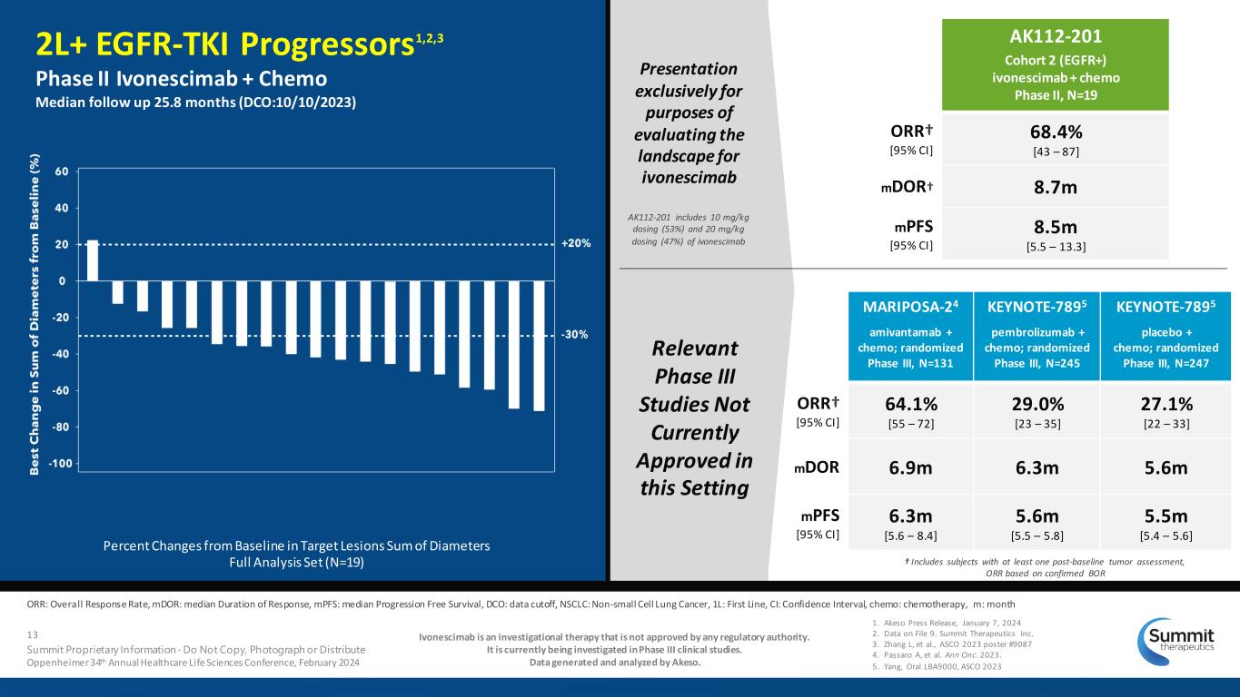 OS: overall survival, DCO: data cutoff NSCLC: Non-small Cell Lung Cancer, 1L: First Line, CI: Confidence Interval, SQ: Squamous, pembro: pembrolizumab, chemo: chemotherapy, NE: Not Established, NR Not Reached, TRAEs: Treatment Related Adverse Events Ivonescimab is an investigational therapy that is not approved by any regulatory authority. It is currently being investigated in Phase III clinical studies. Data generated and analyzed by Akeso. KEYNOTE-407 China Extension4 pembrolizumab + chemo; randomized Phase III, N=65 KEYNOTE-407 Global5 pembrolizumab + chemo; randomized Phase III, N=278 mOS 30.1m [18.2 – NR] 17.2m [14.4 – 19.7) 12m OS 78.5% 64.7% 24m OS 56.9% 36.0% 1. Zhang L, et al., ASCO 2023 poster #9087 2. Akeso Press Release, January 7, 2024 3. Data on File 8. Summit Therapeutics Inc. 4. Cheng, et. al. JTO Clin Res Rep (2021) ​ 5. Novello, et. al. J Clin Oncol 41, no. 11 (2023) 1L Adv/Metastatic Squamous NSCLC1,2,3 Phase II Ivonescimab + Chemo Median follow up 21.0 months (DCO:10/10/2023) 12 Summit Proprietary Information - Do Not Copy, Photograph or Distribute Oppenheimer 34th Annual Healthcare Life Sciences Conference, February 2024 AK112-201 Cohort 1: Squamous only ivonescimab + chemo Phase II, N=63 mOS Not Reached [22.5 – NE] 12m OS 85.6% 24m OS 64.8% AK112-201 includes 10 mg/kg dosing (16%) and 20 mg/kg dosing (84%) of ivonescimab Established Standard of Care Presentation exclusively for purposes of evaluating the landscape for ivonescimab