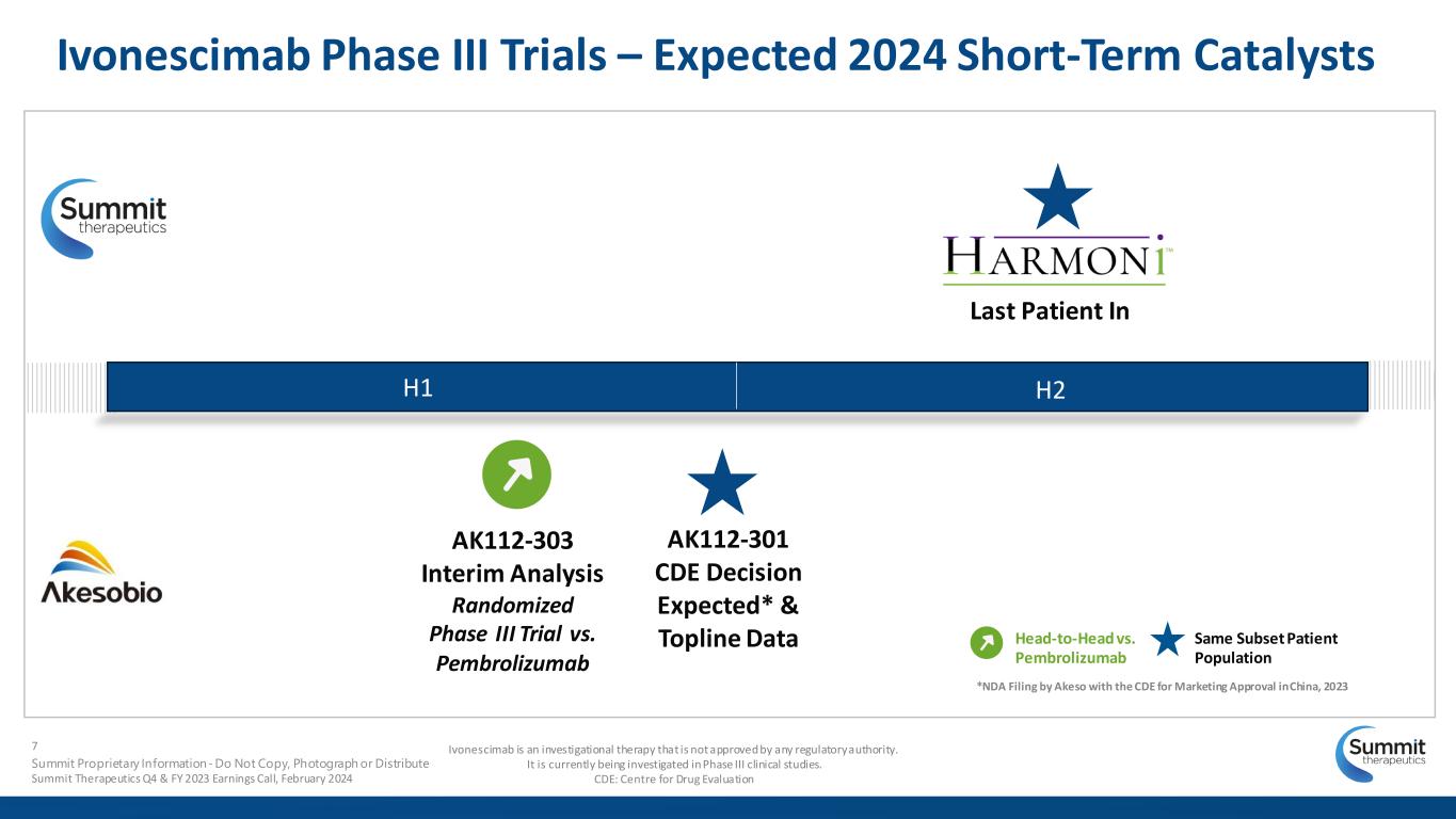 VEGF Dimer PD-1 Receptor in T Cell Increased Avidity in TME VEGF increases affinity to PD-1 by >18X4 PD-1 increases affinity to VEGF by >4X4 (in vitro) Enhanced Activity of T Cells VEGF dimer leads to potential interconnection of ivonescimab molecules, which may increase activity of T cells4,5 Ivonescimab is an investigational therapy that is not approved by any regulatory authority. Ivonescimab is currently being investigated in Phase III clinical studies Simultaneous blocking of PD-1 & VEGF1,2,3 Ivonescimab 6 Summit Proprietary Information - Do Not Copy, Photograph or Distribute Summit Therapeutics Q4 & FY 2023 Earnings Call, February 2024 Cooperative Binding Greater Than the Sum of Its Parts 1. Zhao Y. et al., eClinicalMedicine. 2023; 3(62): 102106.,; 2. Manegold C, et al. J Thorac Oncol 2017;12(2):194-207 ; 3. Data on File. [14, 15] Summit Therapeutics Inc.; 4. Zhong T, et al. AACR-NCI-EORTC International Conference 2023.Poster #B123,Abstract #35333, Boston, MA, USA,; 5. Zhong T, et al. JITC 2022;10(2):521.