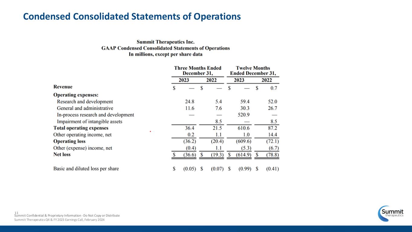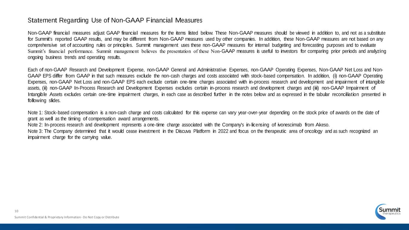 Summit Confidential & Proprietary Information - Do Not Copy or Distribute 10 Statement Regarding Use of Non-GAAP Financial Measures Non-GAAP financial measures adjust GAAP financial measures for the items listed below. These Non-GAAP measures should be viewed in addition to, and not as a substitute for Summit's reported GAAP results, and may be different from Non-GAAP measures used by other companies. In addition, these Non-GAAP measures are not based on any comprehensive set of accounting rules or principles. Summit management uses these non-GAAP measures for internal budgeting and forecasting purposes and to evaluate Summit’s financial performance. Summit management believes the presentation of these Non-GAAP measures is useful to investors for comparing prior periods and analyzing ongoing business trends and operating results. Each of non-GAAP Research and Development Expense, non-GAAP General and Administrative Expenses, non-GAAP Operating Expenses, Non-GAAP Net Loss and Non- GAAP EPS differ from GAAP in that such measures exclude the non-cash charges and costs associated with stock-based compensation. In addition, (i) non-GAAP Operating Expenses, non-GAAP Net Loss and non-GAAP EPS each exclude certain one-time charges associated with in-process research and development and impairment of intangible assets, (ii) non-GAAP In-Process Research and Development Expenses excludes certain in-process research and development charges and (iii) non-GAAP Impairment of Intangible Assets excludes certain one-time impairment charges, in each case as described further in the notes below and as expressed in the tabular reconciliation presented in following slides. Note 1: Stock-based compensation is a non-cash charge and costs calculated for this expense can vary year-over-year depending on the stock price of awards on the date of grant as well as the timing of compensation award arrangements. Note 2: In-process research and development represents a one-time charge associated with the Company's in-licensing of ivonescimab from Akeso. Note 3: The Company determined that it would cease investment in the Discuva Platform in 2022 and focus on the therapeutic area of oncology and as such recognized an impairment charge for the carrying value.