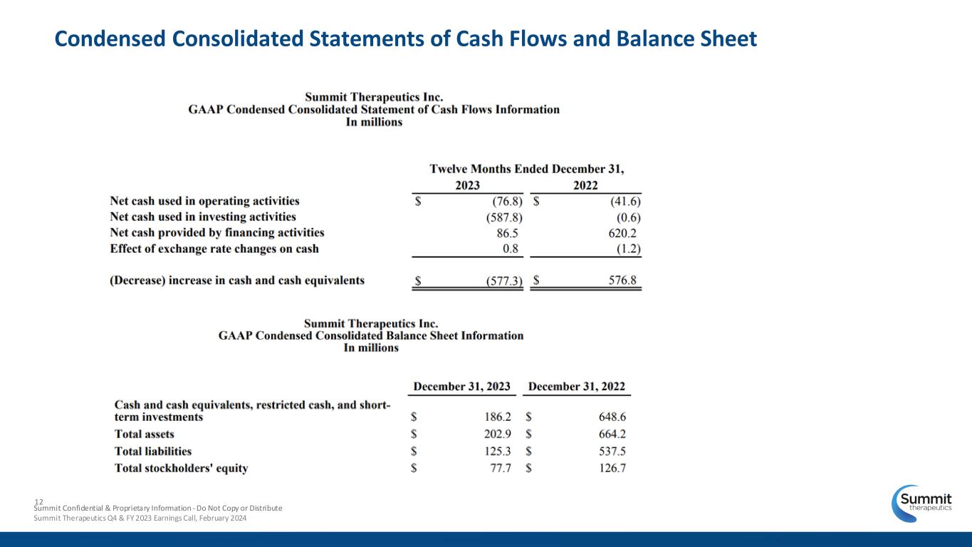 12 Condensed Consolidated Statements of Cash Flows and Balance Sheet Summit Confidential & Proprietary Information - Do Not Copy or Distribute Summit Therapeutics Q4 & FY 2023 Earnings Call, February 2024