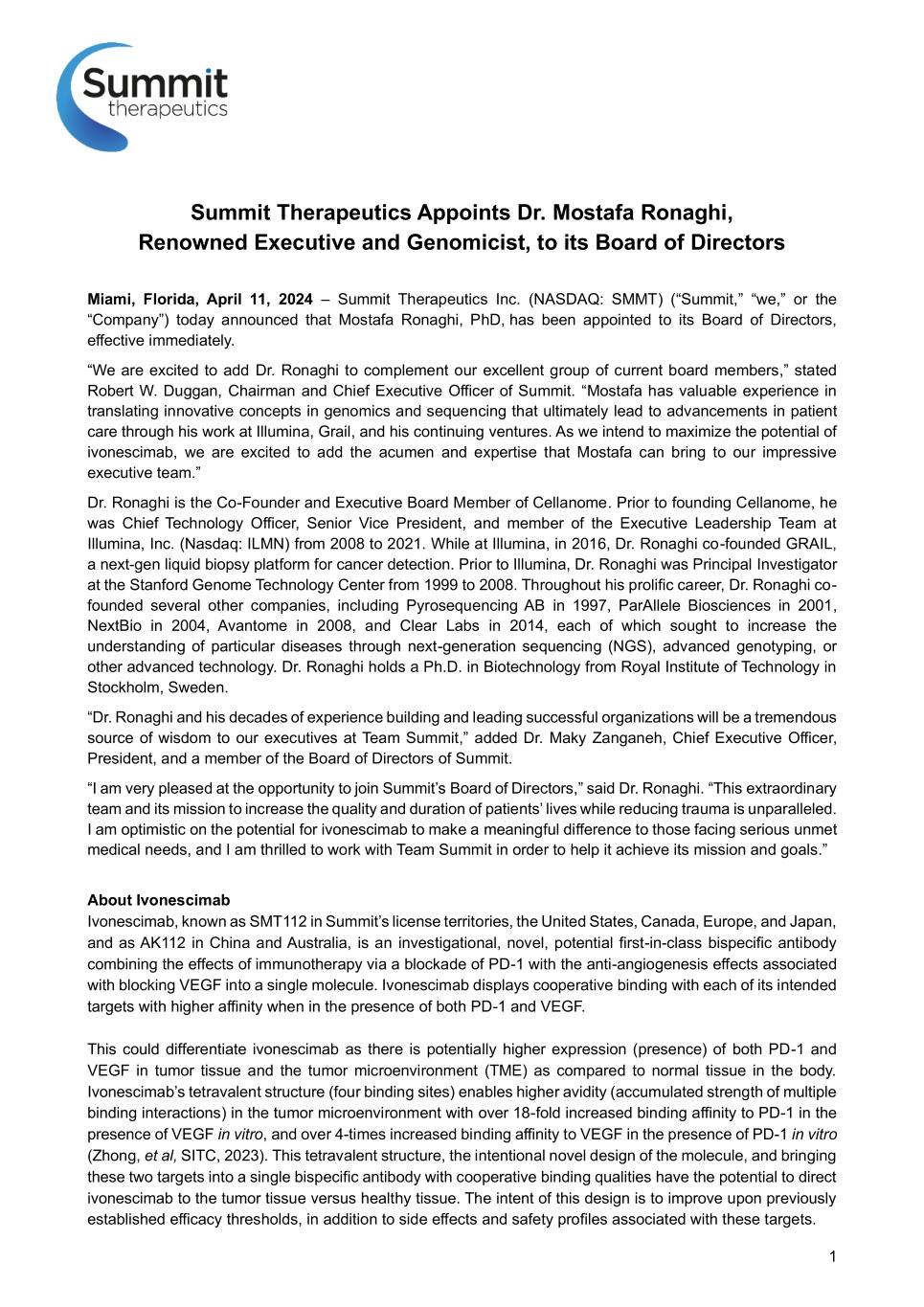1 Summit Therapeutics Appoints Dr. Mostafa Ronaghi, Renowned Executive and Genomicist, to its Board of Directors Miami, Florida, April 11, 2024 – Summit Therapeutics Inc. (NASDAQ: SMMT) (“Summit,” “we,” or the “Company”) today announced that Mostafa Ronaghi, PhD, has been appointed to its Board of Directors, effective immediately. “We are excited to add Dr. Ronaghi to complement our excellent group of current board members,” stated Robert W. Duggan, Chairman and Chief Executive Officer of Summit. “Mostafa has valuable experience in translating innovative concepts in genomics and sequencing that ultimately lead to advancements in patient care through his work at Illumina, Grail, and his continuing ventures. As we intend to maximize the potential of ivonescimab, we are excited to add the acumen and expertise that Mostafa can bring to our impressive executive team.” Dr. Ronaghi is the Co-Founder and Executive Board Member of Cellanome. Prior to founding Cellanome, he was Chief Technology Officer, Senior Vice President, and member of the Executive Leadership Team at Illumina, Inc. (Nasdaq: ILMN) from 2008 to 2021. While at Illumina, in 2016, Dr. Ronaghi co-founded GRAIL, a next-gen liquid biopsy platform for cancer detection. Prior to Illumina, Dr. Ronaghi was Principal Investigator at the Stanford Genome Technology Center from 1999 to 2008. Throughout his prolific career, Dr. Ronaghi co- founded several other companies, including Pyrosequencing AB in 1997, ParAllele Biosciences in 2001, NextBio in 2004, Avantome in 2008, and Clear Labs in 2014, each of which sought to increase the understanding of particular diseases through next-generation sequencing (NGS), advanced genotyping, or other advanced technology. Dr. Ronaghi holds a Ph.D. in Biotechnology from Royal Institute of Technology in Stockholm, Sweden. “Dr. Ronaghi and his decades of experience building and leading successful organizations will be a tremendous source of wisdom to our executives at Team Summit,” added Dr. Maky Zanganeh, Chief Executive Officer, President, and a member of the Board of Directors of Summit. “I am very pleased at the opportunity to join Summit’s Board of Directors,” said Dr. Ronaghi. “This extraordinary team and its mission to increase the quality and duration of patients’ lives while reducing trauma is unparalleled. I am optimistic on the potential for ivonescimab to make a meaningful difference to those facing serious unmet medical needs, and I am thrilled to work with Team Summit in order to help it achieve its mission and goals.” About Ivonescimab Ivonescimab, known as SMT112 in Summit’s license territories, the United States, Canada, Europe, and Japan, and as AK112 in China and Australia, is an investigational, novel, potential first-in-class bispecific antibody combining the effects of immunotherapy via a blockade of PD-1 with the anti-angiogenesis effects associated with blocking VEGF into a single molecule. Ivonescimab displays cooperative binding with each of its intended targets with higher affinity when in the presence of both PD-1 and VEGF. This could differentiate ivonescimab as there is potentially higher expression (presence) of both PD-1 and VEGF in tumor tissue and the tumor microenvironment (TME) as compared to normal tissue in the body. Ivonescimab’s tetravalent structure (four binding sites) enables higher avidity (accumulated strength of multiple binding interactions) in the tumor microenvironment with over 18-fold increased binding affinity to PD-1 in the presence of VEGF in vitro, and over 4-times increased binding affinity to VEGF in the presence of PD-1 in vitro (Zhong, et al, SITC, 2023). This tetravalent structure, the intentional novel design of the molecule, and bringing these two targets into a single bispecific antibody with cooperative binding qualities have the potential to direct ivonescimab to the tumor tissue versus healthy tissue. The intent of this design is to improve upon previously established efficacy thresholds, in addition to side effects and safety profiles associated with these targets.