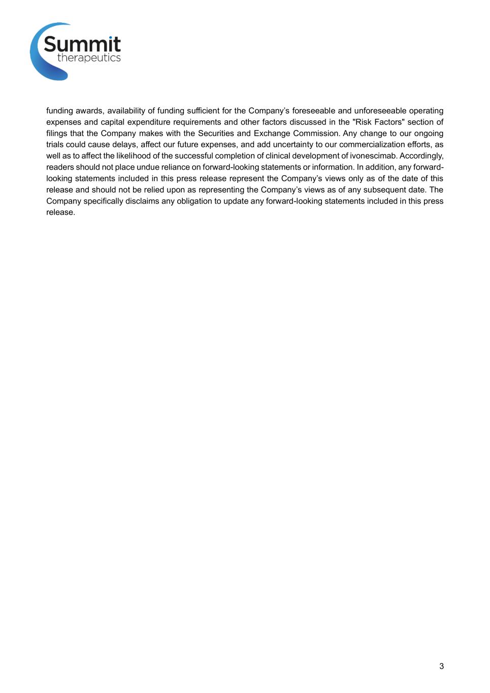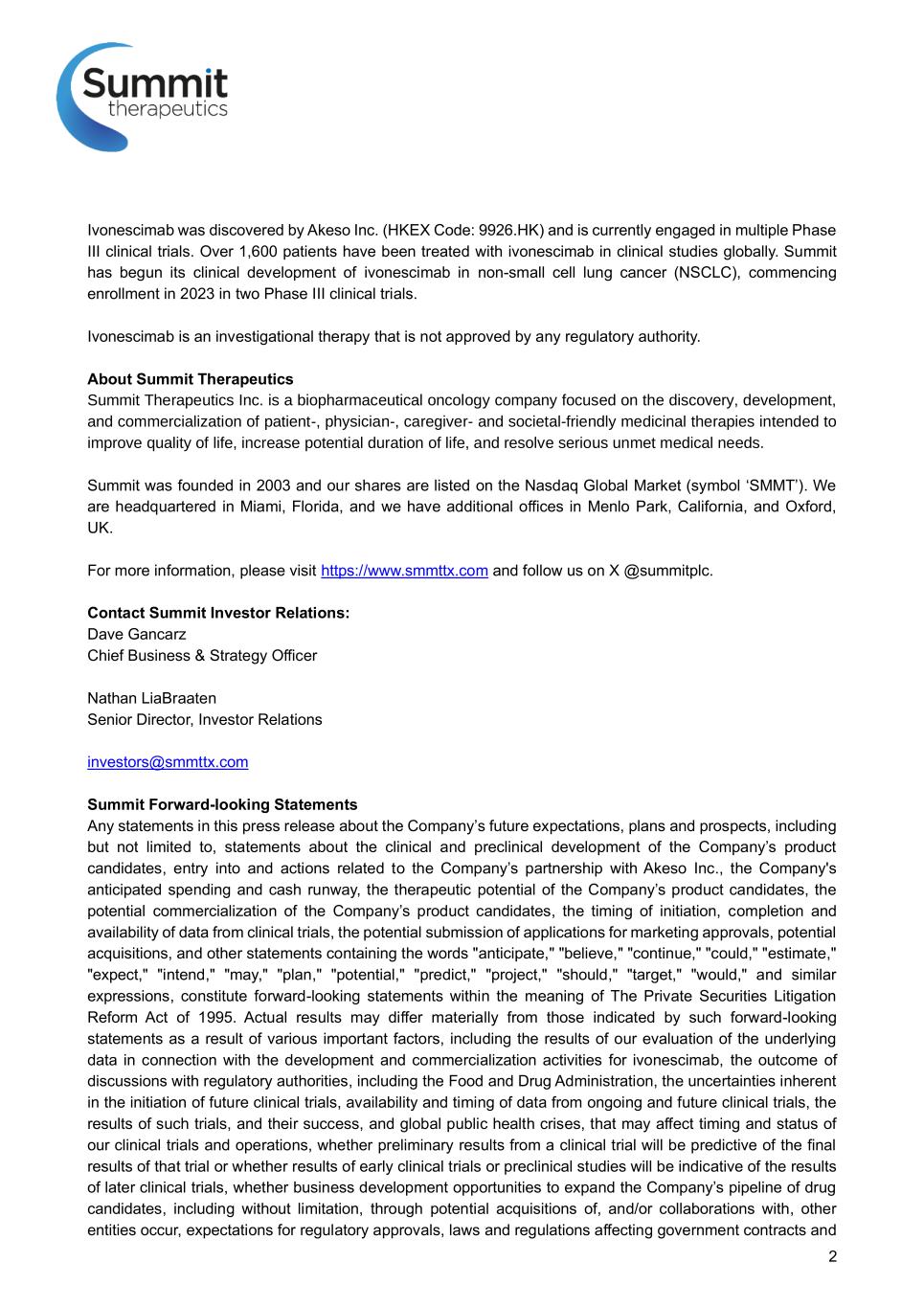2 Ivonescimab was discovered by Akeso Inc. (HKEX Code: 9926.HK) and is currently engaged in multiple Phase III clinical trials. Over 1,600 patients have been treated with ivonescimab in clinical studies globally. Summit has begun its clinical development of ivonescimab in non-small cell lung cancer (NSCLC), commencing enrollment in 2023 in two Phase III clinical trials. Ivonescimab is an investigational therapy that is not approved by any regulatory authority. About Summit Therapeutics Summit Therapeutics Inc. is a biopharmaceutical oncology company focused on the discovery, development, and commercialization of patient-, physician-, caregiver- and societal-friendly medicinal therapies intended to improve quality of life, increase potential duration of life, and resolve serious unmet medical needs. Summit was founded in 2003 and our shares are listed on the Nasdaq Global Market (symbol ‘SMMT’). We are headquartered in Miami, Florida, and we have additional offices in Menlo Park, California, and Oxford, UK. For more information, please visit https://www.smmttx.com and follow us on X @summitplc. Contact Summit Investor Relations: Dave Gancarz Chief Business & Strategy Officer Nathan LiaBraaten Senior Director, Investor Relations investors@smmttx.com Summit Forward-looking Statements Any statements in this press release about the Company’s future expectations, plans and prospects, including but not limited to, statements about the clinical and preclinical development of the Company’s product candidates, entry into and actions related to the Company’s partnership with Akeso Inc., the Company's anticipated spending and cash runway, the therapeutic potential of the Company’s product candidates, the potential commercialization of the Company’s product candidates, the timing of initiation, completion and availability of data from clinical trials, the potential submission of applications for marketing approvals, potential acquisitions, and other statements containing the words "anticipate," "believe," "continue," "could," "estimate," "expect," "intend," "may," "plan," "potential," "predict," "project," "should," "target," "would," and similar expressions, constitute forward-looking statements within the meaning of The Private Securities Litigation Reform Act of 1995. Actual results may differ materially from those indicated by such forward-looking statements as a result of various important factors, including the results of our evaluation of the underlying data in connection with the development and commercialization activities for ivonescimab, the outcome of discussions with regulatory authorities, including the Food and Drug Administration, the uncertainties inherent in the initiation of future clinical trials, availability and timing of data from ongoing and future clinical trials, the results of such trials, and their success, and global public health crises, that may affect timing and status of our clinical trials and operations, whether preliminary results from a clinical trial will be predictive of the final results of that trial or whether results of early clinical trials or preclinical studies will be indicative of the results of later clinical trials, whether business development opportunities to expand the Company’s pipeline of drug candidates, including without limitation, through potential acquisitions of, and/or collaborations with, other entities occur, expectations for regulatory approvals, laws and regulations affecting government contracts and