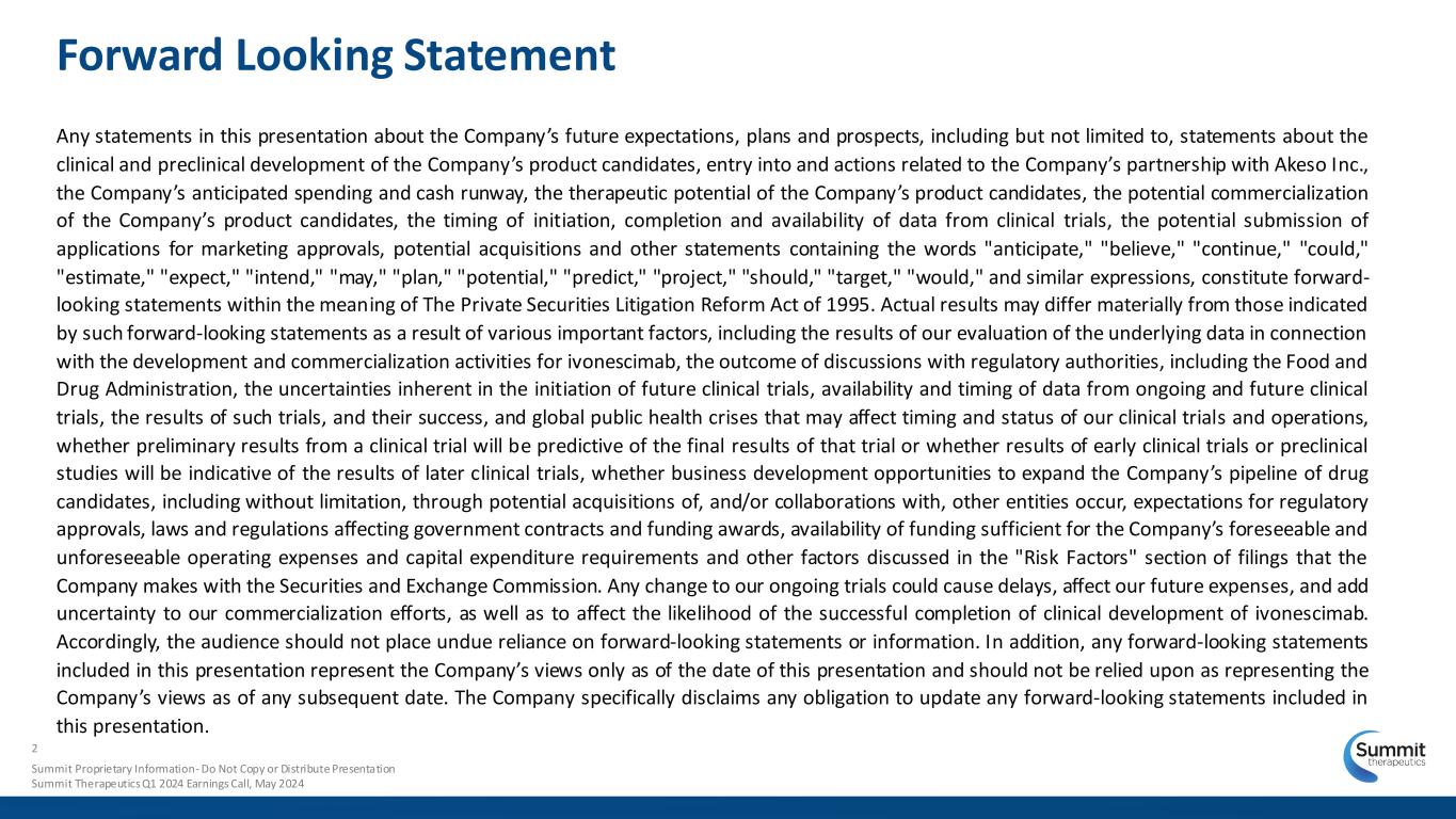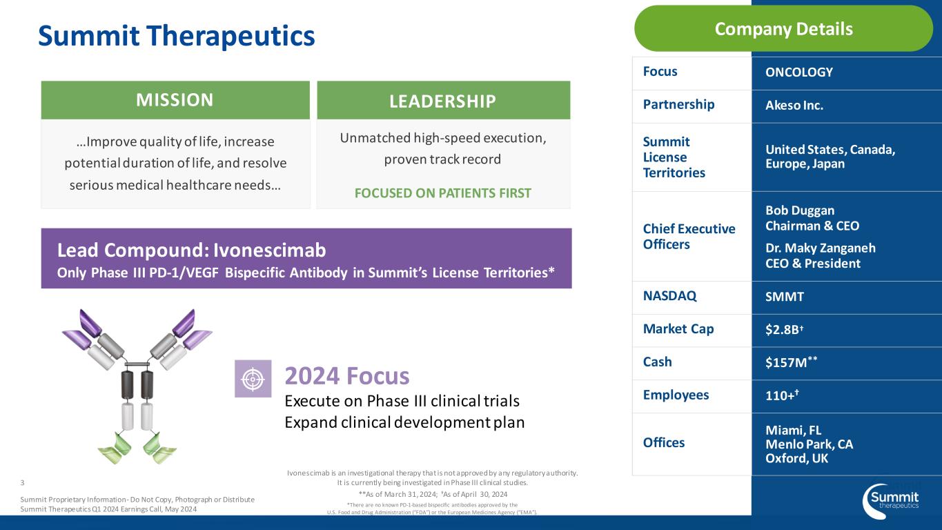 Forward Looking Statement 2 Any statements in this presentation about the Company’s future expectations, plans and prospects, including but not limited to, statements about the clinical and preclinical development of the Company’s product candidates, entry into and actions related to the Company’s partnership with Akeso Inc., the Company’s anticipated spending and cash runway, the therapeutic potential of the Company’s product candidates, the potential commercialization of the Company’s product candidates, the timing of initiation, completion and availability of data from clinical trials, the potential submission of applications for marketing approvals, potential acquisitions and other statements containing the words "anticipate," "believe," "continue," "could," "estimate," "expect," "intend," "may," "plan," "potential," "predict," "project," "should," "target," "would," and similar expressions, constitute forward- looking statements within the meaning of The Private Securities Litigation Reform Act of 1995. Actual results may differ materially from those indicated by such forward-looking statements as a result of various important factors, including the results of our evaluation of the underlying data in connection with the development and commercialization activities for ivonescimab, the outcome of discussions with regulatory authorities, including the Food and Drug Administration, the uncertainties inherent in the initiation of future clinical trials, availability and timing of data from ongoing and future clinical trials, the results of such trials, and their success, and global public health crises that may affect timing and status of our clinical trials and operations, whether preliminary results from a clinical trial will be predictive of the final results of that trial or whether results of early clinical trials or preclinical studies will be indicative of the results of later clinical trials, whether business development opportunities to expand the Company’s pipeline of drug candidates, including without limitation, through potential acquisitions of, and/or collaborations with, other entities occur, expectations for regulatory approvals, laws and regulations affecting government contracts and funding awards, availability of funding sufficient for the Company’s foreseeable and unforeseeable operating expenses and capital expenditure requirements and other factors discussed in the "Risk Factors" section of filings that the Company makes with the Securities and Exchange Commission. Any change to our ongoing trials could cause delays, affect our future expenses, and add uncertainty to our commercialization efforts, as well as to affect the likelihood of the successful completion of clinical development of ivonescimab. Accordingly, the audience should not place undue reliance on forward-looking statements or information. In addition, any forward-looking statements included in this presentation represent the Company’s views only as of the date of this presentation and should not be relied upon as representing the Company’s views as of any subsequent date. The Company specifically disclaims any obligation to update any forward-looking statements included in this presentation. Summit Proprietary Information - Do Not Copy or Distribute Presentation Summit Therapeutics Q1 2024 Earnings Call, May 2024