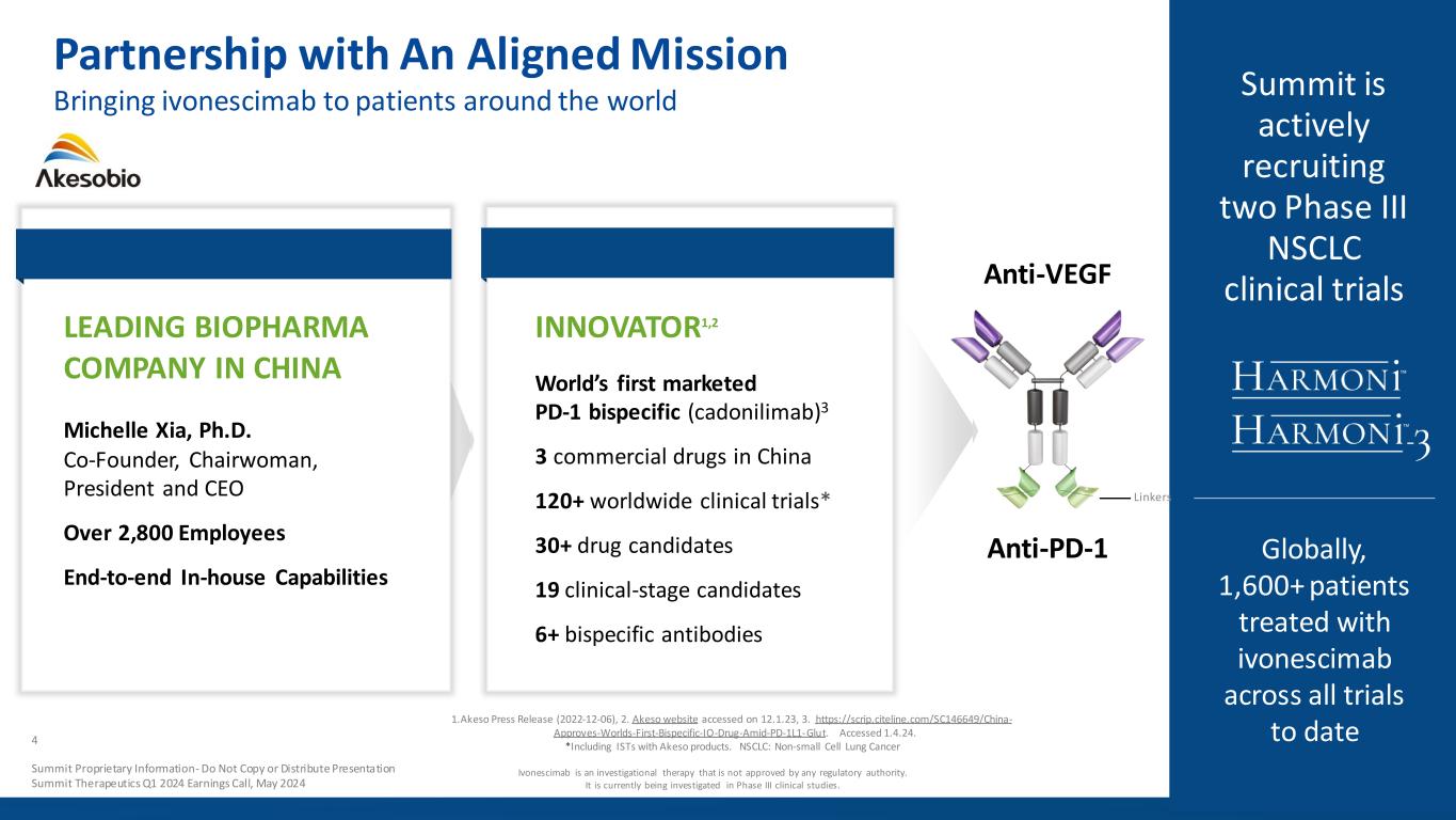 Company Details Focus ONCOLOGY Partnership Akeso Inc. Summit License Territories United States, Canada, Europe, Japan Chief Executive Officers Bob Duggan Chairman & CEO Dr. Maky Zanganeh CEO & President NASDAQ SMMT Market Cap $2.8B† Cash $157M** Employees 110+† Offices Miami, FL Menlo Park, CA Oxford, UK …Improve quality of life, increase potential duration of life, and resolve serious medical healthcare needs… MISSION Unmatched high-speed execution, proven track record FOCUSED ON PATIENTS FIRST LEADERSHIP Lead Compound: Ivonescimab Only Phase III PD-1/VEGF Bispecific Antibody in Summit’s License Territories* 2024 Focus Execute on Phase III clinical trials Expand clinical development plan Summit Therapeutics 3 Ivonescimab is an investigational therapy that is not approved by any regulatory authority. It is currently being investigated in Phase III clinical studies. *There are no known PD-1-based bispecific antibodies approved by the U.S. Food and Drug Administration (“FDA”) or the European Medicines Agency (“EMA”). **As of March 31, 2024; †As of April 30, 2024 Summit Proprietary Information - Do Not Copy, Photograph or Distribute Summit Therapeutics Q1 2024 Earnings Call, May 2024