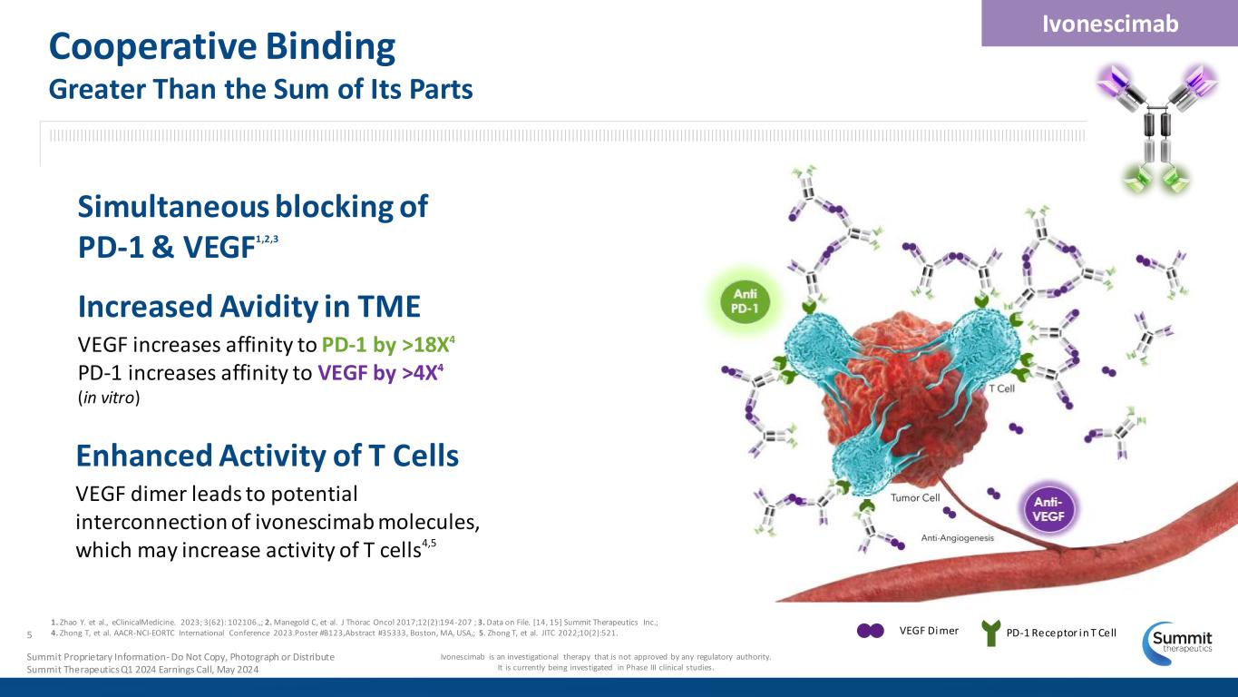 Partnership with An Aligned Mission Bringing ivonescimab to patients around the world Summit is actively recruiting two Phase III NSCLC clinical trials LEADING BIOPHARMA COMPANY IN CHINA Michelle Xia, Ph.D. Co-Founder, Chairwoman, President and CEO Over 2,800 Employees End-to-end In-house Capabilities INNOVATOR1,2 World’s first marketed PD-1 bispecific (cadonilimab)3 3 commercial drugs in China 120+ worldwide clinical trials* 30+ drug candidates 19 clinical-stage candidates 6+ bispecific antibodies 1.Akeso Press Release (2022-12-06), 2. Akeso website accessed on 12.1.23, 3. https://scrip.citeline.com/SC146649/China- Approves-Worlds-First-Bispecific-IO-Drug-Amid-PD-1L1-Glut. Accessed 1.4.24. *Including ISTs with Akeso products. NSCLC: Non-small Cell Lung Cancer Globally, 1,600+ patients treated with ivonescimab across all trials to date4 Summit Proprietary Information - Do Not Copy or Distribute Presentation Summit Therapeutics Q1 2024 Earnings Call, May 2024 Anti-VEGF Anti-PD-1 Linkers Ivonescimab is an investigational therapy that is not approved by any regulatory authority. It is currently being investigated in Phase III clinical studies.