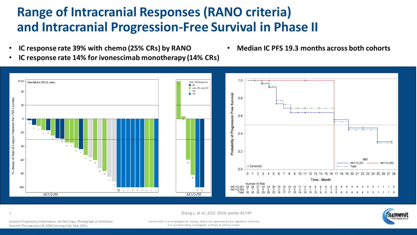 Trial Indication Histology/Population Regimen Phase III NSCLC EGFRm+ 2L+ Advanced or Metastatic Combo ivonescimab + chemo vs. placebo + chemo NSCLC Squamous 1L Metastatic Combo ivonescimab + chemo vs. pembro + chemo Indication Regimen Phase I Phase II Phase III NSCLC: 2L EGFRm+ Randomized: Combo (chemo) vs. chemo NSCLC: 1L PD-L1 TPS>1% Randomized: Monotherapy vs. pembro (PD-1) NSCLC: 1L Squamous Randomized: Combo (chemo) vs. tislelizumab (PD-1) + chemo NSCLC: 1L Squamous Randomized: Combo (chemo) vs. pembro (PD-1) + chemo Advanced Solid Tumors Monotherapy NSCLC Combo (chemo) NSCLC Monotherapy GYN Tumors Monotherapy Ovarian Cancer Combination (PARPi) NSCLC Monotherapy & Combo (chemo) CRC Combo (CD47 + chemo) HCC Monotherapy NSCLC Combo (PD-1 / CTLA-4 bsAb + chemo) HNSCC Combo (CD47) Advanced Solid Tumors** Combo (CD47, CD47 + chemo, chemo) TNBC Comb (chemo, CD47 + chemo) NSCLC Combo (CD73 + chemo) Advanced Solid Tumors Monotherapy ES-SCLC Combo (chemo) Ivonescimab Global Oncology Clinical Trials These ivonescimab cl inical trials are being conducted in China and/or Australia and are ful ly sponsored and managed by Akeso. NSCLC: Non-Small-cell Lung Cancer, EGFRm+: Epidermal Growth Factor Receptor mutant positives, Combo: Combination, Chemo: Chemotherapy, pembro: pembrolizumab, CRC: Colorectal Cancer, HCC: Hepatocellular Carcinoma, HNSCC: Head & Neck Squamous Cell Carcinoma, BTC: Biliary Tract Cancer, TNBC: Triple Negative Breast Cancer, ES-SCLC: Extensive Stage Small Cell Lung Cancer, PD-1: Programmed Cell Death Protein 1, PARPi: poly(ADP-ribose) polymerase inhibitors Ivonescimab is an investigational therapy that is not approved by any regulatory authority. It is currently being investigated in Phase III clinical studies. **Includes Gastric, BTC, Pancreatic, NSCLC Same Subset Patient Population 1,600+ Patients Treated with Ivonescimab 19 Clinical Trials 4 Phase III 13 Phase II 2 Phase I 7 Dedicated Trials Outside NSCLC 6 Same Subset Patient PopulationSummit Proprietary Information - Do Not Copy, Photograph or Distribute Summit Therapeutics Q1 2024 Earnings Call, May 2024