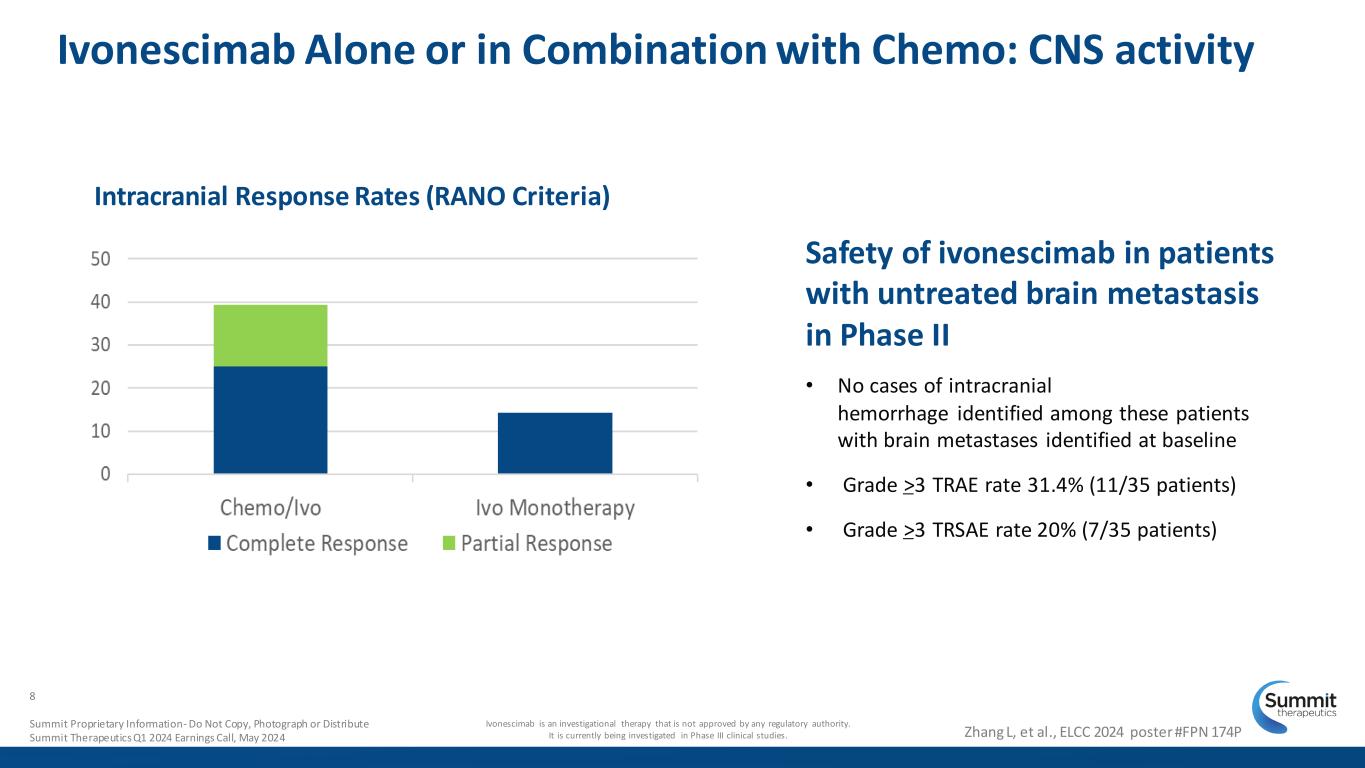 • IC response rate 39% with chemo (25% CRs) by RANO • IC response rate 14% for ivonescimab monotherapy (14% CRs) • Median IC PFS 19.3 months across both cohorts Zhang L, et al., ELCC 2024, poster #174P Range of Intracranial Responses (RANO criteria) and Intracranial Progression-Free Survival in Phase II 7 Summit Proprietary Information - Do Not Copy, Photograph or Distribute Summit Therapeutics Q1 2024 Earnings Call, May 2024 Ivonescimab is an investigational therapy that is not approved by any regulatory authority. It is currently being investigated in Phase III clinical studies.