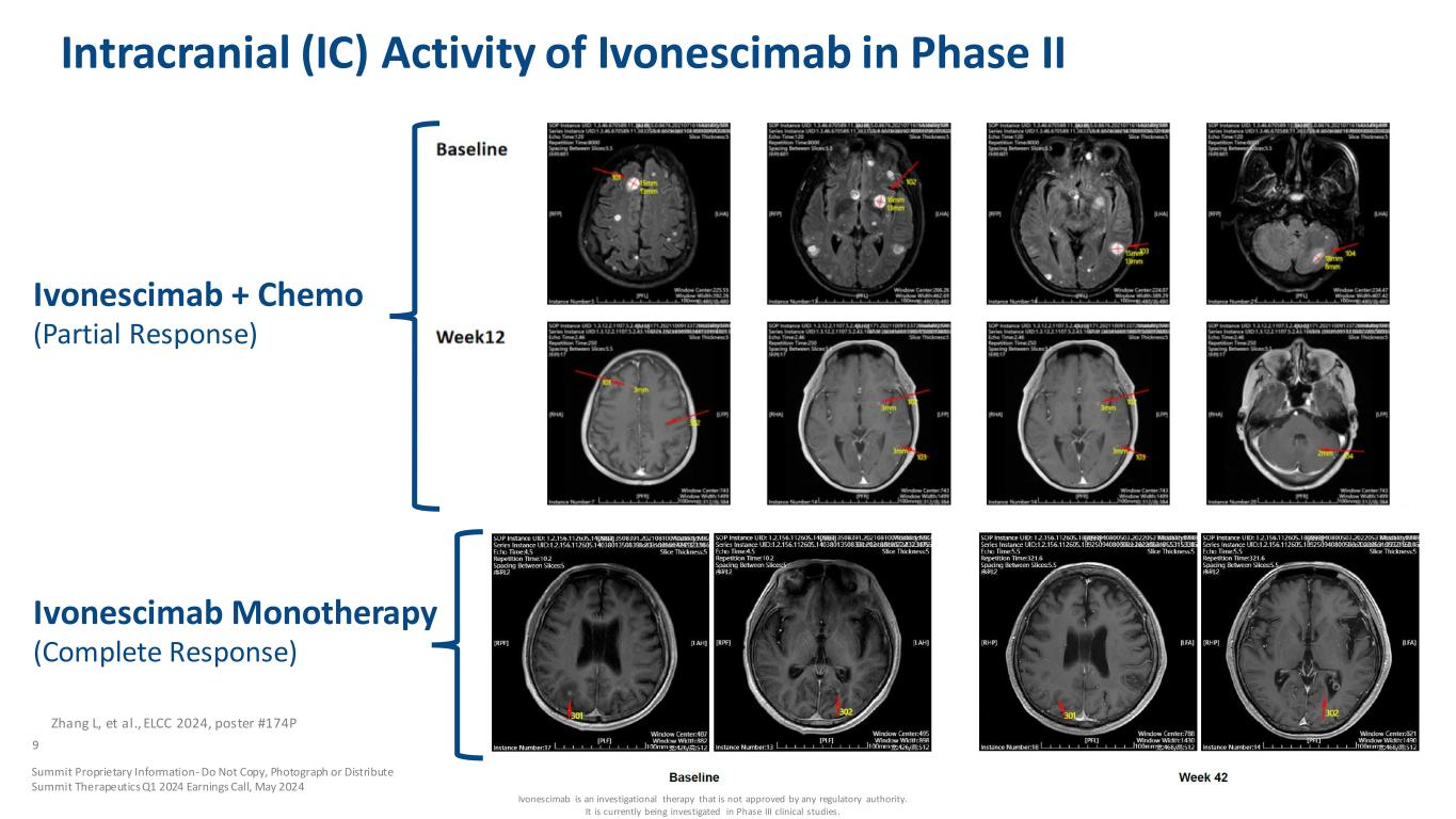 Zhang L, et al., ELCC 2024 poster #FPN 174P Ivonescimab Alone or in Combination with Chemo: CNS activity Intracranial Response Rates (RANO Criteria) Safety of ivonescimab in patients with untreated brain metastasis in Phase II • No cases of intracranial hemorrhage identified among these patients with brain metastases identified at baseline • Grade >3 TRAE rate 31.4% (11/35 patients) • Grade >3 TRSAE rate 20% (7/35 patients) 8 Summit Proprietary Information - Do Not Copy, Photograph or Distribute Summit Therapeutics Q1 2024 Earnings Call, May 2024 Ivonescimab is an investigational therapy that is not approved by any regulatory authority. It is currently being investigated in Phase III clinical studies.