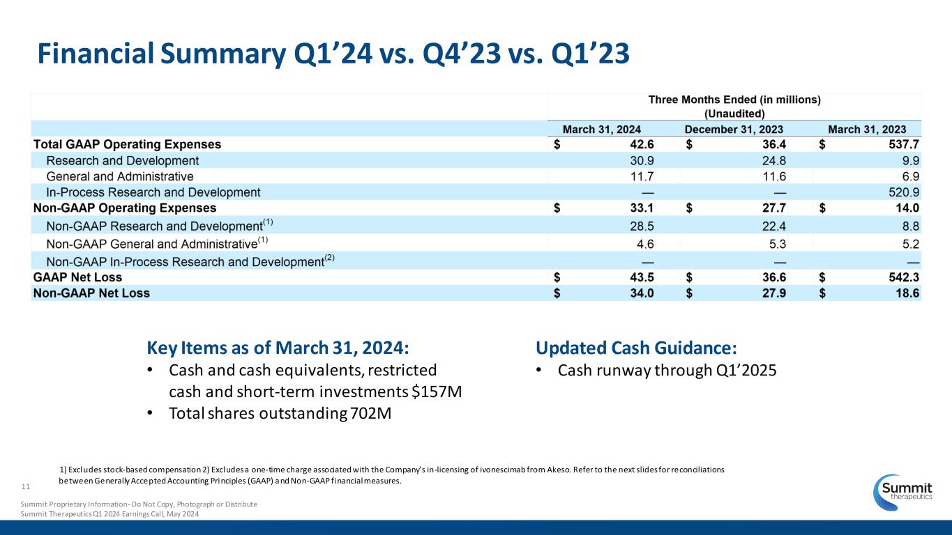 Schedule Reconciling Selected Non-GAAP Financial Measures Note 1: Stock-based compensation is a non-cash charge and costs calculated for this expense can vary year-over-year depending on the stock price of awards on the date of grant as well as the timing of compensation award arrangements. Note 2: In-process research and development represents a one-time charge associated with the Company's in-licensing of ivonescimab from Akeso. 13 Summit Proprietary Information - Do Not Copy, Photograph or Distribute Summit Therapeutics Q1 2024 Earnings Call, May 2024