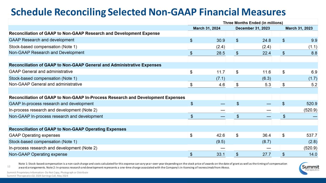 Financial Summary Q1’24 vs. Q4’23 vs. Q1’23 Key Items as of March 31, 2024: • Cash and cash equivalents, restricted cash and short-term investments $157M • Total shares outstanding 702M Updated Cash Guidance: • Cash runway through Q1’2025 1) Excludes stock-based compensation 2) Excludes a one-time charge associated with the Company's in-licensing of ivonescimab from Akeso. Refer to the next slides for reconciliations between Generally Accepted Accounting Principles (GAAP) and Non-GAAP financial measures. 11 Summit Proprietary Information - Do Not Copy, Photograph or Distribute Summit Therapeutics Q1 2024 Earnings Call, May 2024