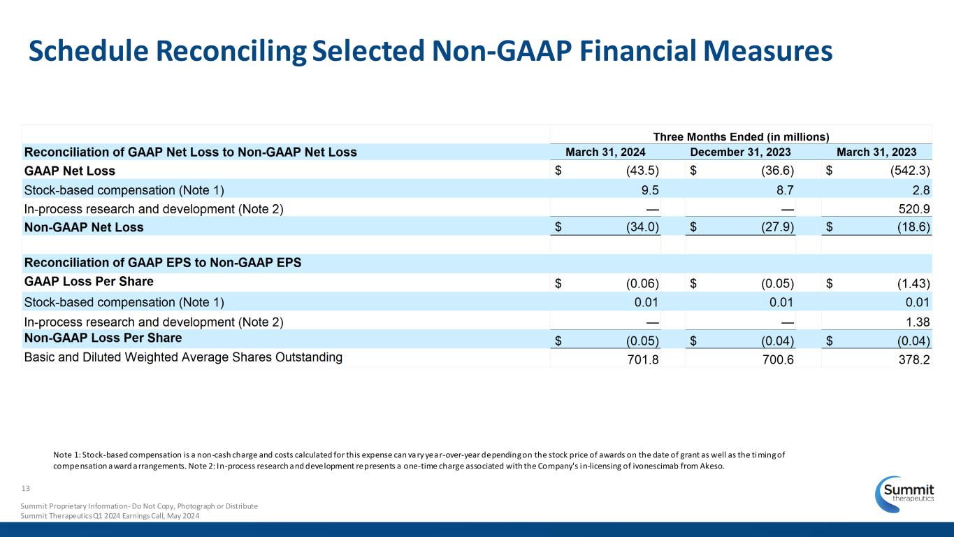 Schedule Reconciling Selected Non-GAAP Financial Measures Note 1: Stock-based compensation is a non-cash charge and costs calculated for this expense can vary year-over-year depending on the stock price of awards on the date of grant as well as the timing of compensation award arrangements. Note 2: In-process research and development represents a one-time charge associated with the Company's in-licensing of ivonescimab from Akeso.12 Summit Proprietary Information - Do Not Copy, Photograph or Distribute Summit Therapeutics Q1 2024 Earnings Call, May 2024