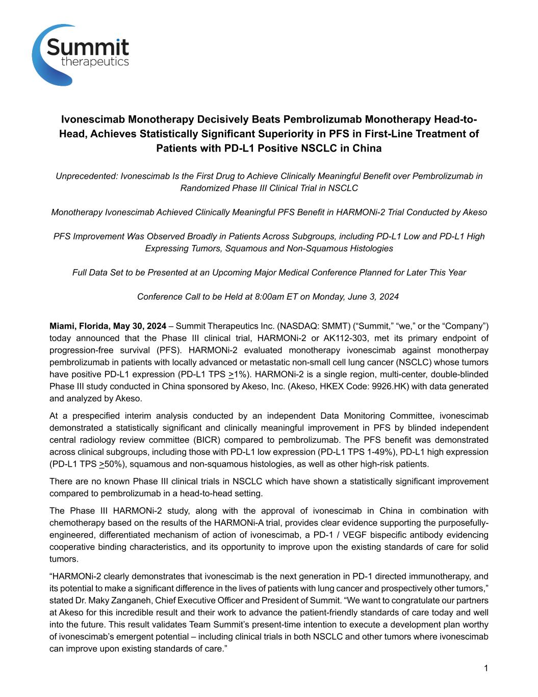 1 Ivonescimab Monotherapy Decisively Beats Pembrolizumab Monotherapy Head-to- Head, Achieves Statistically Significant Superiority in PFS in First-Line Treatment of Patients with PD-L1 Positive NSCLC in China Unprecedented: Ivonescimab Is the First Drug to Achieve Clinically Meaningful Benefit over Pembrolizumab in Randomized Phase III Clinical Trial in NSCLC Monotherapy Ivonescimab Achieved Clinically Meaningful PFS Benefit in HARMONi-2 Trial Conducted by Akeso PFS Improvement Was Observed Broadly in Patients Across Subgroups, including PD-L1 Low and PD-L1 High Expressing Tumors, Squamous and Non-Squamous Histologies Full Data Set to be Presented at an Upcoming Major Medical Conference Planned for Later This Year Conference Call to be Held at 8:00am ET on Monday, June 3, 2024 Miami, Florida, May 30, 2024 – Summit Therapeutics Inc. (NASDAQ: SMMT) (“Summit,” “we,” or the “Company”) today announced that the Phase III clinical trial, HARMONi-2 or AK112-303, met its primary endpoint of progression-free survival (PFS). HARMONi-2 evaluated monotherapy ivonescimab against monotherpay pembrolizumab in patients with locally advanced or metastatic non-small cell lung cancer (NSCLC) whose tumors have positive PD-L1 expression (PD-L1 TPS >1%). HARMONi-2 is a single region, multi-center, double-blinded Phase III study conducted in China sponsored by Akeso, Inc. (Akeso, HKEX Code: 9926.HK) with data generated and analyzed by Akeso. At a prespecified interim analysis conducted by an independent Data Monitoring Committee, ivonescimab demonstrated a statistically significant and clinically meaningful improvement in PFS by blinded independent central radiology review committee (BICR) compared to pembrolizumab. The PFS benefit was demonstrated across clinical subgroups, including those with PD-L1 low expression (PD-L1 TPS 1-49%), PD-L1 high expression (PD-L1 TPS >50%), squamous and non-squamous histologies, as well as other high-risk patients. There are no known Phase III clinical trials in NSCLC which have shown a statistically significant improvement compared to pembrolizumab in a head-to-head setting. The Phase III HARMONi-2 study, along with the approval of ivonescimab in China in combination with chemotherapy based on the results of the HARMONi-A trial, provides clear evidence supporting the purposefully- engineered, differentiated mechanism of action of ivonescimab, a PD-1 / VEGF bispecific antibody evidencing cooperative binding characteristics, and its opportunity to improve upon the existing standards of care for solid tumors. “HARMONi-2 clearly demonstrates that ivonescimab is the next generation in PD-1 directed immunotherapy, and its potential to make a significant difference in the lives of patients with lung cancer and prospectively other tumors,” stated Dr. Maky Zanganeh, Chief Executive Officer and President of Summit. “We want to congratulate our partners at Akeso for this incredible result and their work to advance the patient-friendly standards of care today and well into the future. This result validates Team Summit’s present-time intention to execute a development plan worthy of ivonescimab’s emergent potential – including clinical trials in both NSCLC and other tumors where ivonescimab can improve upon existing standards of care.”