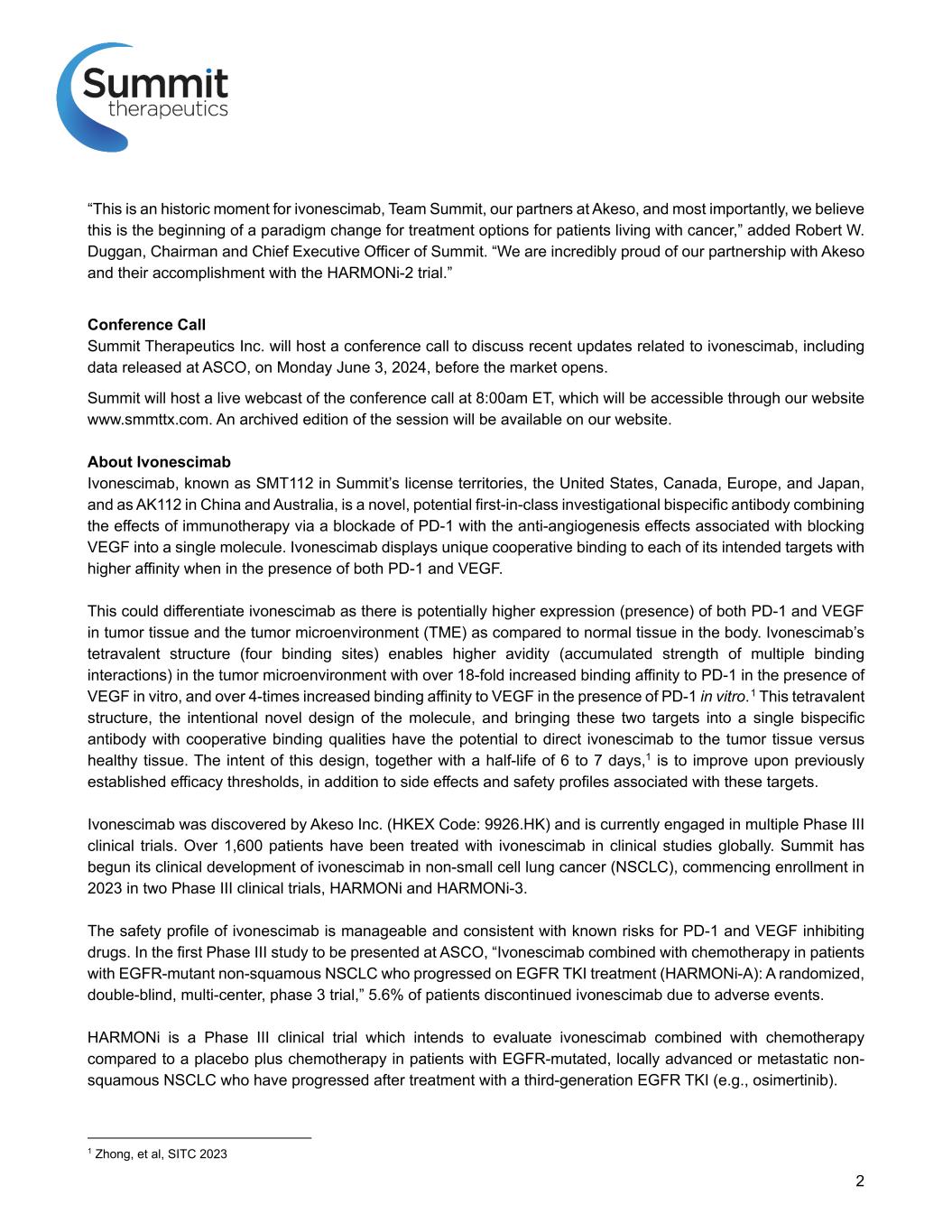 2 “This is an historic moment for ivonescimab, Team Summit, our partners at Akeso, and most importantly, we believe this is the beginning of a paradigm change for treatment options for patients living with cancer,” added Robert W. Duggan, Chairman and Chief Executive Officer of Summit. “We are incredibly proud of our partnership with Akeso and their accomplishment with the HARMONi-2 trial.” Conference Call Summit Therapeutics Inc. will host a conference call to discuss recent updates related to ivonescimab, including data released at ASCO, on Monday June 3, 2024, before the market opens. Summit will host a live webcast of the conference call at 8:00am ET, which will be accessible through our website www.smmttx.com. An archived edition of the session will be available on our website. About Ivonescimab Ivonescimab, known as SMT112 in Summit’s license territories, the United States, Canada, Europe, and Japan, and as AK112 in China and Australia, is a novel, potential first-in-class investigational bispecific antibody combining the effects of immunotherapy via a blockade of PD-1 with the anti-angiogenesis effects associated with blocking VEGF into a single molecule. Ivonescimab displays unique cooperative binding to each of its intended targets with higher affinity when in the presence of both PD-1 and VEGF. This could differentiate ivonescimab as there is potentially higher expression (presence) of both PD-1 and VEGF in tumor tissue and the tumor microenvironment (TME) as compared to normal tissue in the body. Ivonescimab’s tetravalent structure (four binding sites) enables higher avidity (accumulated strength of multiple binding interactions) in the tumor microenvironment with over 18-fold increased binding affinity to PD-1 in the presence of VEGF in vitro, and over 4-times increased binding affinity to VEGF in the presence of PD-1 in vitro.1 This tetravalent structure, the intentional novel design of the molecule, and bringing these two targets into a single bispecific antibody with cooperative binding qualities have the potential to direct ivonescimab to the tumor tissue versus healthy tissue. The intent of this design, together with a half-life of 6 to 7 days,1 is to improve upon previously established efficacy thresholds, in addition to side effects and safety profiles associated with these targets. Ivonescimab was discovered by Akeso Inc. (HKEX Code: 9926.HK) and is currently engaged in multiple Phase III clinical trials. Over 1,600 patients have been treated with ivonescimab in clinical studies globally. Summit has begun its clinical development of ivonescimab in non-small cell lung cancer (NSCLC), commencing enrollment in 2023 in two Phase III clinical trials, HARMONi and HARMONi-3. The safety profile of ivonescimab is manageable and consistent with known risks for PD-1 and VEGF inhibiting drugs. In the first Phase III study to be presented at ASCO, “Ivonescimab combined with chemotherapy in patients with EGFR-mutant non-squamous NSCLC who progressed on EGFR TKI treatment (HARMONi-A): A randomized, double-blind, multi-center, phase 3 trial,” 5.6% of patients discontinued ivonescimab due to adverse events. HARMONi is a Phase III clinical trial which intends to evaluate ivonescimab combined with chemotherapy compared to a placebo plus chemotherapy in patients with EGFR-mutated, locally advanced or metastatic non- squamous NSCLC who have progressed after treatment with a third-generation EGFR TKI (e.g., osimertinib). 1 Zhong, et al, SITC 2023