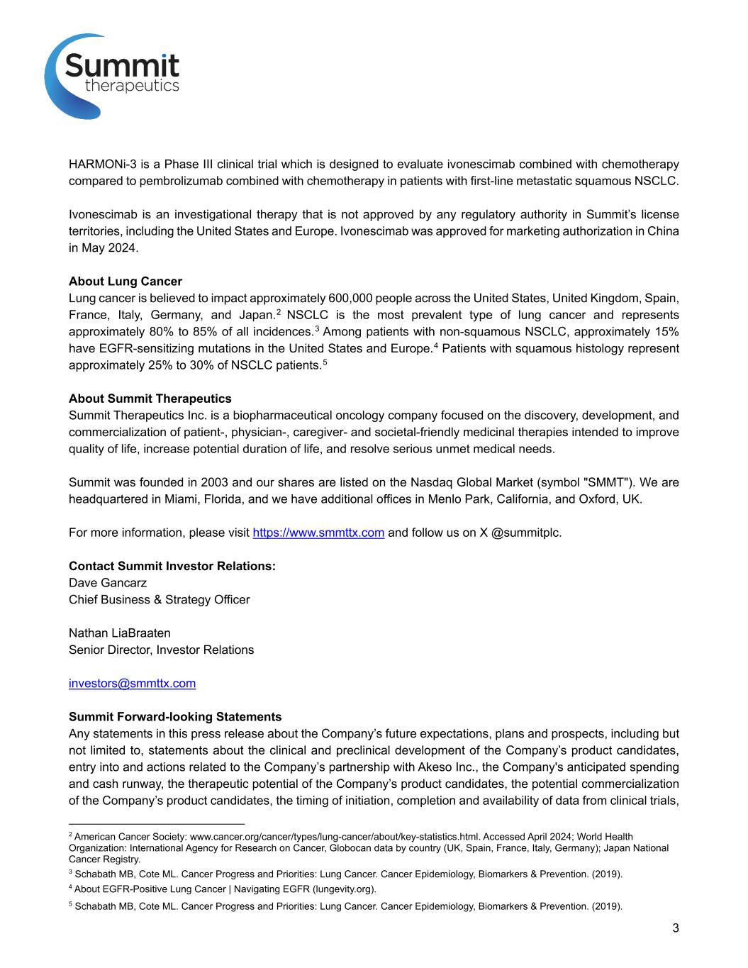 3 HARMONi-3 is a Phase III clinical trial which is designed to evaluate ivonescimab combined with chemotherapy compared to pembrolizumab combined with chemotherapy in patients with first-line metastatic squamous NSCLC. Ivonescimab is an investigational therapy that is not approved by any regulatory authority in Summit’s license territories, including the United States and Europe. Ivonescimab was approved for marketing authorization in China in May 2024. About Lung Cancer Lung cancer is believed to impact approximately 600,000 people across the United States, United Kingdom, Spain, France, Italy, Germany, and Japan.2 NSCLC is the most prevalent type of lung cancer and represents approximately 80% to 85% of all incidences.3 Among patients with non-squamous NSCLC, approximately 15% have EGFR-sensitizing mutations in the United States and Europe.4 Patients with squamous histology represent approximately 25% to 30% of NSCLC patients.5 About Summit Therapeutics Summit Therapeutics Inc. is a biopharmaceutical oncology company focused on the discovery, development, and commercialization of patient-, physician-, caregiver- and societal-friendly medicinal therapies intended to improve quality of life, increase potential duration of life, and resolve serious unmet medical needs. Summit was founded in 2003 and our shares are listed on the Nasdaq Global Market (symbol "SMMT"). We are headquartered in Miami, Florida, and we have additional offices in Menlo Park, California, and Oxford, UK. For more information, please visit https://www.smmttx.com and follow us on X @summitplc. Contact Summit Investor Relations: Dave Gancarz Chief Business & Strategy Officer Nathan LiaBraaten Senior Director, Investor Relations investors@smmttx.com Summit Forward-looking Statements Any statements in this press release about the Company’s future expectations, plans and prospects, including but not limited to, statements about the clinical and preclinical development of the Company’s product candidates, entry into and actions related to the Company’s partnership with Akeso Inc., the Company's anticipated spending and cash runway, the therapeutic potential of the Company’s product candidates, the potential commercialization of the Company’s product candidates, the timing of initiation, completion and availability of data from clinical trials, 2 American Cancer Society: www.cancer.org/cancer/types/lung-cancer/about/key-statistics.html. Accessed April 2024; World Health Organization: International Agency for Research on Cancer, Globocan data by country (UK, Spain, France, Italy, Germany); Japan National Cancer Registry. 3 Schabath MB, Cote ML. Cancer Progress and Priorities: Lung Cancer. Cancer Epidemiology, Biomarkers & Prevention. (2019). 4 About EGFR-Positive Lung Cancer | Navigating EGFR (lungevity.org). 5 Schabath MB, Cote ML. Cancer Progress and Priorities: Lung Cancer. Cancer Epidemiology, Biomarkers & Prevention. (2019).