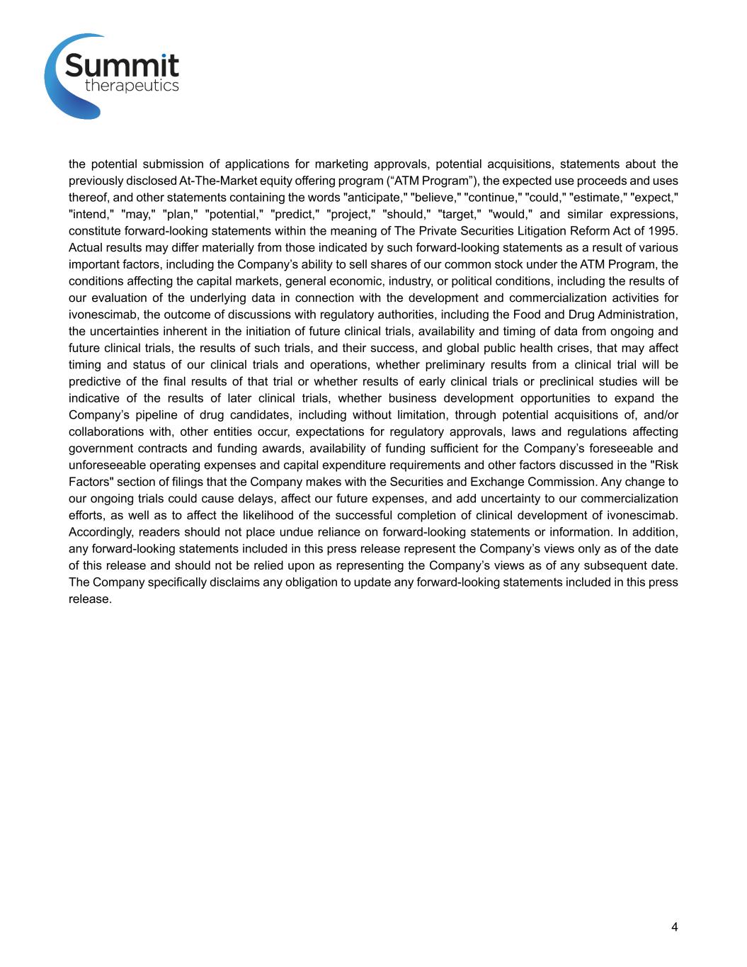 4 the potential submission of applications for marketing approvals, potential acquisitions, statements about the previously disclosed At-The-Market equity offering program (“ATM Program”), the expected use proceeds and uses thereof, and other statements containing the words "anticipate," "believe," "continue," "could," "estimate," "expect," "intend," "may," "plan," "potential," "predict," "project," "should," "target," "would," and similar expressions, constitute forward-looking statements within the meaning of The Private Securities Litigation Reform Act of 1995. Actual results may differ materially from those indicated by such forward-looking statements as a result of various important factors, including the Company’s ability to sell shares of our common stock under the ATM Program, the conditions affecting the capital markets, general economic, industry, or political conditions, including the results of our evaluation of the underlying data in connection with the development and commercialization activities for ivonescimab, the outcome of discussions with regulatory authorities, including the Food and Drug Administration, the uncertainties inherent in the initiation of future clinical trials, availability and timing of data from ongoing and future clinical trials, the results of such trials, and their success, and global public health crises, that may affect timing and status of our clinical trials and operations, whether preliminary results from a clinical trial will be predictive of the final results of that trial or whether results of early clinical trials or preclinical studies will be indicative of the results of later clinical trials, whether business development opportunities to expand the Company’s pipeline of drug candidates, including without limitation, through potential acquisitions of, and/or collaborations with, other entities occur, expectations for regulatory approvals, laws and regulations affecting government contracts and funding awards, availability of funding sufficient for the Company’s foreseeable and unforeseeable operating expenses and capital expenditure requirements and other factors discussed in the "Risk Factors" section of filings that the Company makes with the Securities and Exchange Commission. Any change to our ongoing trials could cause delays, affect our future expenses, and add uncertainty to our commercialization efforts, as well as to affect the likelihood of the successful completion of clinical development of ivonescimab. Accordingly, readers should not place undue reliance on forward-looking statements or information. In addition, any forward-looking statements included in this press release represent the Company’s views only as of the date of this release and should not be relied upon as representing the Company’s views as of any subsequent date. The Company specifically disclaims any obligation to update any forward-looking statements included in this press release.