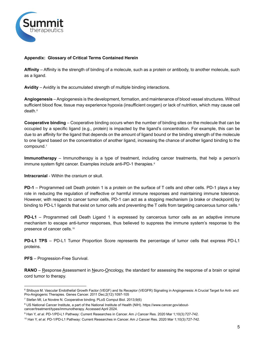 5 Appendix: Glossary of Critical Terms Contained Herein Affinity – Affinity is the strength of binding of a molecule, such as a protein or antibody, to another molecule, such as a ligand. Avidity – Avidity is the accumulated strength of multiple binding interactions. Angiogenesis – Angiogenesis is the development, formation, and maintenance of blood vessel structures. Without sufficient blood flow, tissue may experience hypoxia (insufficient oxygen) or lack of nutrition, which may cause cell death.6 Cooperative binding – Cooperative binding occurs when the number of binding sites on the molecule that can be occupied by a specific ligand (e.g., protein) is impacted by the ligand’s concentration. For example, this can be due to an affinity for the ligand that depends on the amount of ligand bound or the binding strength of the molecule to one ligand based on the concentration of another ligand, increasing the chance of another ligand binding to the compound.7 Immunotherapy – Immunotherapy is a type of treatment, including cancer treatments, that help a person’s immune system fight cancer. Examples include anti-PD-1 therapies.8 Intracranial - Within the cranium or skull. PD-1 – Programmed cell Death protein 1 is a protein on the surface of T cells and other cells. PD-1 plays a key role in reducing the regulation of ineffective or harmful immune responses and maintaining immune tolerance. However, with respect to cancer tumor cells, PD-1 can act as a stopping mechanism (a brake or checkpoint) by binding to PD-L1 ligands that exist on tumor cells and preventing the T cells from targeting cancerous tumor cells.9 PD-L1 – Programmed cell Death Ligand 1 is expressed by cancerous tumor cells as an adaptive immune mechanism to escape anti-tumor responses, thus believed to suppress the immune system’s response to the presence of cancer cells.10 PD-L1 TPS – PD-L1 Tumor Proportion Score represents the percentage of tumor cells that express PD-L1 proteins. PFS – Progression-Free Survival. RANO – Response Assessment in Neuro-Oncology, the standard for assessing the response of a brain or spinal cord tumor to therapy. 6 Shibuya M. Vascular Endothelial Growth Factor (VEGF) and Its Receptor (VEGFR) Signaling in Angiogenesis: A Crucial Target for Anti- and Pro-Angiogenic Therapies. Genes Cancer. 2011 Dec;2(12):1097-105 7 Stefan MI, Le Novère N. Cooperative binding. PLoS Comput Biol. 2013;9(6) 8 US National Cancer Institute, a part of the National Institute of Health (NIH). https://www.cancer.gov/about- cancer/treatment/types/immunotherapy. Accessed April 2024. 9 Han Y, et al. PD-1/PD-L1 Pathway: Current Researches in Cancer. Am J Cancer Res. 2020 Mar 1;10(3):727-742. 10 Han Y, et al. PD-1/PD-L1 Pathway: Current Researches in Cancer. Am J Cancer Res. 2020 Mar 1;10(3):727-742.