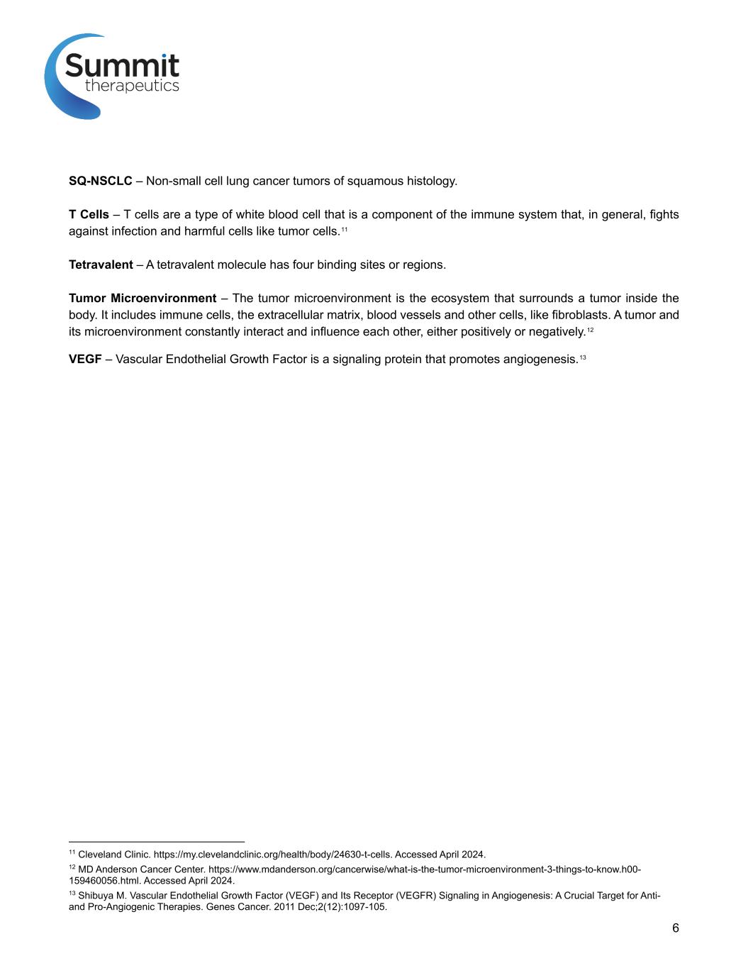 6 SQ-NSCLC – Non-small cell lung cancer tumors of squamous histology. T Cells – T cells are a type of white blood cell that is a component of the immune system that, in general, fights against infection and harmful cells like tumor cells.11 Tetravalent – A tetravalent molecule has four binding sites or regions. Tumor Microenvironment – The tumor microenvironment is the ecosystem that surrounds a tumor inside the body. It includes immune cells, the extracellular matrix, blood vessels and other cells, like fibroblasts. A tumor and its microenvironment constantly interact and influence each other, either positively or negatively.12 VEGF – Vascular Endothelial Growth Factor is a signaling protein that promotes angiogenesis.13 11 Cleveland Clinic. https://my.clevelandclinic.org/health/body/24630-t-cells. Accessed April 2024. 12 MD Anderson Cancer Center. https://www.mdanderson.org/cancerwise/what-is-the-tumor-microenvironment-3-things-to-know.h00- 159460056.html. Accessed April 2024. 13 Shibuya M. Vascular Endothelial Growth Factor (VEGF) and Its Receptor (VEGFR) Signaling in Angiogenesis: A Crucial Target for Anti- and Pro-Angiogenic Therapies. Genes Cancer. 2011 Dec;2(12):1097-105.