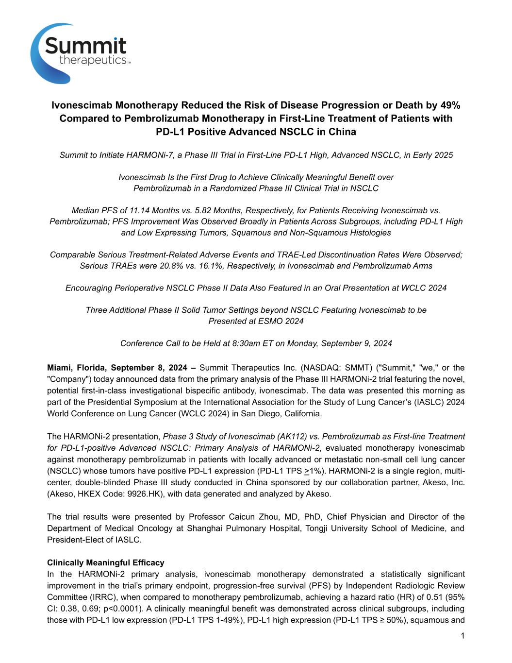 1 Ivonescimab Monotherapy Reduced the Risk of Disease Progression or Death by 49% Compared to Pembrolizumab Monotherapy in First-Line Treatment of Patients with PD-L1 Positive Advanced NSCLC in China Summit to Initiate HARMONi-7, a Phase III Trial in First-Line PD-L1 High, Advanced NSCLC, in Early 2025 Ivonescimab Is the First Drug to Achieve Clinically Meaningful Benefit over Pembrolizumab in a Randomized Phase III Clinical Trial in NSCLC Median PFS of 11.14 Months vs. 5.82 Months, Respectively, for Patients Receiving Ivonescimab vs. Pembrolizumab; PFS Improvement Was Observed Broadly in Patients Across Subgroups, including PD-L1 High and Low Expressing Tumors, Squamous and Non-Squamous Histologies Comparable Serious Treatment-Related Adverse Events and TRAE-Led Discontinuation Rates Were Observed; Serious TRAEs were 20.8% vs. 16.1%, Respectively, in Ivonescimab and Pembrolizumab Arms Encouraging Perioperative NSCLC Phase II Data Also Featured in an Oral Presentation at WCLC 2024 Three Additional Phase II Solid Tumor Settings beyond NSCLC Featuring Ivonescimab to be Presented at ESMO 2024 Conference Call to be Held at 8:30am ET on Monday, September 9, 2024 Miami, Florida, September 8, 2024 – Summit Therapeutics Inc. (NASDAQ: SMMT) ("Summit," "we," or the "Company") today announced data from the primary analysis of the Phase III HARMONi-2 trial featuring the novel, potential first-in-class investigational bispecific antibody, ivonescimab. The data was presented this morning as part of the Presidential Symposium at the International Association for the Study of Lung Cancer’s (IASLC) 2024 World Conference on Lung Cancer (WCLC 2024) in San Diego, California. The HARMONi-2 presentation, Phase 3 Study of Ivonescimab (AK112) vs. Pembrolizumab as First-line Treatment for PD-L1-positive Advanced NSCLC: Primary Analysis of HARMONi-2, evaluated monotherapy ivonescimab against monotherapy pembrolizumab in patients with locally advanced or metastatic non-small cell lung cancer (NSCLC) whose tumors have positive PD-L1 expression (PD-L1 TPS >1%). HARMONi-2 is a single region, multi- center, double-blinded Phase III study conducted in China sponsored by our collaboration partner, Akeso, Inc. (Akeso, HKEX Code: 9926.HK), with data generated and analyzed by Akeso. The trial results were presented by Professor Caicun Zhou, MD, PhD, Chief Physician and Director of the Department of Medical Oncology at Shanghai Pulmonary Hospital, Tongji University School of Medicine, and President-Elect of IASLC. Clinically Meaningful Efficacy In the HARMONi-2 primary analysis, ivonescimab monotherapy demonstrated a statistically significant improvement in the trial’s primary endpoint, progression-free survival (PFS) by Independent Radiologic Review Committee (IRRC), when compared to monotherapy pembrolizumab, achieving a hazard ratio (HR) of 0.51 (95% CI: 0.38, 0.69; p<0.0001). A clinically meaningful benefit was demonstrated across clinical subgroups, including those with PD-L1 low expression (PD-L1 TPS 1-49%), PD-L1 high expression (PD-L1 TPS ≥ 50%), squamous and