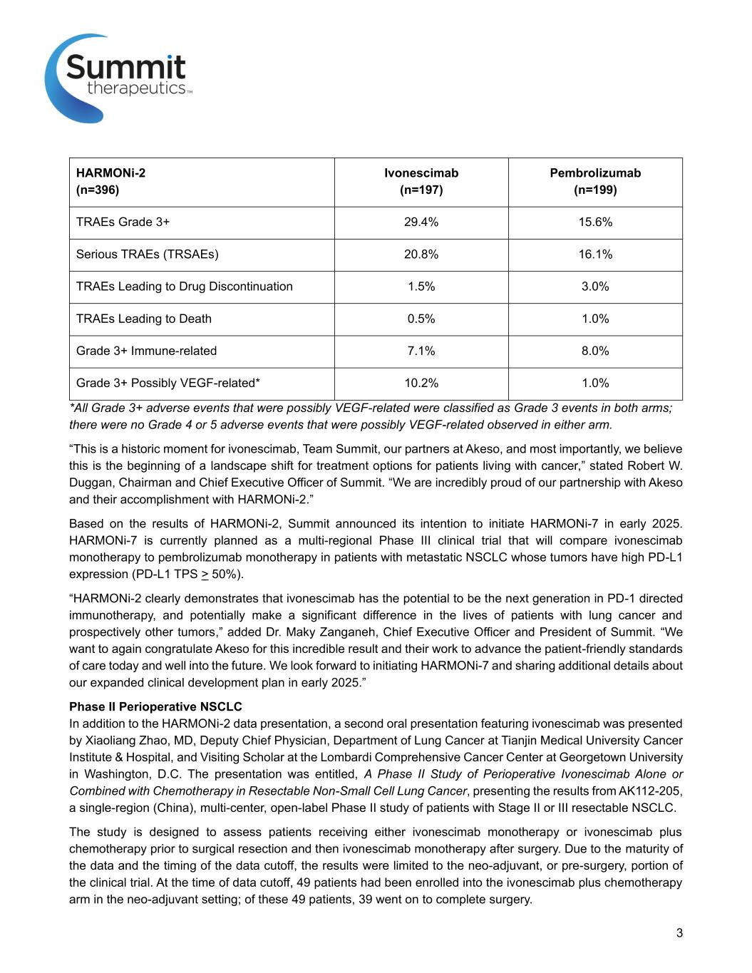 3 HARMONi-2 (n=396) Ivonescimab (n=197) Pembrolizumab (n=199) TRAEs Grade 3+ 29.4% 15.6% Serious TRAEs (TRSAEs) 20.8% 16.1% TRAEs Leading to Drug Discontinuation 1.5% 3.0% TRAEs Leading to Death 0.5% 1.0% Grade 3+ Immune-related 7.1% 8.0% Grade 3+ Possibly VEGF-related* 10.2% 1.0% *All Grade 3+ adverse events that were possibly VEGF-related were classified as Grade 3 events in both arms; there were no Grade 4 or 5 adverse events that were possibly VEGF-related observed in either arm. “This is a historic moment for ivonescimab, Team Summit, our partners at Akeso, and most importantly, we believe this is the beginning of a landscape shift for treatment options for patients living with cancer,” stated Robert W. Duggan, Chairman and Chief Executive Officer of Summit. “We are incredibly proud of our partnership with Akeso and their accomplishment with HARMONi-2.” Based on the results of HARMONi-2, Summit announced its intention to initiate HARMONi-7 in early 2025. HARMONi-7 is currently planned as a multi-regional Phase III clinical trial that will compare ivonescimab monotherapy to pembrolizumab monotherapy in patients with metastatic NSCLC whose tumors have high PD-L1 expression (PD-L1 TPS > 50%). “HARMONi-2 clearly demonstrates that ivonescimab has the potential to be the next generation in PD-1 directed immunotherapy, and potentially make a significant difference in the lives of patients with lung cancer and prospectively other tumors,” added Dr. Maky Zanganeh, Chief Executive Officer and President of Summit. “We want to again congratulate Akeso for this incredible result and their work to advance the patient-friendly standards of care today and well into the future. We look forward to initiating HARMONi-7 and sharing additional details about our expanded clinical development plan in early 2025.” Phase II Perioperative NSCLC In addition to the HARMONi-2 data presentation, a second oral presentation featuring ivonescimab was presented by Xiaoliang Zhao, MD, Deputy Chief Physician, Department of Lung Cancer at Tianjin Medical University Cancer Institute & Hospital, and Visiting Scholar at the Lombardi Comprehensive Cancer Center at Georgetown University in Washington, D.C. The presentation was entitled, A Phase II Study of Perioperative Ivonescimab Alone or Combined with Chemotherapy in Resectable Non-Small Cell Lung Cancer, presenting the results from AK112-205, a single-region (China), multi-center, open-label Phase II study of patients with Stage II or III resectable NSCLC. The study is designed to assess patients receiving either ivonescimab monotherapy or ivonescimab plus chemotherapy prior to surgical resection and then ivonescimab monotherapy after surgery. Due to the maturity of the data and the timing of the data cutoff, the results were limited to the neo-adjuvant, or pre-surgery, portion of the clinical trial. At the time of data cutoff, 49 patients had been enrolled into the ivonescimab plus chemotherapy arm in the neo-adjuvant setting; of these 49 patients, 39 went on to complete surgery.