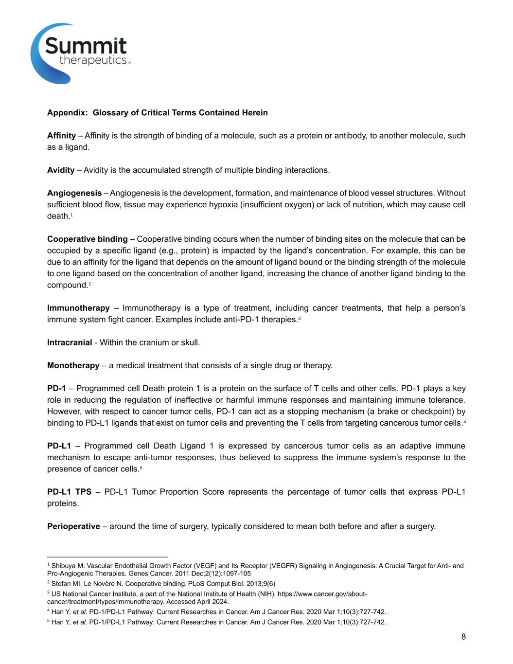 9 PFS – Progression-Free Survival. RANO – Response Assessment in Neuro-Oncology, the standard for assessing the response of a brain or spinal cord tumor to therapy. RECIST v1.1 – A generally-accepted way to measuring and evaluating the response of a tumor in clinical trials. The criteria is designated by an international group of experienced physicians in drug development from academic research backgrounds, government backgrounds and industry backgrounds, as well as imaging specialists and statisticians, referred to as the RECIST Working Group.6 SQ-NSCLC – Non-small cell lung cancer tumors of squamous histology. T Cells – T cells are a type of white blood cell that is a component of the immune system that, in general, fights against infection and harmful cells like tumor cells.7 Tetravalent – A tetravalent molecule has four binding sites or regions. Tumor Microenvironment – The tumor microenvironment is the ecosystem that surrounds a tumor inside the body. It includes immune cells, the extracellular matrix, blood vessels and other cells, like fibroblasts. A tumor and its microenvironment constantly interact and influence each other, either positively or negatively.8 VEGF – Vascular Endothelial Growth Factor is a signaling protein that promotes angiogenesis.9 Summit Therapeutics and the Summit Therapeutics logo are trademarks of Summit Therapeutics Inc. Copyright 2024, Summit Therapeutics Inc. All Rights Reserved. 6 Eisenhauer, et. al. New response evaluation criteria in solid tumours: Revised RECIST guideline (version 1.1), Eur J Cancer. 2009 Jan;45(2):228-47. 7 Cleveland Clinic. https://my.clevelandclinic.org/health/body/24630-t-cells. Accessed April 2024. 8 MD Anderson Cancer Center. https://www.mdanderson.org/cancerwise/what-is-the-tumor-microenvironment-3-things-to-know.h00- 159460056.html. Accessed April 2024. 9 Shibuya M. Vascular Endothelial Growth Factor (VEGF) and Its Receptor (VEGFR) Signaling in Angiogenesis: A Crucial Target for Anti- and Pro-Angiogenic Therapies. Genes Cancer. 2011 Dec;2(12):1097-105.