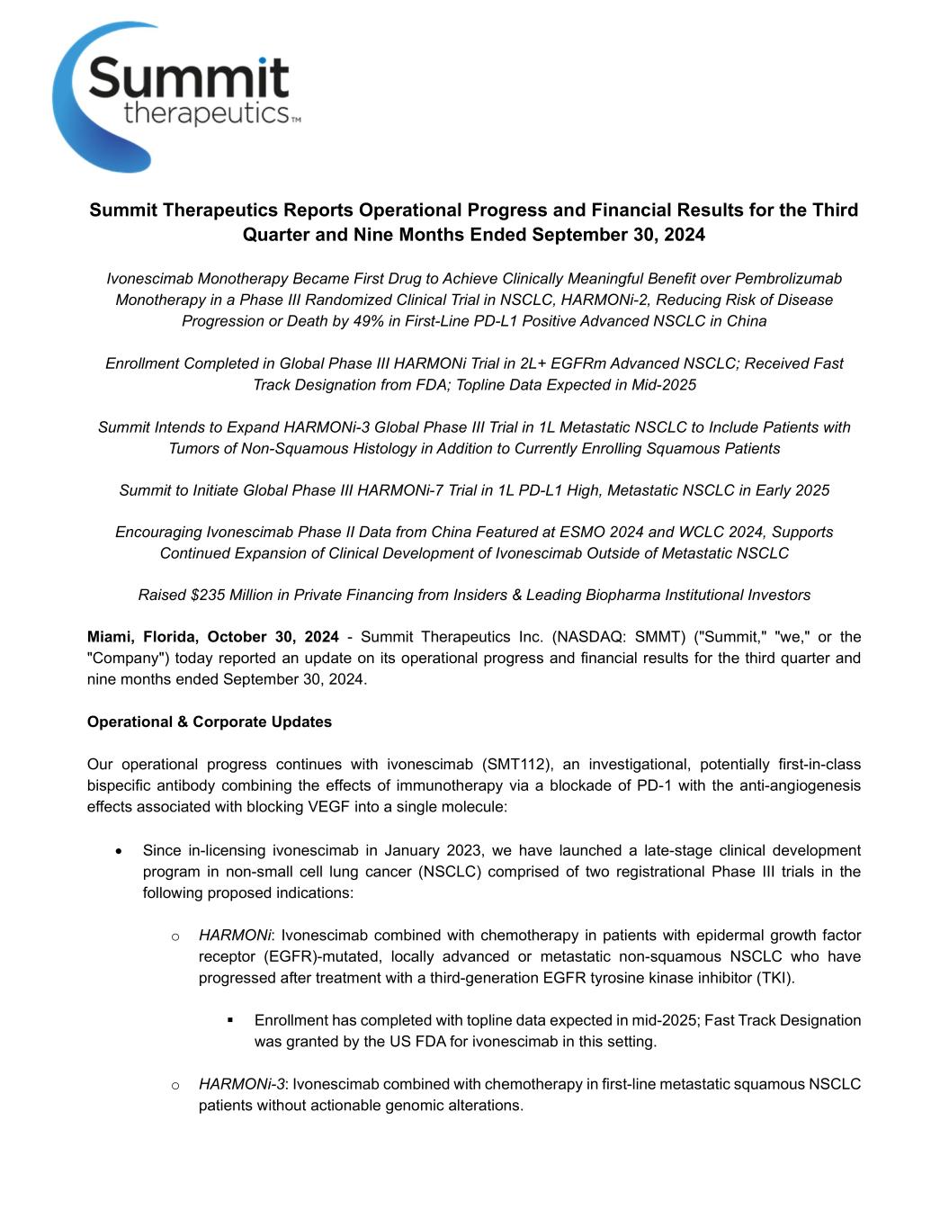 Summit Therapeutics Reports Operational Progress and Financial Results for the Third Quarter and Nine Months Ended September 30, 2024 Ivonescimab Monotherapy Became First Drug to Achieve Clinically Meaningful Benefit over Pembrolizumab Monotherapy in a Phase III Randomized Clinical Trial in NSCLC, HARMONi-2, Reducing Risk of Disease Progression or Death by 49% in First-Line PD-L1 Positive Advanced NSCLC in China Enrollment Completed in Global Phase III HARMONi Trial in 2L+ EGFRm Advanced NSCLC; Received Fast Track Designation from FDA; Topline Data Expected in Mid-2025 Summit Intends to Expand HARMONi-3 Global Phase III Trial in 1L Metastatic NSCLC to Include Patients with Tumors of Non-Squamous Histology in Addition to Currently Enrolling Squamous Patients Summit to Initiate Global Phase III HARMONi-7 Trial in 1L PD-L1 High, Metastatic NSCLC in Early 2025 Encouraging Ivonescimab Phase II Data from China Featured at ESMO 2024 and WCLC 2024, Supports Continued Expansion of Clinical Development of Ivonescimab Outside of Metastatic NSCLC Raised $235 Million in Private Financing from Insiders & Leading Biopharma Institutional Investors Miami, Florida, October 30, 2024 - Summit Therapeutics Inc. (NASDAQ: SMMT) ("Summit," "we," or the "Company") today reported an update on its operational progress and financial results for the third quarter and nine months ended September 30, 2024. Operational & Corporate Updates Our operational progress continues with ivonescimab (SMT112), an investigational, potentially first-in-class bispecific antibody combining the effects of immunotherapy via a blockade of PD-1 with the anti-angiogenesis effects associated with blocking VEGF into a single molecule:  Since in-licensing ivonescimab in January 2023, we have launched a late-stage clinical development program in non-small cell lung cancer (NSCLC) comprised of two registrational Phase III trials in the following proposed indications: o HARMONi: Ivonescimab combined with chemotherapy in patients with epidermal growth factor receptor (EGFR)-mutated, locally advanced or metastatic non-squamous NSCLC who have progressed after treatment with a third-generation EGFR tyrosine kinase inhibitor (TKI).  Enrollment has completed with topline data expected in mid-2025; Fast Track Designation was granted by the US FDA for ivonescimab in this setting. o HARMONi-3: Ivonescimab combined with chemotherapy in first-line metastatic squamous NSCLC patients without actionable genomic alterations.