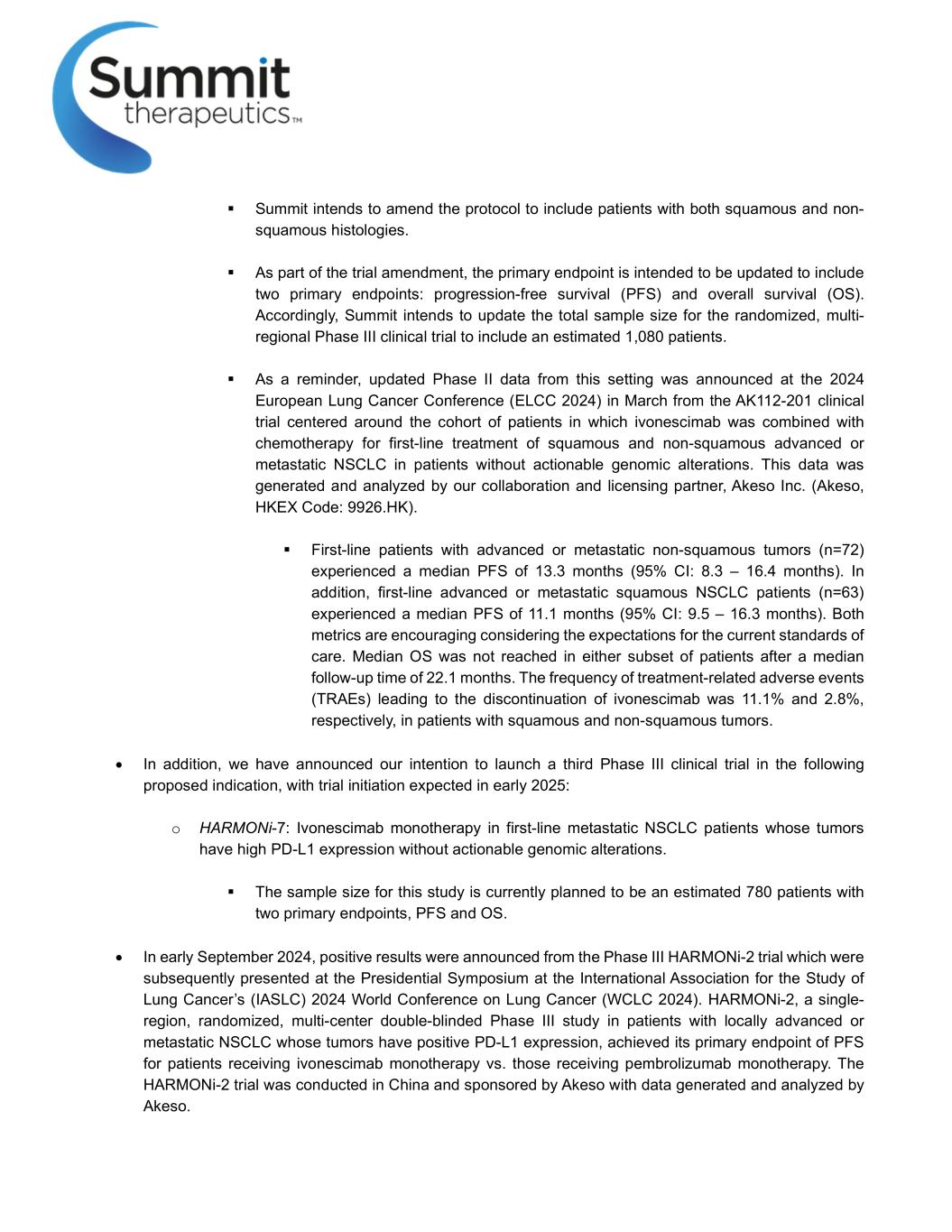  Summit intends to amend the protocol to include patients with both squamous and non- squamous histologies.  As part of the trial amendment, the primary endpoint is intended to be updated to include two primary endpoints: progression-free survival (PFS) and overall survival (OS). Accordingly, Summit intends to update the total sample size for the randomized, multi- regional Phase III clinical trial to include an estimated 1,080 patients.  As a reminder, updated Phase II data from this setting was announced at the 2024 European Lung Cancer Conference (ELCC 2024) in March from the AK112-201 clinical trial centered around the cohort of patients in which ivonescimab was combined with chemotherapy for first-line treatment of squamous and non-squamous advanced or metastatic NSCLC in patients without actionable genomic alterations. This data was generated and analyzed by our collaboration and licensing partner, Akeso Inc. (Akeso, HKEX Code: 9926.HK).  First-line patients with advanced or metastatic non-squamous tumors (n=72) experienced a median PFS of 13.3 months (95% CI: 8.3 – 16.4 months). In addition, first-line advanced or metastatic squamous NSCLC patients (n=63) experienced a median PFS of 11.1 months (95% CI: 9.5 – 16.3 months). Both metrics are encouraging considering the expectations for the current standards of care. Median OS was not reached in either subset of patients after a median follow-up time of 22.1 months. The frequency of treatment-related adverse events (TRAEs) leading to the discontinuation of ivonescimab was 11.1% and 2.8%, respectively, in patients with squamous and non-squamous tumors.  In addition, we have announced our intention to launch a third Phase III clinical trial in the following proposed indication, with trial initiation expected in early 2025: o HARMONi-7: Ivonescimab monotherapy in first-line metastatic NSCLC patients whose tumors have high PD-L1 expression without actionable genomic alterations.  The sample size for this study is currently planned to be an estimated 780 patients with two primary endpoints, PFS and OS.  In early September 2024, positive results were announced from the Phase III HARMONi-2 trial which were subsequently presented at the Presidential Symposium at the International Association for the Study of Lung Cancer’s (IASLC) 2024 World Conference on Lung Cancer (WCLC 2024). HARMONi-2, a single- region, randomized, multi-center double-blinded Phase III study in patients with locally advanced or metastatic NSCLC whose tumors have positive PD-L1 expression, achieved its primary endpoint of PFS for patients receiving ivonescimab monotherapy vs. those receiving pembrolizumab monotherapy. The HARMONi-2 trial was conducted in China and sponsored by Akeso with data generated and analyzed by Akeso.
