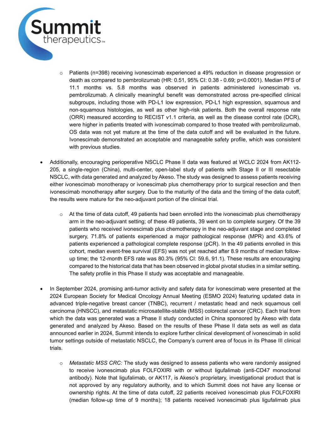 o Patients (n=398) receiving ivonescimab experienced a 49% reduction in disease progression or death as compared to pembrolizumab (HR: 0.51, 95% CI: 0.38 - 0.69; p<0.0001). Median PFS of 11.1 months vs. 5.8 months was observed in patients administered ivonescimab vs. pembrolizumab. A clinically meaningful benefit was demonstrated across pre-specified clinical subgroups, including those with PD-L1 low expression, PD-L1 high expression, squamous and non-squamous histologies, as well as other high-risk patients. Both the overall response rate (ORR) measured according to RECIST v1.1 criteria, as well as the disease control rate (DCR), were higher in patients treated with ivonescimab compared to those treated with pembrolizumab. OS data was not yet mature at the time of the data cutoff and will be evaluated in the future. Ivonescimab demonstrated an acceptable and manageable safety profile, which was consistent with previous studies.  Additionally, encouraging perioperative NSCLC Phase II data was featured at WCLC 2024 from AK112- 205, a single-region (China), multi-center, open-label study of patients with Stage II or III resectable NSCLC, with data generated and analyzed by Akeso. The study was designed to assess patients receiving either ivonescimab monotherapy or ivonescimab plus chemotherapy prior to surgical resection and then ivonescimab monotherapy after surgery. Due to the maturity of the data and the timing of the data cutoff, the results were mature for the neo-adjuvant portion of the clinical trial. o At the time of data cutoff, 49 patients had been enrolled into the ivonescimab plus chemotherapy arm in the neo-adjuvant setting; of these 49 patients, 39 went on to complete surgery. Of the 39 patients who received ivonescimab plus chemotherapy in the neo-adjuvant stage and completed surgery, 71.8% of patients experienced a major pathological response (MPR) and 43.6% of patients experienced a pathological complete response (pCR). In the 49 patients enrolled in this cohort, median event-free survival (EFS) was not yet reached after 8.9 months of median follow- up time; the 12-month EFS rate was 80.3% (95% CI: 59.6, 91.1). These results are encouraging compared to the historical data that has been observed in global pivotal studies in a similar setting. The safety profile in this Phase II study was acceptable and manageable.  In September 2024, promising anti-tumor activity and safety data for ivonescimab were presented at the 2024 European Society for Medical Oncology Annual Meeting (ESMO 2024) featuring updated data in advanced triple-negative breast cancer (TNBC), recurrent / metastatic head and neck squamous cell carcinoma (HNSCC), and metastatic microsatellite-stable (MSS) colorectal cancer (CRC). Each trial from which the data was generated was a Phase II study conducted in China sponsored by Akeso with data generated and analyzed by Akeso. Based on the results of these Phase II data sets as well as data announced earlier in 2024, Summit intends to explore further clinical development of ivonescimab in solid tumor settings outside of metastatic NSCLC, the Company’s current area of focus in its Phase III clinical trials. o Metastatic MSS CRC: The study was designed to assess patients who were randomly assigned to receive ivonescimab plus FOLFOXIRI with or without ligufalimab (anti-CD47 monoclonal antibody). Note that ligufalimab, or AK117, is Akeso’s proprietary, investigational product that is not approved by any regulatory authority, and to which Summit does not have any license or ownership rights. At the time of data cutoff, 22 patients received ivonescimab plus FOLFOXIRI (median follow-up time of 9 months); 18 patients received ivonescimab plus ligufalimab plus